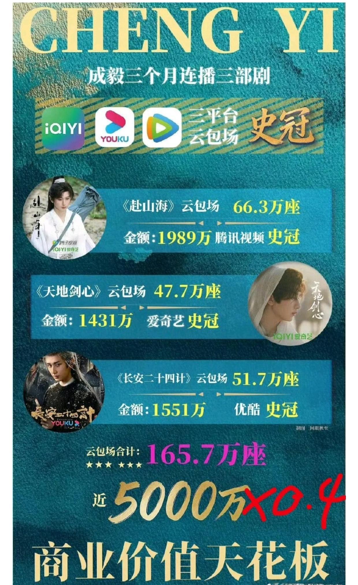 成毅三个月三部剧,包揽爱奇艺、腾讯、优酷云包场史冠!总包场座位165.7万座,金