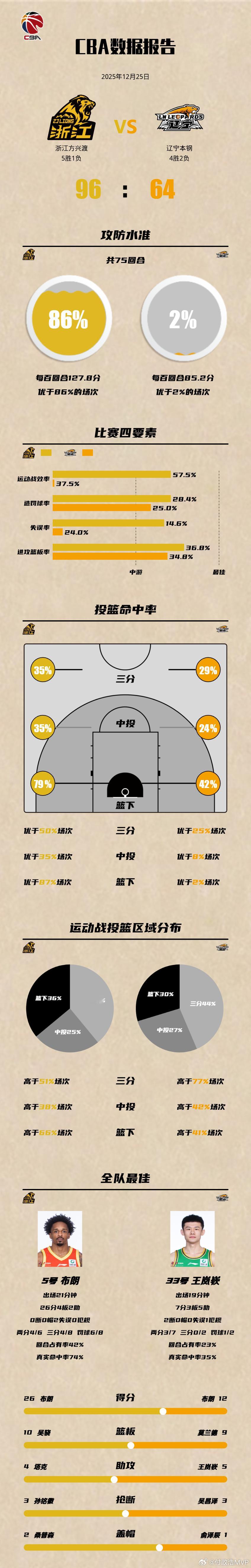 广厦男篮大胜辽宁男篮 浙江广厦96-64大胜辽篮,32分的分差也创造广厦队史对辽篮的最大净胜分纪录。犹记得,此前在第二轮比赛,广厦曾客场爆冷以79-95负于辽篮。那场比赛赛后,王博指导曾委婉地批评弟子,提醒他们“要打团队篮球,每个人都有可能发挥爆发,但也会遇到手感低迷的时候,希望这时不要搞英雄主义,要以团队为主。”今天很明显,浙江广厦要报客场输球的一箭之仇,全队从一开始就打得格外专注,防守强度十足。王博指导今晚赛后表示,球员从开局就比较投入,从防守做起,四节比赛中有三节都没让辽篮得分超过20分(备注:这三节辽篮得分分别只有17分、12分、13分)。辽篮将帅都表示无法匹配广厦的强度。其中,杨鸣赛后直言:“广厦是卫冕冠军,整体的成熟、默契,能力在我们之上。我们做好了所有的准备,但是还是无法适应强度,匹配不上。”莫兰德也表示:“上次在我们的主场赢了广厦,这场他们肯定会拼命。我们无法匹配广厦的强度,无论是篮板还是防守强度,他们都比我们更强硬。”
