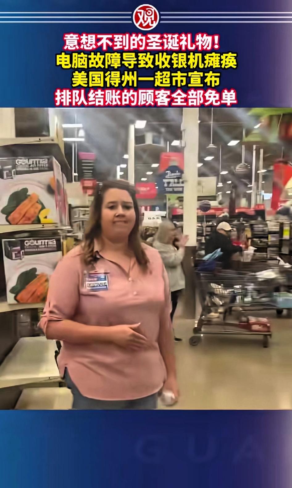 意想不到的圣诞礼物!电脑故障导致收银机器瘫痪,美国德州一超市宣布:排队结账的顾客全部免单。 据美媒12月23日报道,伯利森的这家超市系统故障,收银机全瘫痪了,结账队伍一动不动。 店长见计算机系统一时半会儿恢复不了,直接宣布,系统故障时已装满购物篮排队的顾客,商品全免单,还帮忙打包好。 一段店内视频里,顾客听到通知后纷纷鼓掌。大家带着省下预算满载而归。不过,故障后来的顾客就没这好运,被挡在店外。 这操作虽然让部分人遗憾,但对排队的顾客来说,绝对是个超惊喜的圣诞礼物!这家超市店长的权利不小呀,看来他们的管理更民主。 这家超市的这波操作,令人拍手叫好,消息发出来火爆全球。 国内的超市可以效仿此案例,一是这样的广告效应,比花几百万请人做广告效果更好。 如果哪个超市老板敢效仿一定更火爆。 就看国内的老板有没有这个魄力,效仿此案例了