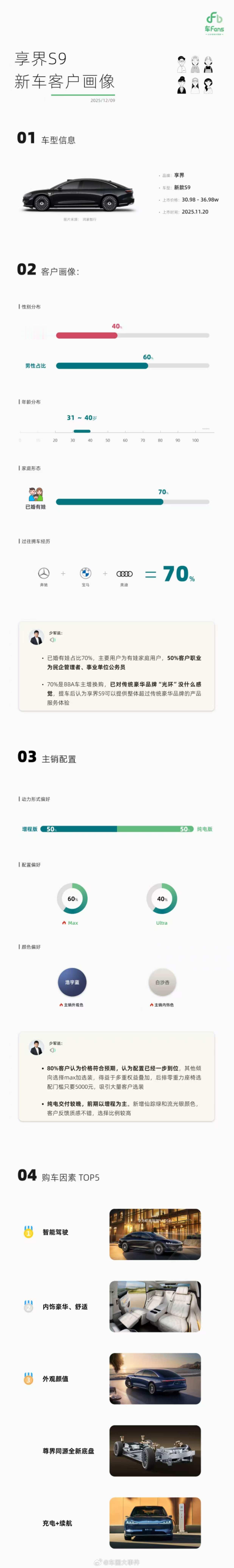 享界让豪华轿车市场四分天下 在用户需求日益多元的今天,单一车型难以覆盖高端出行的全场景。享界创新推出“轿旅双子星”战略:新款享界S9聚焦商务与日常豪华,S9T则主打旅行与生活探索。二者均基于华为顶级科技架构,标配36个高精度传感器、五档智能空气悬架、副驾零重力座椅及华为悦彰音响,却在设计语言与空间功能上形成互补。S9以寰宇美学诠释优雅格调,S9T则以旅行车形态融合SUV空间与轿车操控。这种“价值观分叉”战略,覆盖了传统豪华车主增换购的需求,同时,以智慧电动门、百万像素投影大灯等细节,赋予用户兼具仪式感与实用性的“情绪越级”体验。