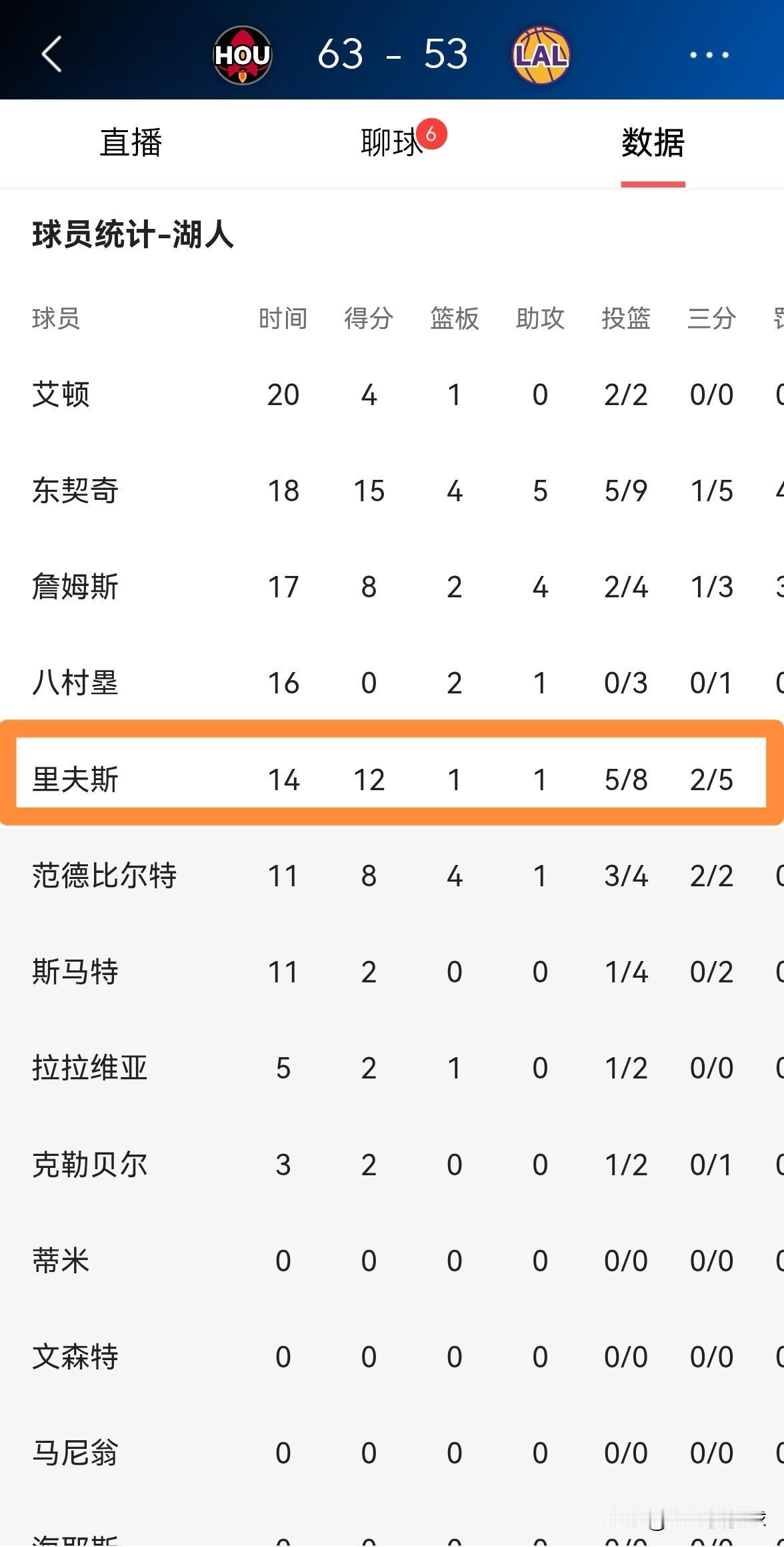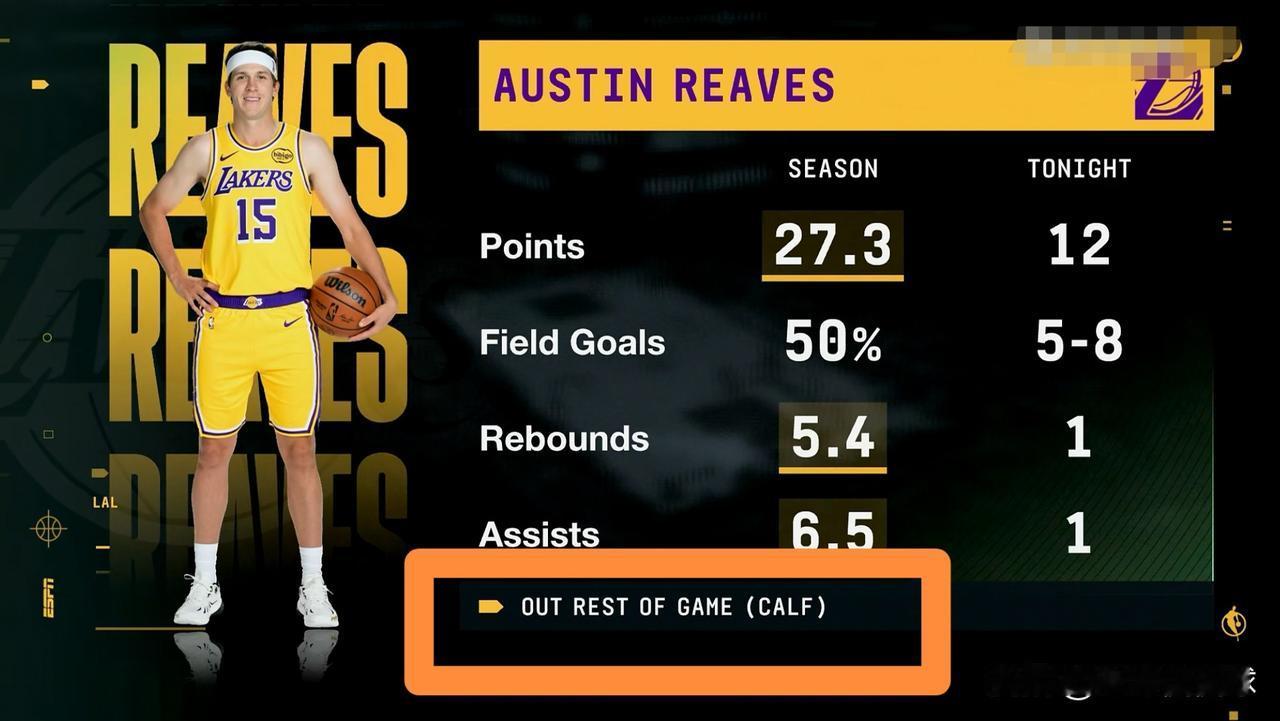 下面是一条关于湖人超级后卫里弗斯的坏消息!在今天进行的湖人和火箭的圣诞大战中,目前双方的第三节比赛正在进行中,刚刚湖人官方宣布,里弗斯因为左小腿酸痛,本场比赛不会回归。 值得一提的是,在里弗斯退赛之前,他只出战了上半场比赛,得到12分1篮板1助攻。 随着里弗斯的伤退,湖人无疑是雪上加霜,这样的话湖人想要击败火箭真是难如登天。