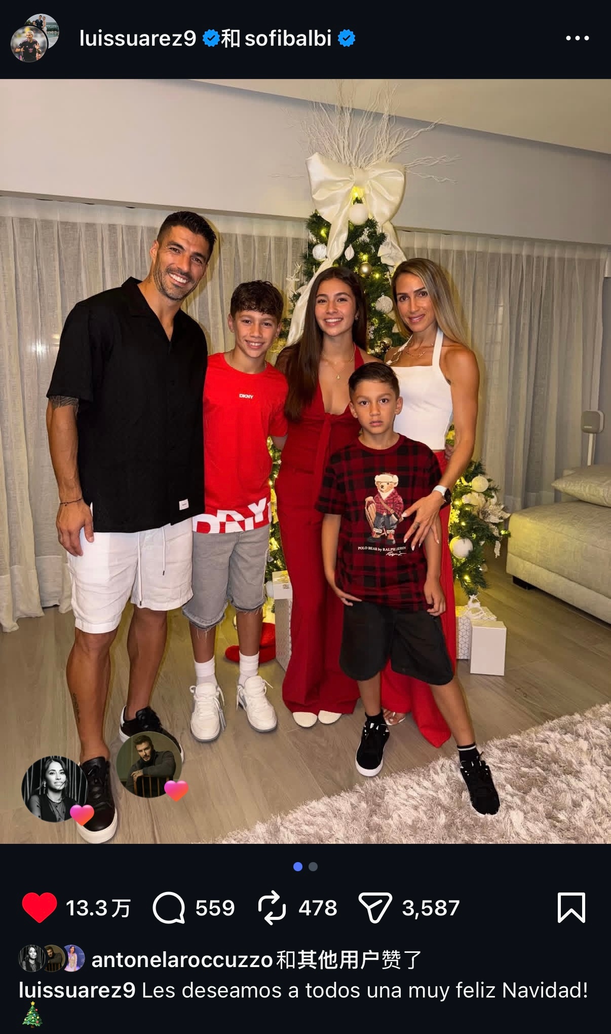 苏亚雷斯更新ins|祝大家圣诞快乐!🎄安妞和小法夫人丹妮埃拉点赞❤️迈阿密国际