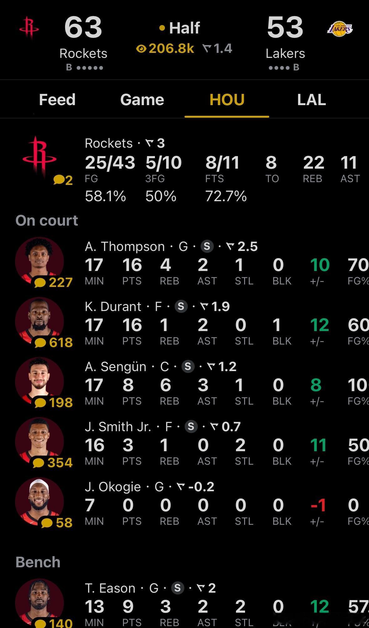 半场结束,火箭63比53领先湖人🔥▪️杜兰特、阿门各拿16分▪️申京8分6篮板▪️伊森首发9分3篮板2助攻2抢断🔥火箭vs湖人nba圣诞大战休斯顿火箭