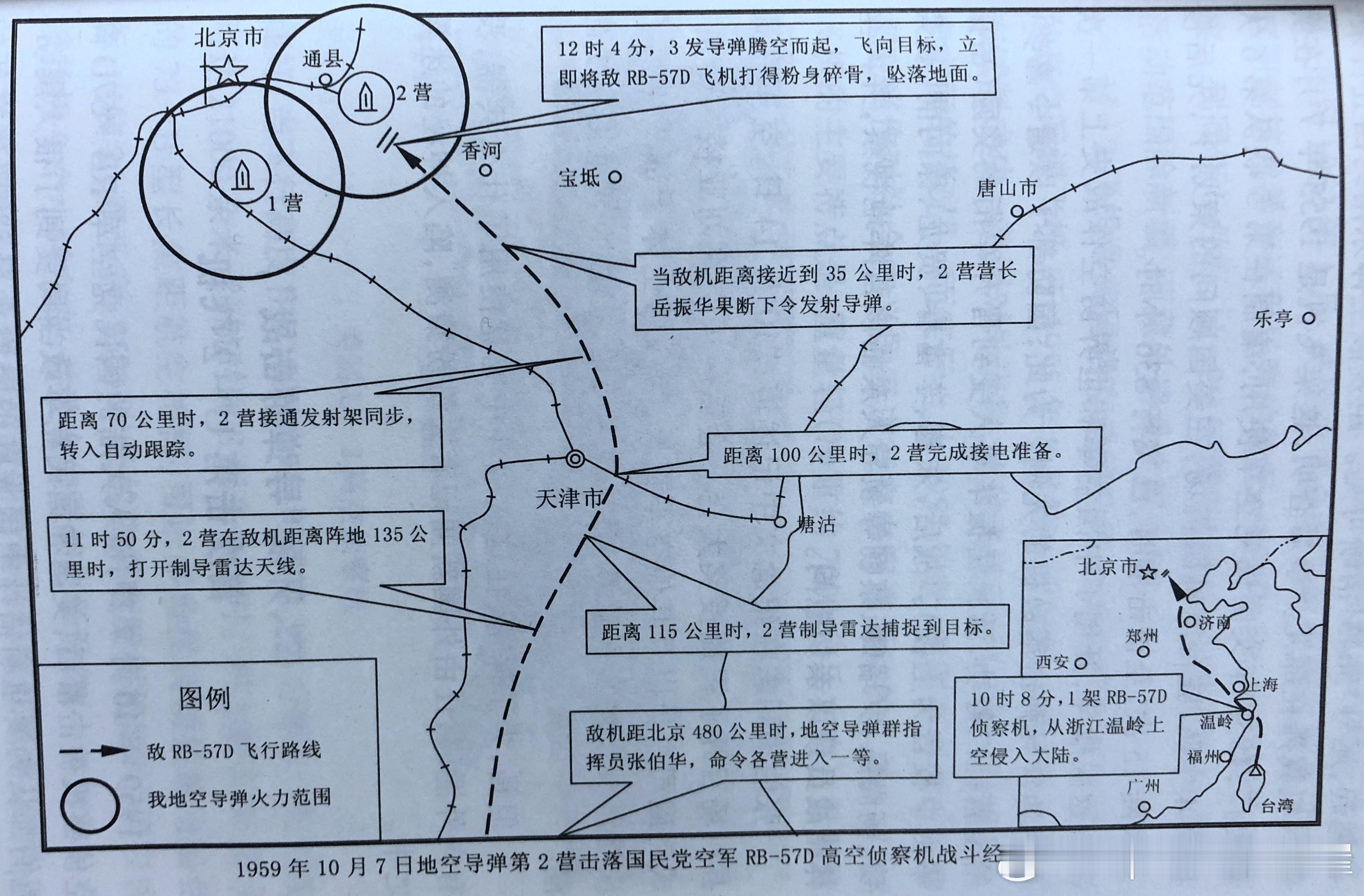 1959年10月7日地空导弹2营击落RB-57D高空侦察机战斗示意图。当日10时3分,台湾当局空军1架RB-57D型高空侦察机,从浙江温岭方向窜入大陆,高度18000~19500米,时速750千米,经杭州、南京、济南、天津直窜北京通县上空。空军航空兵部队先后起飞歼击机10批13架次拦截,其中3架开炮9次,因高度差大未获战果。11时40分,驻北京地区的地空导弹部队全部进入一等战备。11时50分,目标距离阵地135千米,地空导弹兵第2营制导雷达开机,距离115千米,发现目标。距离70千米,发射架同步转入自动跟踪。12时4分,目标距离阵地35千米,飞行高度17500米,速度230米/秒,航路捷径5千米。在营长岳振华指挥下,发射导弹3枚,击中目标,飞机坠于北京通县机场东南18千米处,上尉飞行员王英钦毙命。此战,中国人民解放军空军地空导弹部队首次参战即获战绩,开创世界防空史上用地空导弹击落飞机的先例。军事历史全触达
