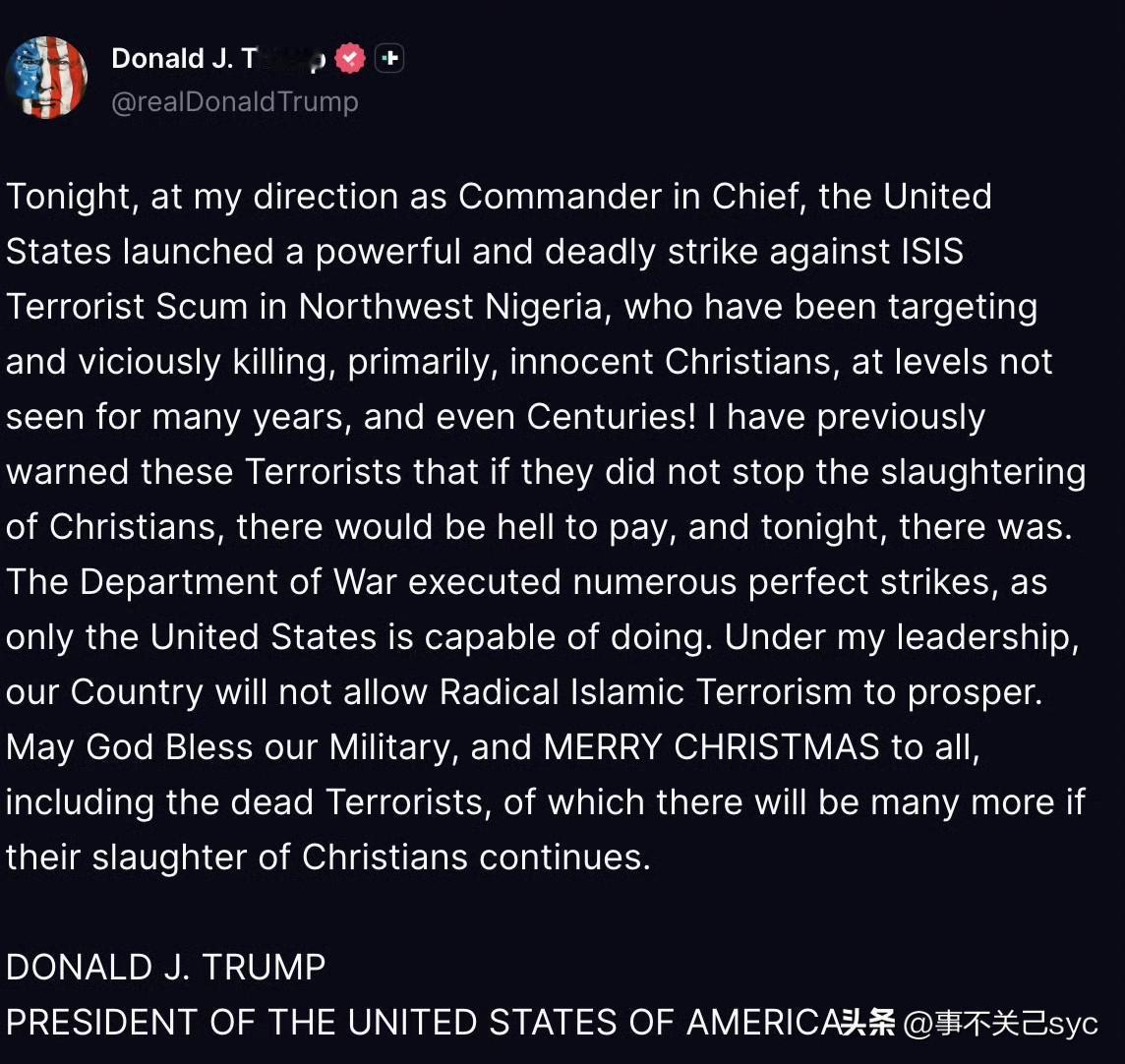 圣诞节当日,美国总统特朗普下令对盘踞在尼日利亚西北部的ISIS恐怖分子发动了打击。 他写道,“今晚,我以美国三军统帅的身份下令对尼日利亚西北部的ISIS恐怖分子发动了猛烈而致命的打击。 他称,“我此前已经明确警告过他们,如果不停止对基督徒的屠杀,必然要付出惨重代价。今晚,这个代价已经兑现。国防部实施了多次精准打击,这样的行动能力,只有美国才具备”。 他突出强调,“在我的领导下,我们的国家绝不会容许激进的伊斯兰恐怖主义滋生和坐大”。 这次军事行动并非孤立事件,而是特朗普政府对尼日利亚局势一系列动作的最新进展。 此次空袭是数月来紧张局势的顶点。早在2025年11月,特朗普就曾威胁,如果尼日利亚不制止针对基督徒的暴力,美国将采取军事行动。此外,美国近期还将尼日利亚列为“特别关注国”,并出台了针对相关人员的签证限制政策。 尽管美方将行动理由聚焦于“保护基督徒”,但地区专家和分析指出,尼日利亚的安全危机是多方面的。极端组织同时袭击基督徒和穆斯林,此外还有许多暴力冲突源于牧民与农民对资源的争夺、种族和社区间的紧张关系。 对于此次空袭,尼日利亚外交部的声明强调了行动是“应尼日利亚政府请求”,并基于“交换情报和战略协调”。尼日利亚总统在圣诞致辞中呼吁国内宗教和谐,但未直接提及空袭。 有分析认为,美国此次行动除公开的反恐理由外,背后可能还涉及对尼日利亚石油自主化进程和丰富稀土资源的地缘经济考量。 总而言之,这次空袭是特定时间(圣诞节)发生的、具有明确政治宣示意义的军事行动,但其根源在于美国对尼日利亚长期安全与宗教问题的不满,并可能产生复杂的后续影响