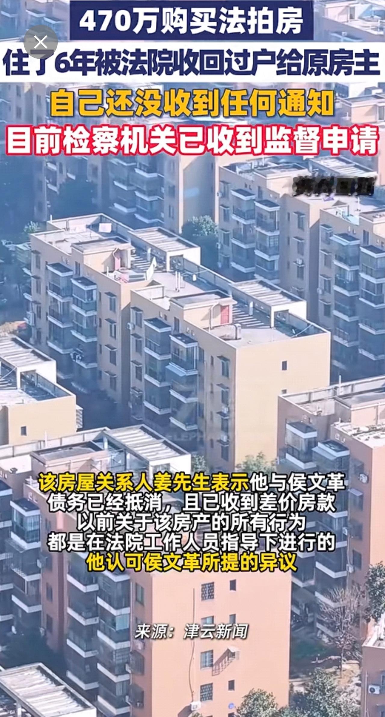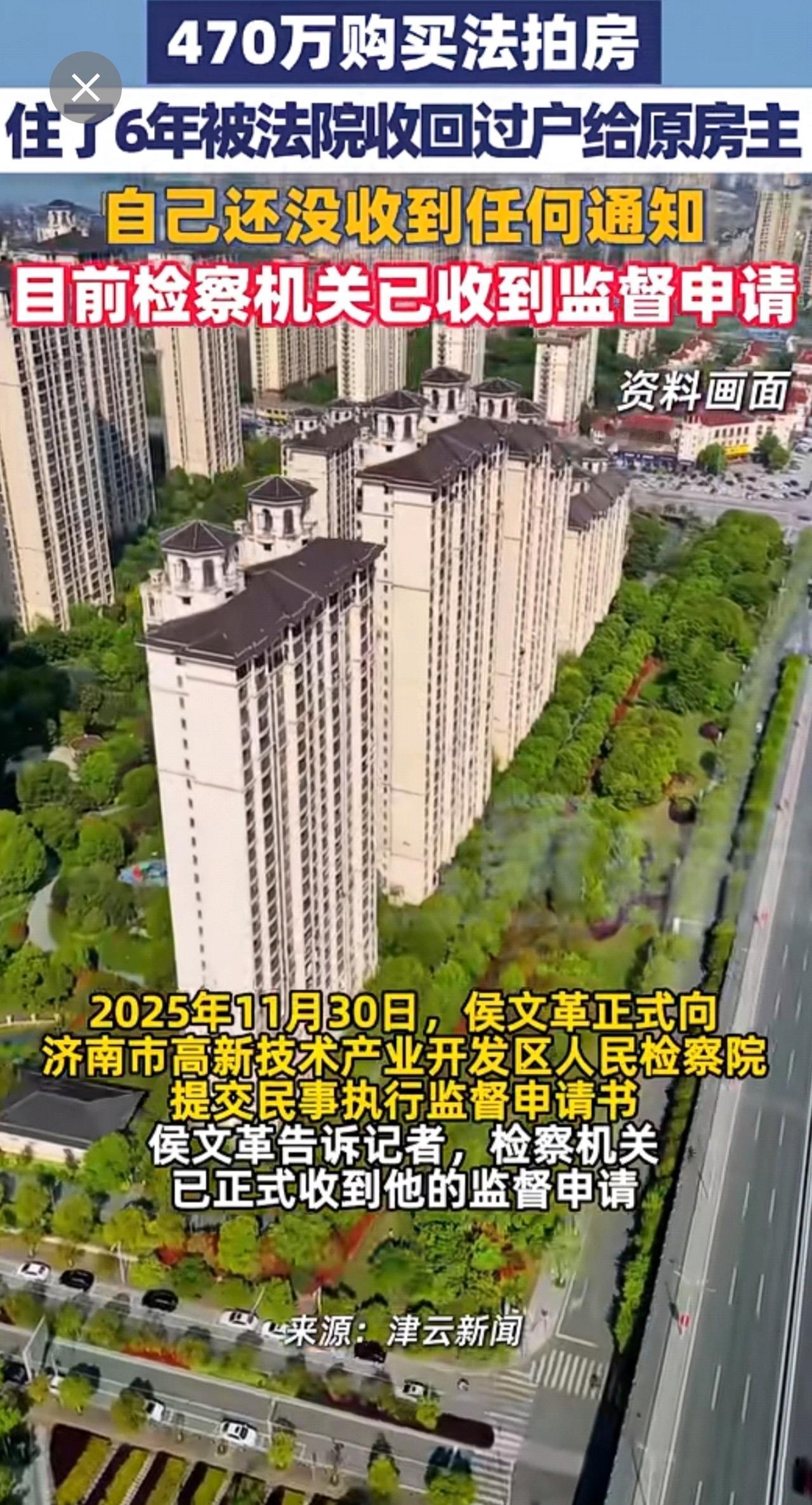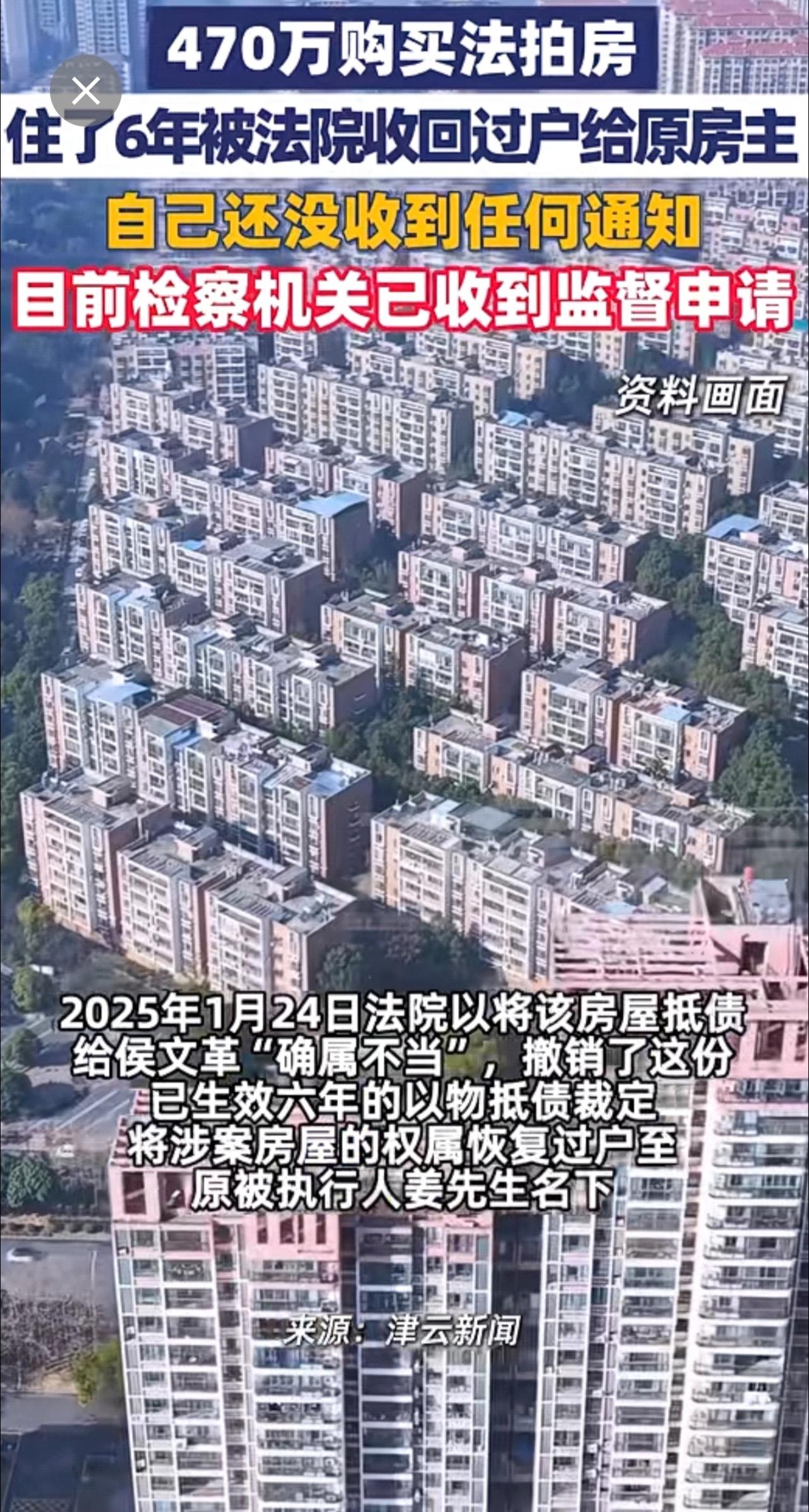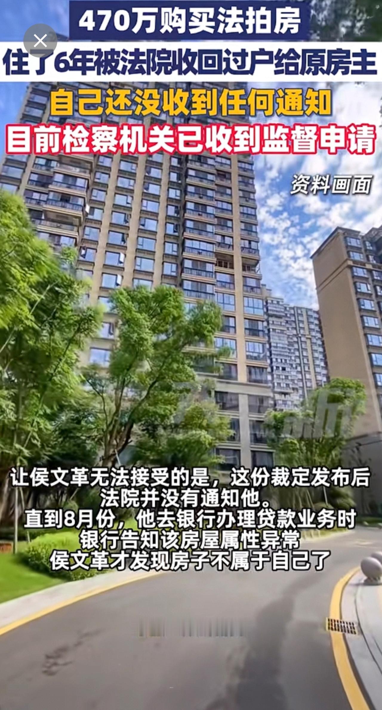12月25日报道,470万购买法拍房,住了6年被法院收回过户给原房主,自己还没收到任何通知,目前检察机关已收到监督申请。