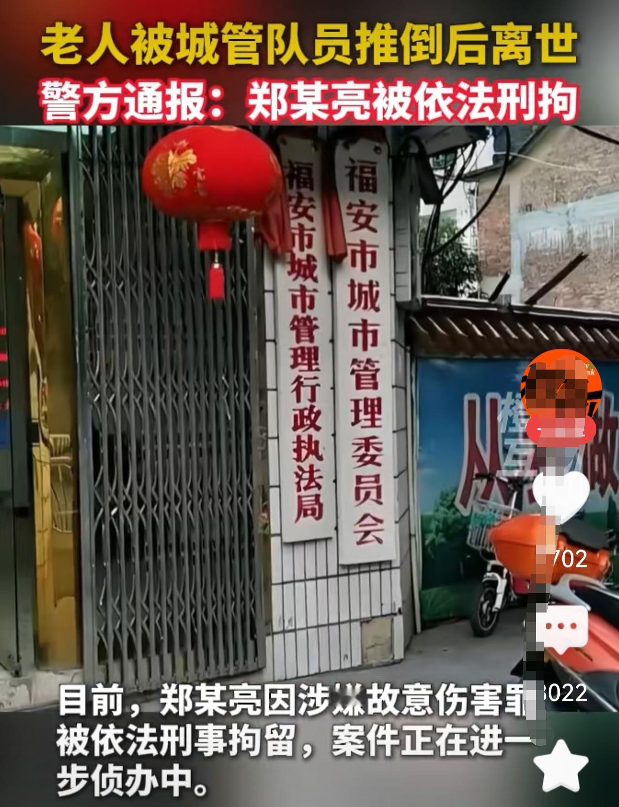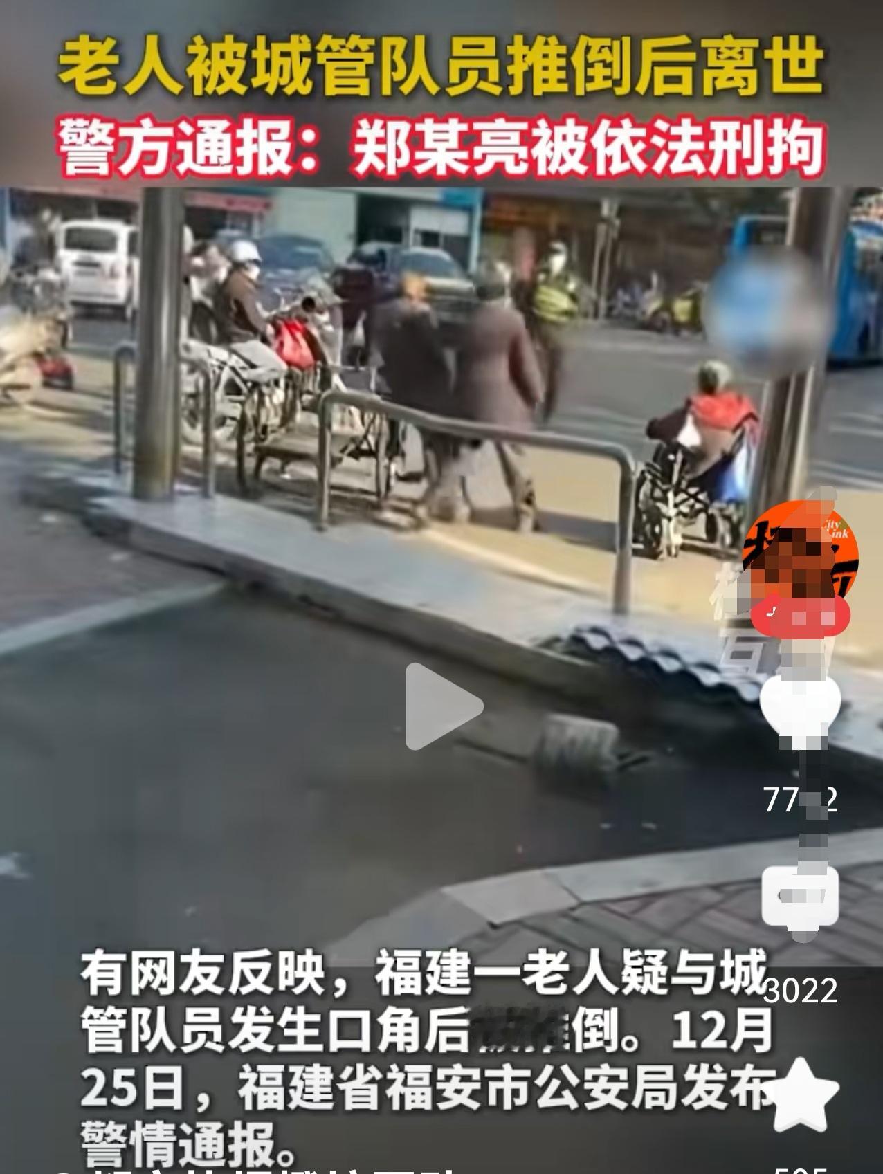 这个视频反复看了几遍,不知发生了多大事,这位城管要猛地推倒这位老人,就没想到后果? 据报道, 12月20日上午,在福建福安市阳头市场突然发生了这一幕:城管员郑某,在相隔几米远的地方突然冲过来,用身体猛推吴某,致使吴某倒地,看样子后脑勺重重撞地,吴某经送医抢救无效,于23日死亡。 很明显,城管员郑某要比吴某年轻许多,郑某冲过来的身体撞击力是很大的,即使年轻人不提防,也会被撞到,还别说一位年龄较大的老者。 郑某撞击吴某肯定是有原因的,但现在理由已经不那么重要了。因为郑某这一冲动行为,给他人造成了严重后果,也给自己带来了刑事责任,还严重地损害了福安市城管部门的形象,给单位带来了不良的社会影响。 不管郑某是城管岗位上的正式员工还是临时聘用人员,按说上岗前都要经过一段时间严格的岗前培训,懂得最基本的工作守则,掌握在工作中遇事与管理对象最基本的处理方法。 从发生的事情和最终造成的后果来看,郑某确实不适合在城管岗位上工作,也不是一名合格的城管工作人员。 城管人员处在城市管理第一线、最前沿,要与各种各样的人打交道,要处理的事情情节复杂且各不相同,既要处理得合规合法,又要合情合理,有适度的人情温暖,更不能激化矛盾,火上浇油。 因此上讲,城管工作不好干,但必须要有人去干。这就要求城管工作人员遇事要有一定的处理能力,而且还要有相当的自我控制能力,不能让情绪左右自己的行为。