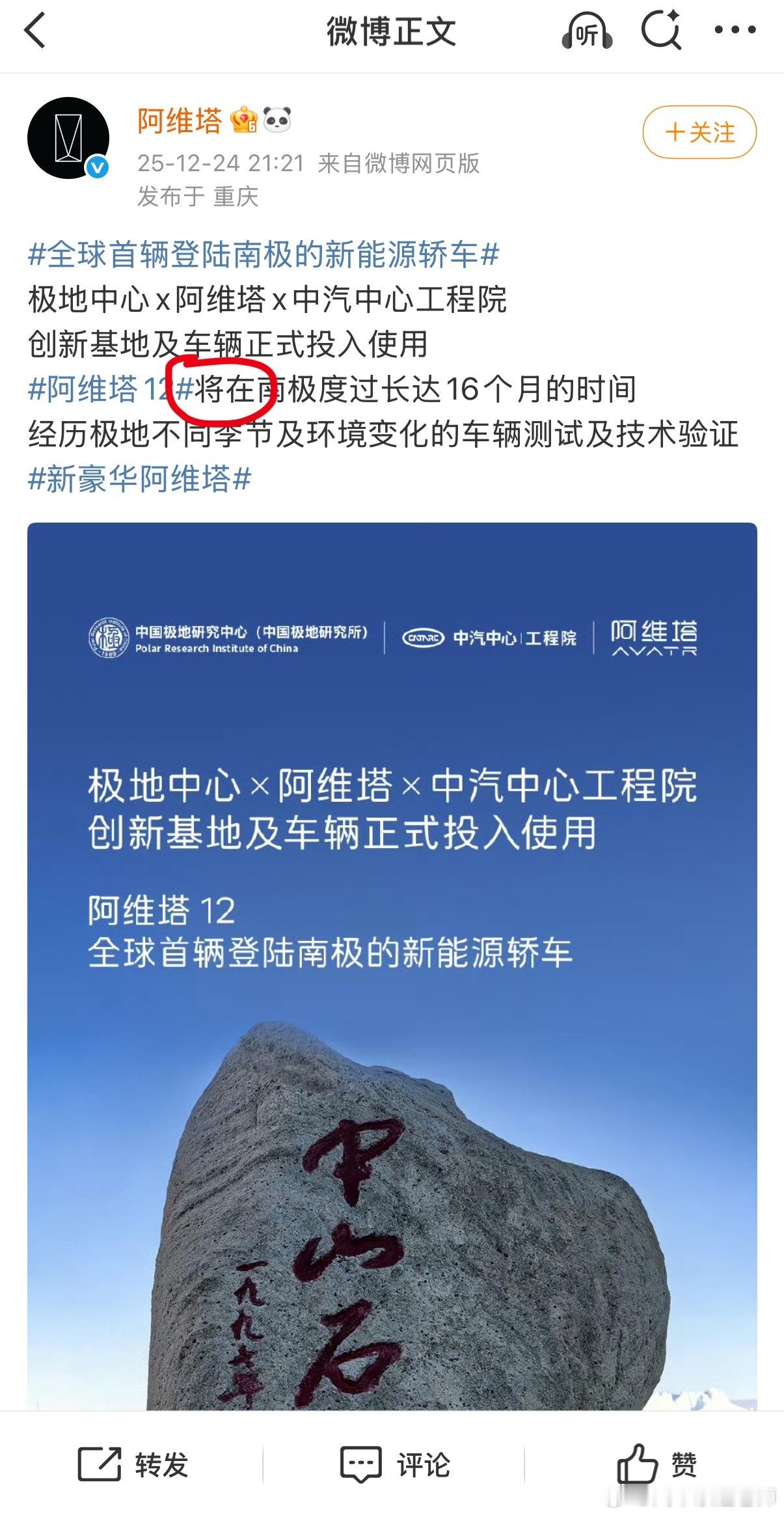 阿维塔又被网友打假了!继风阻系数事件之后,这次阿维塔因为宣传自家的车在南极完成“-50℃极寒测试”后,被网友反驳“现在南极正值夏季、中山站实测气温甚至比北京还暖和”。但昨晚阿维塔就发声明说这次去南极是“16个月跨季计划”,只是说车运到了,要做极寒测试,但是还没开始。这就说得过去了,早就该站出来了建议主机厂在宣传产品的时候,还是要注意方方面面,不要引人误解【极地测试这事,内行人可能都清楚高情商:16个月测试。低情商:赞助通勤车辆并且提供维保技师和司机】