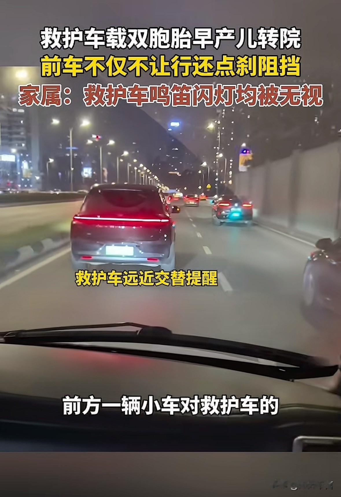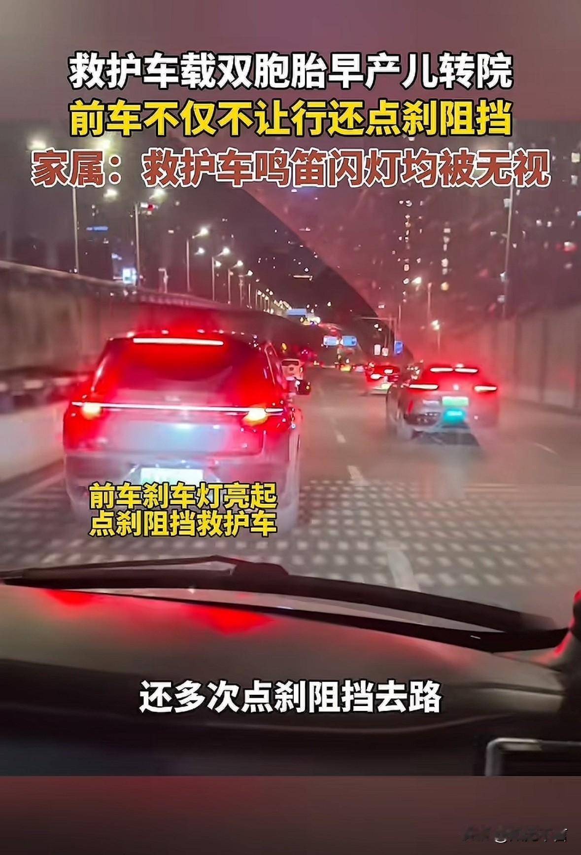 太可恶了!重庆一救护车载着早产双胞胎转院,谁知却被前方一辆车故意点刹不让行,而且还是多次点刹,车主行为引发网友强烈愤慨 有人说某类车主就是这样,把马路当成他家了,想怎么开就怎么开 我们不能对品牌攻击,但某类车主的确太没素质,前几天我在路上也遇到一辆,横冲直闯,就好像急着去投胎一样 早上那会车又多,真的很容易出交通事故,真不知道这种人是怎么想的,就算不顾自己,难道伤害了别人他就不愧疚吗 希望相关部门能好好管下这类车主,相关法规也得改改,这类危害他人生命财产的人就应该终身禁止上路 大家赞成吗?重庆