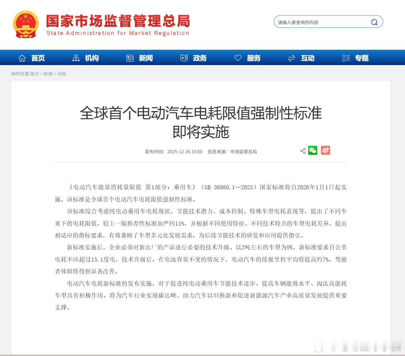 全球首个电动车电耗限值强制性标准要来了!2026 年 1 月 1 日起,全球首个电动车电耗强制标准 GB 36980.1—2025 正式实施。新标准加严约 11% 电耗限值,不同车重车型对应不同指标,像 2 吨左右车型百公里电耗不能超 15.1 度,电池不变续航还能涨约 7%。划重点!达标才能进购置税减半目录,不达标就得按 10% 全额缴税,新能源车主和准车主可以多留意了。明年实施电车电耗限值新规新能源汽车