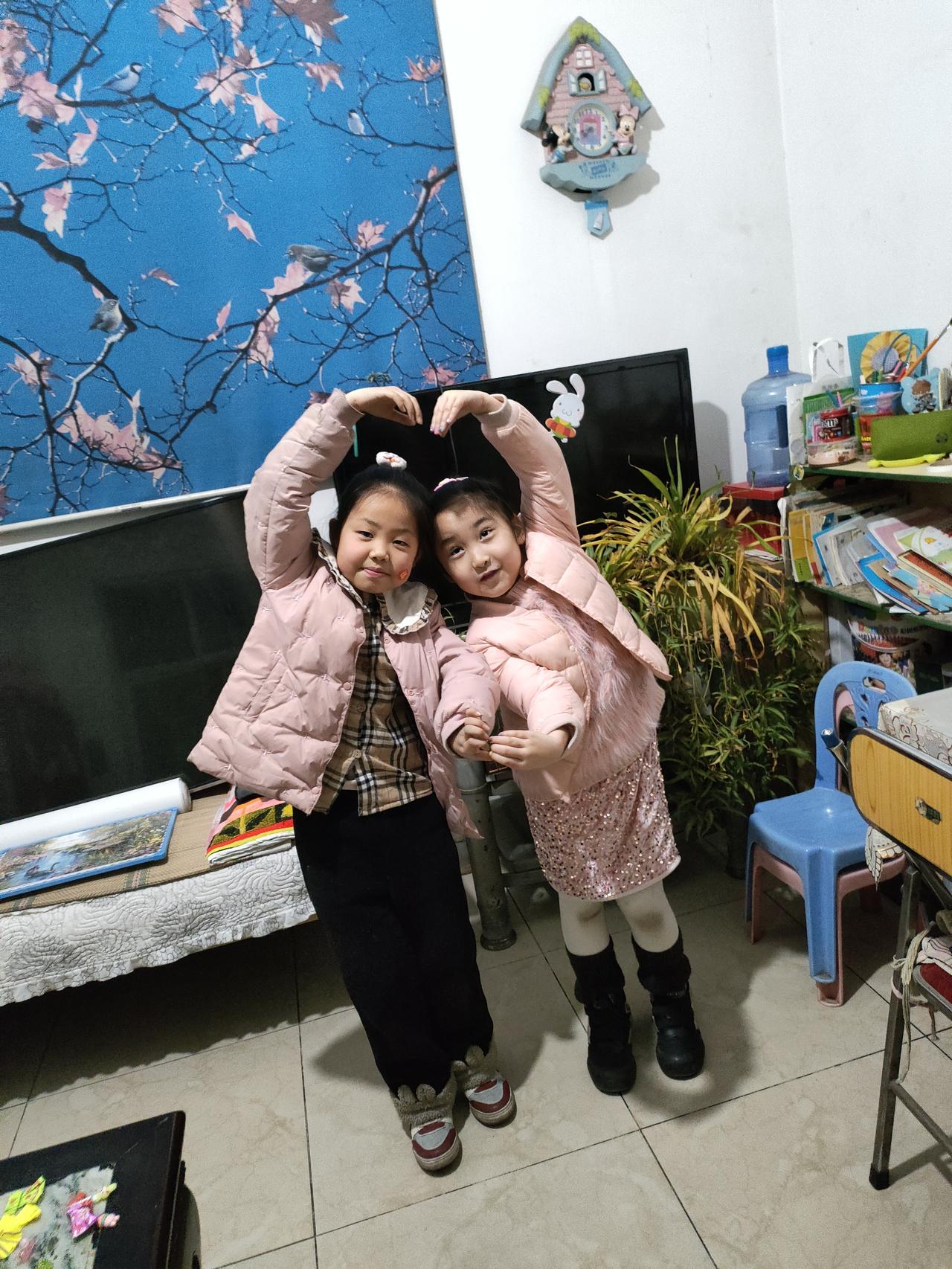 ✨墙上的画是蓝天与花树的私语,而她们举起的手臂,是把此刻的亲昵与雀跃,都酿成了温柔的小童话。 🌸屋内的绿植与摆件静静立着,两个穿粉衣的身影比出心形,像从生活里撷取了一抹最甜的、治愈的光。