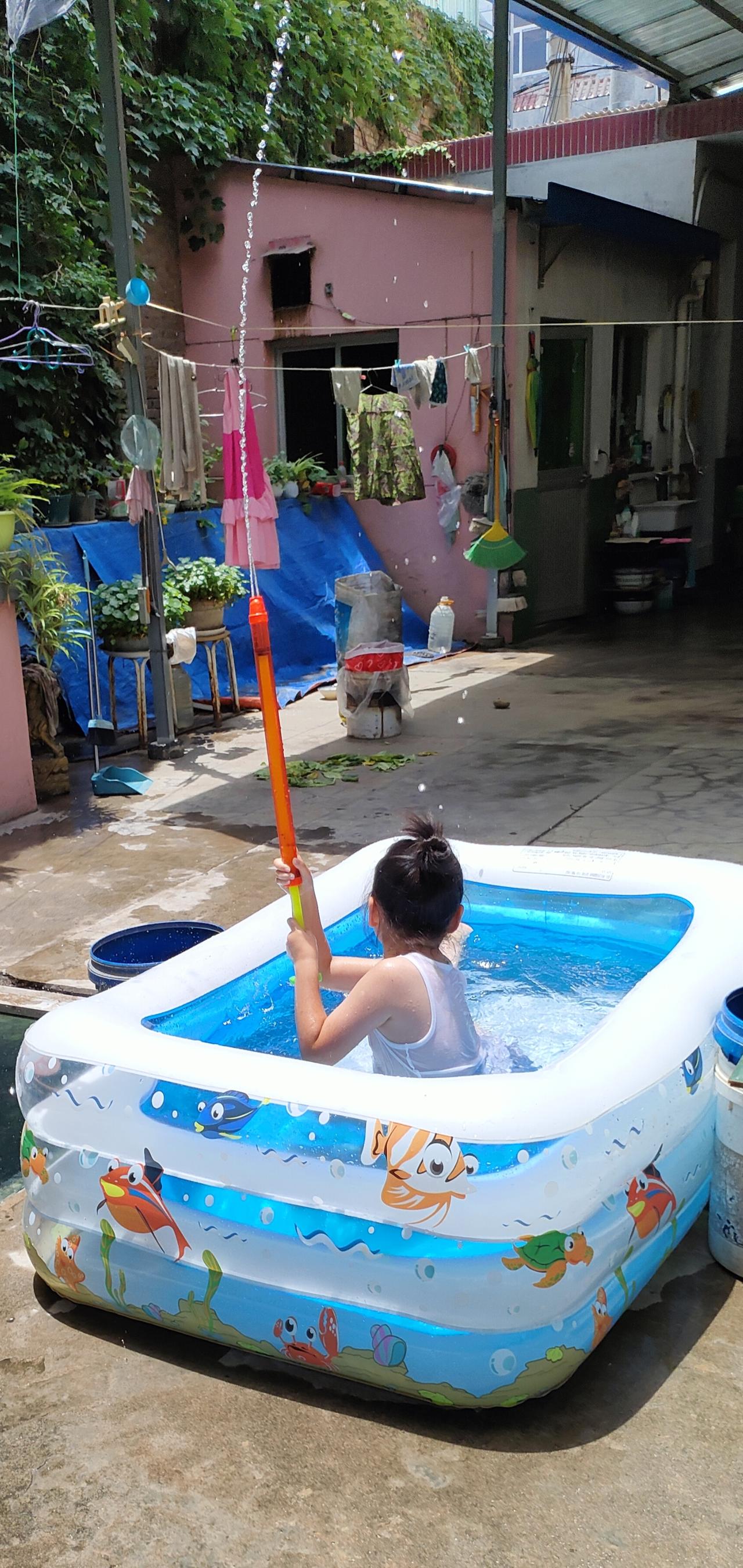 🌸藤蔓爬满粉墙,晾衣绳垂着生活的碎片,而充气泳池里,是孩童把整个夏日都揉进了水花里。 💦小院被日光晒得暖烘烘,充气泳池像从童话里游来的蓝贝壳,盛着孩子与水花嬉闹的、治愈的光阴。