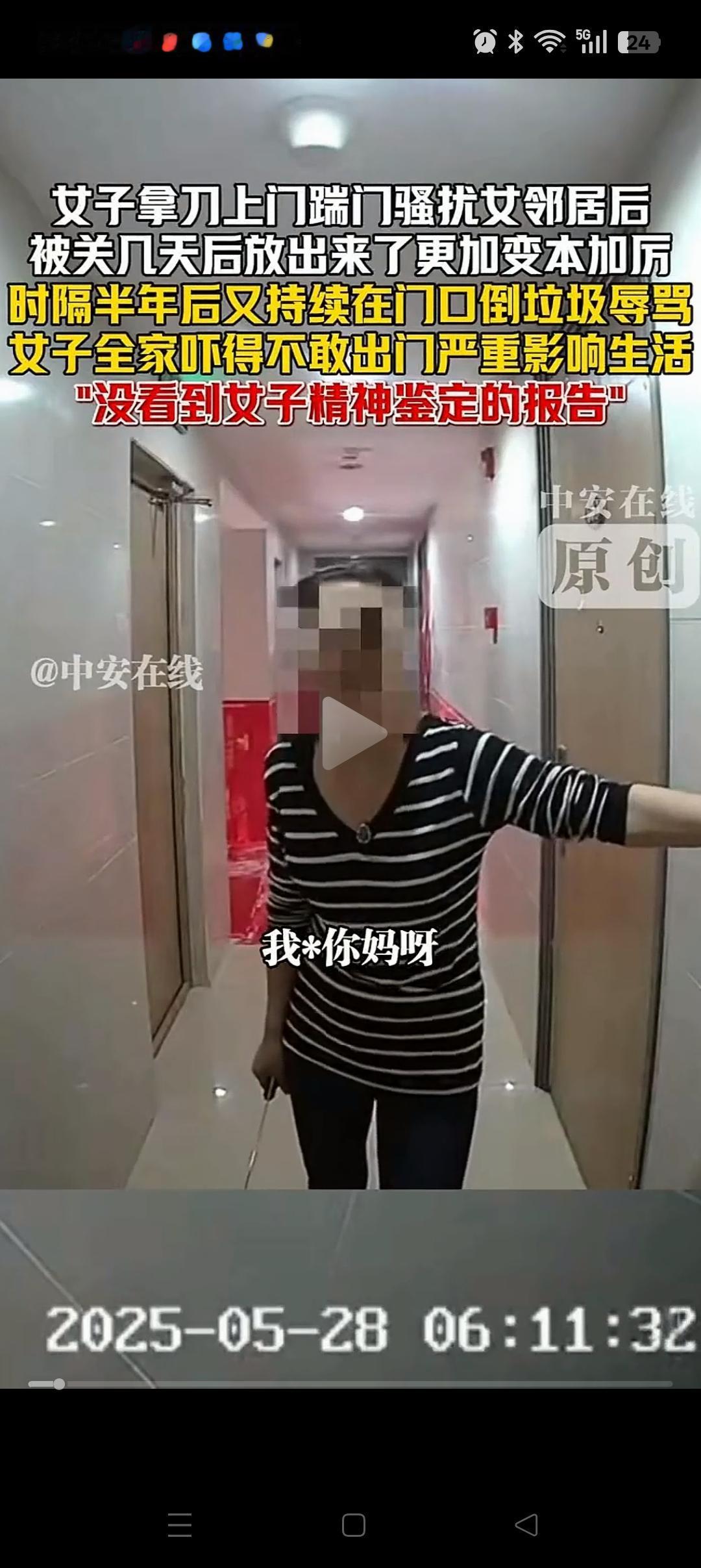 辽宁一女子晚上睡觉,突然听到有人砸门,她以为是邻居喝醉了,结果打开监控一看,居然是女邻居用菜刀在砍门,嘴里还说着****。 虽然女邻居求助了帽子叔叔,对方也被抓紧去关了几天。但是女邻居回来后依然我行我素,不停的往她家门口倒垃圾,还说着脏话。 帽子叔叔的意思是尽量不要和她发生冲突,因为她可能有精神类的疾病,目前没有更好的解决办法。 对于女邻居提到的噪音,辐射,她表示根本没有,自己睡觉很早,都是她自己想出来的。 虽然很多网友也提到了很多方法,比如换铁门,养狗,喷辣椒水等等。 但是个人觉得还是暂时搬离这里为好,可能的话尽快卖掉吧,多一事不如少一事,真不好处理[祈祷][祈祷]