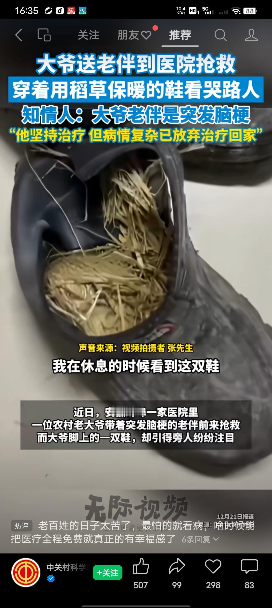 这或许就是老人有退休金和没有退休金的区别吧! 近日,安徽蚌埠一家医院里,一位农村大爷陪带着突发脑梗的老伴来抢救,而大爷脚上的一双鞋纷纷让众人瞩目。 姥爷的说他的帕金森已经50多年了,总是不由自主的抖,他老伴是脑血栓脑梗死,老人一直要坚持治疗,最后还是因为病情太复杂,最后决定放弃治疗回家了。 也许这就是有退休金跟没有退休金的区别吧!老人脚上穿着一双靠稻草取暖的鞋子,大冬天的呀,农民难,上了年纪的农民更难,得了病的老年农民更是难上加难。 是啊没有办法,农民都是靠地里的收入养活了一家人,可无论你怎么努力一亩地能给你长出多少价值呢?农村的老人一个月也就100多块钱的养老金,这100块钱的养老金吃药也就刚刚好。 可人吃五谷杂粮哪能不得病呢?头疼,感冒的还好,一旦有个大病,只能等着,哪个人不想活着?可有时候就是没有权利活着,这样吧!谁能有逆天改命的本事呢!
