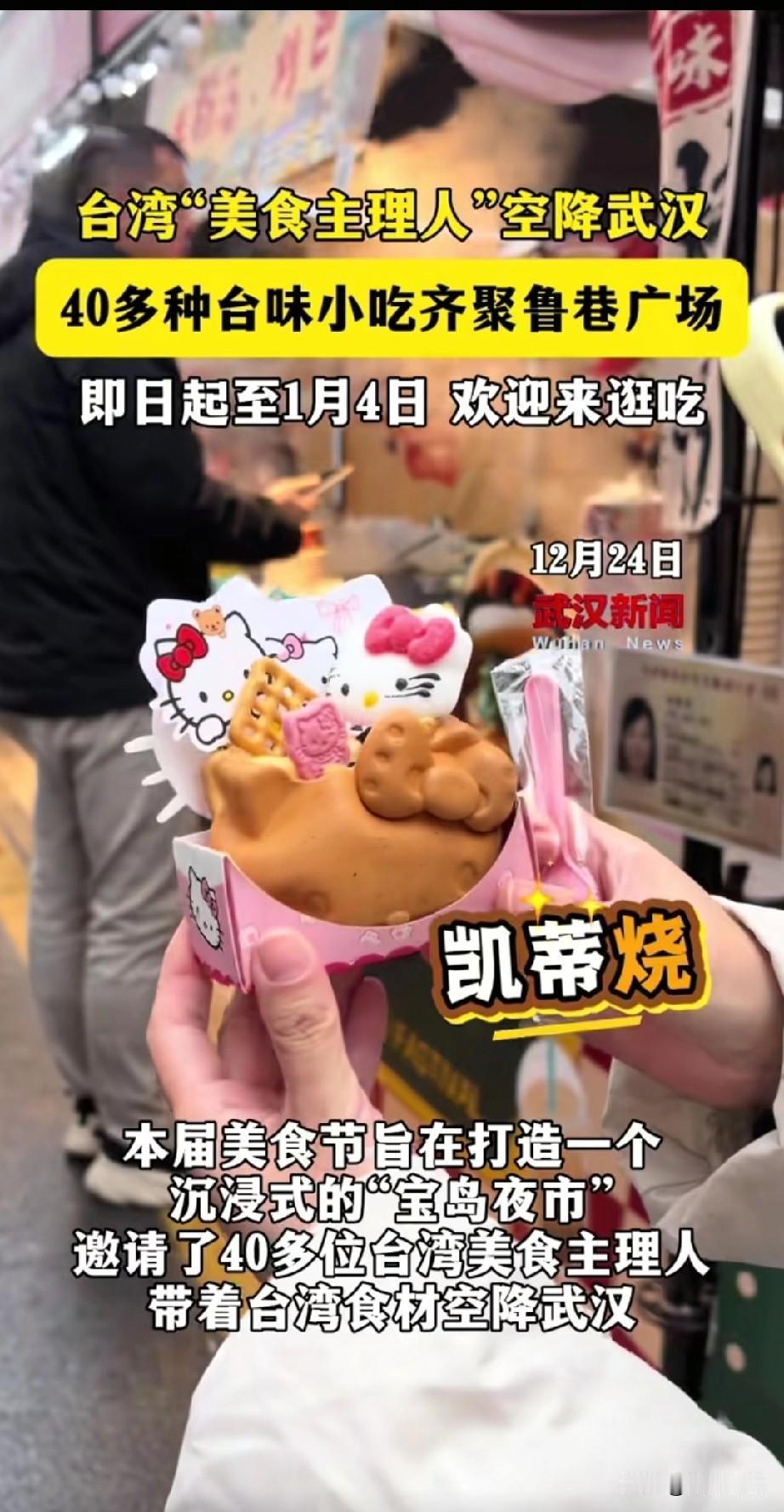 管你信不信, 这些台式美味将成为2026武汉的爆款, 武汉的小吃非常的多, 但是台湾的美食这次空降武汉, 给武汉的美食文化又添上浓墨重彩的一笔,40多位台湾美食主理人空降武汉, 只为打造这一场美食盛宴, 相信很多东西大家都没吃过, 都可以去尝试一下, 比如这个凯蒂烧, 绝对是拍照打卡的爆品, 另外的阿里山阿萨姆奶茶, 看着就非常的精致, 尤其是人家的搭配, 绝对可以算是网红新品, 再加上地道的台中榴莲饼, 榴莲的香味扑鼻而来, 让你忍不住的流口水, 没有吃过台湾美食的朋友们, 可以去武汉尝一尝, 这次的武汉小吃, 又要增加几个新品种, 带着朋友一起逛逛街, 一起尝尝台湾的小吃, 也是一件快乐的事, 大家有没有吃过武汉的台式小吃?