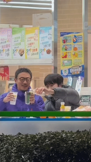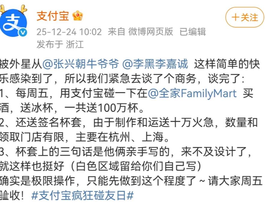 张兴朝李嘉诚这对外星从活宝,真的是太搞笑了舞台上是专戳对方笑点的吐槽役冤种搭档,私下直接溜去便利店玩调酒看到他们俩的那几个动图真的太可爱了,我反复看了很多很多遍,就是那种简单的快乐,像两个孩子一样,特别感染人而且这个视频,是这个月路人偶遇拍到的还因为便利店这个视频,所以紧急谈了一个商务这两人主打一个深夜冰杯 + 饮料乱炖的快乐!李嘉诚随手一抛冰杯,张兴朝跟装了雷达似的稳稳接住 —— 就问这默契,是不是焊死在一块儿了!只要你在身边,就算是便利店的白开水,都能玩出鸡尾酒派对的架势!更绝的是张兴朝还特意发博凑热闹,眼尖网友直接锁定便利店是全家,齐刷刷艾特官博这不官方也火速回应了,周五用支付宝碰一下在便利店购买指定酒款,网友就有概率获得外星从同款冰杯!部分全家门店,还有外星从手写杯套可以领,这么好的事情,我可必须要捧捧场子便利店调酒怎么又火了