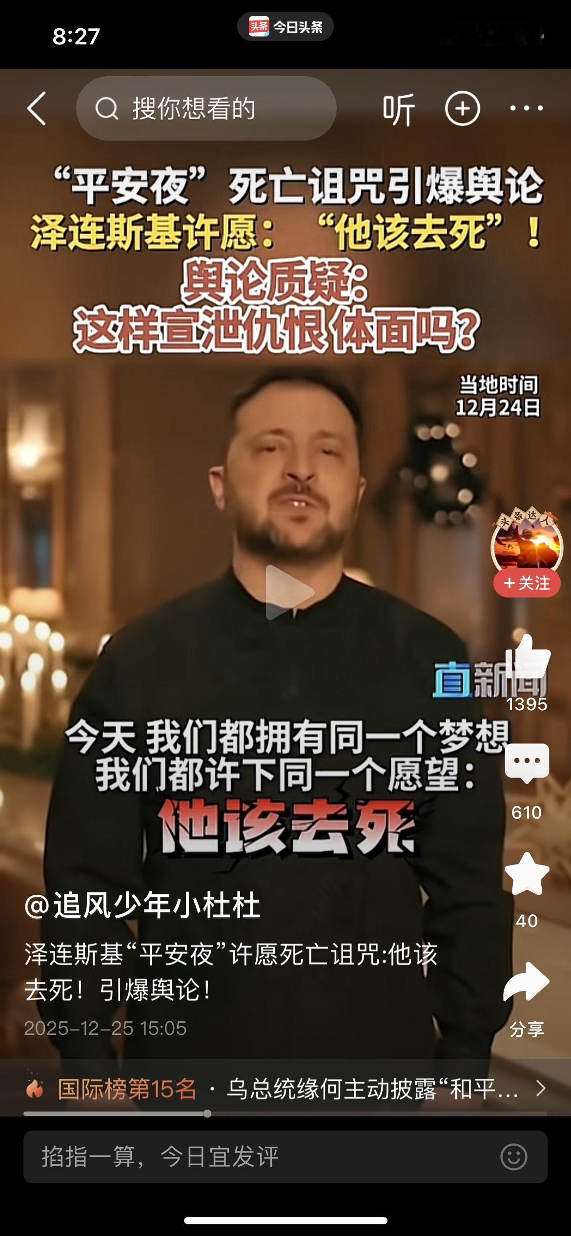 克宫拒绝了美乌联合提出的20点和平方案。 这个20点和平方案,乌克兰虽然作出了很大的让步,但与俄罗斯要求的相差甚远。 关键是没有承认俄占领土归俄罗斯所有。 俄罗斯认为自己有实力,还能打。 俄罗斯领导也信誓旦旦的说:要实现特别军事行动要达到的所有目标。 特朗普也是急了,想要尽快实现停火。 司机在平安夜发布讲话:我们许下一个共同的心愿:有人该去死。 他怎么会死呢?人家一见钟情,正在如胶似漆,轰轰烈烈的谈恋爱呢。 情场得意,赌场失意。 乌军三个旅,在库皮扬斯克打穿俄军两个军,占领库皮扬斯克市中心。 这打的真是神仙仗。