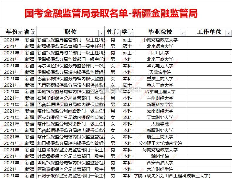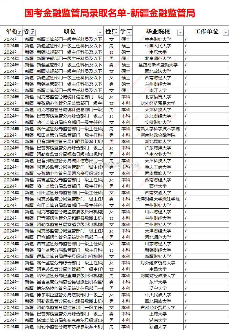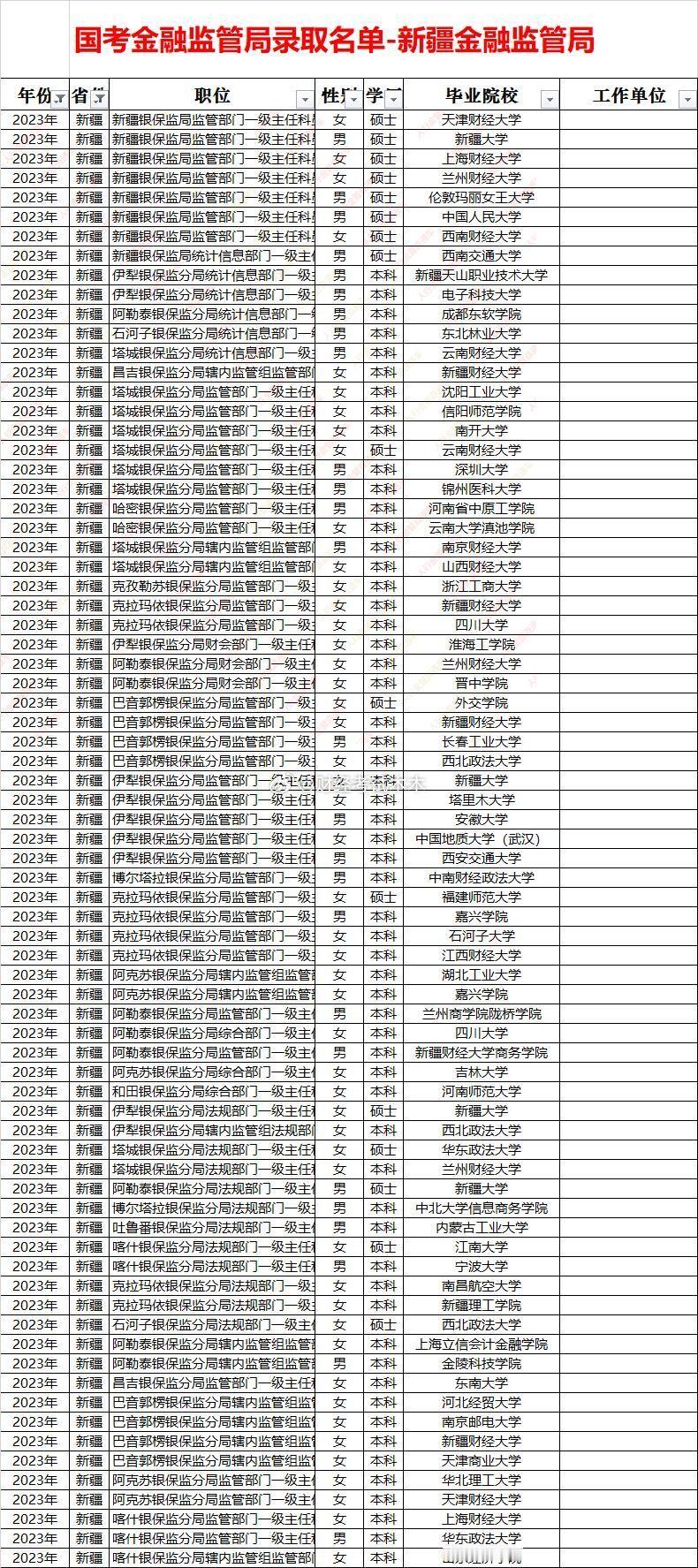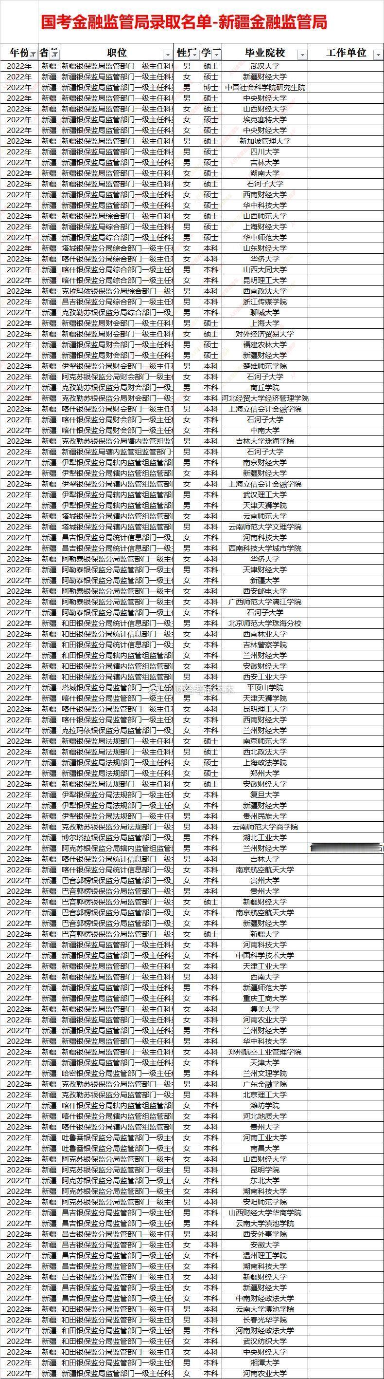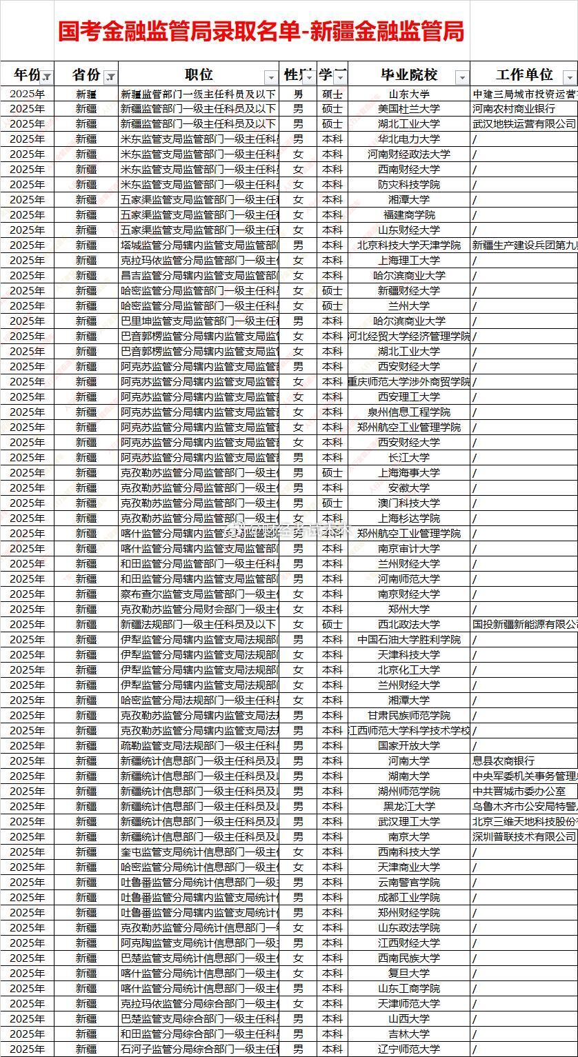 国考金管局新疆监管局录取名单解析 面试入围分数线一、招录规模与结构总量:五年累计录取约 310 人,年均 62 人;2025 年峰值 80+,县域监管支局占比由 40% 升至 63%,为西北最高。性别:男女≈1∶1.1,女性略多;财会、法规岗女性占比>70%。学历:硕士占比由 38%(2021)升至 65%(2025),海归不足 5%;县域组仍以疆内本科为主。二、高校层次区内核心:新疆财经大学、新疆大学、石河子大学——贡献约 50% 生源。区外名校:人大、南开、中财、中南财、伦敦玛丽女王等硕士主攻自治区局及乌昌分局。县域组:70% 为区内公办本科(新财、新大、塔里木),硕士比例北疆沿天山>南疆中心>边陲县”四级价差 8-12 分。乌鲁木齐、克拉玛依、昌吉:所有岗位 55+;喀什、伊犁、石河子:50-58;阿克苏、和田、塔城:47-53;克州、阿勒泰边境县:45-50,为西北最低“洼地”。新设监管组(阿克陶、巴里坤、疏勒)首年比老局低 6-10 分,形成“低分窗口”。五、趋势硕士化提速:自治区局 2025 年硕士占比>88%,区外“双一流”已成主流。县域扩招:2024-2025 年新增支局 30+,计算机、综合岗分数线不升反降,仍是“低分上岸”主线。财会岗升温:受 CPA 需求拉动,2025 年出现全区最高 66.0(乌鲁木齐),热度持续但分差缩小,区内一本会计专业即可冲刺。法律岗平稳:法考门槛过滤竞争者,自治区局高分、县局温和,适合“有证选手”保底。财经岗固化:自治区局 60+ 成常态,乌昌片区 58+ 区间短期难降,高分考生唯一“红海”。