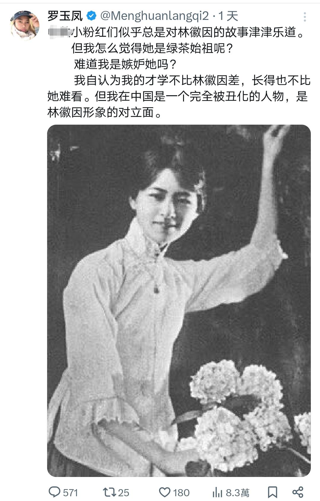 这就是民国剧惹出来的祸! 谁年轻时还没谈过恋爱,遇到个渣男谈个恋爱及时止损了,明明就是一个非常决绝的女性,既不恋爱脑,也不白莲花,竟然被凤姐说成绿茶,还跟林徽因比品貌才情。 米国的镜子那么贵吗? Source: X