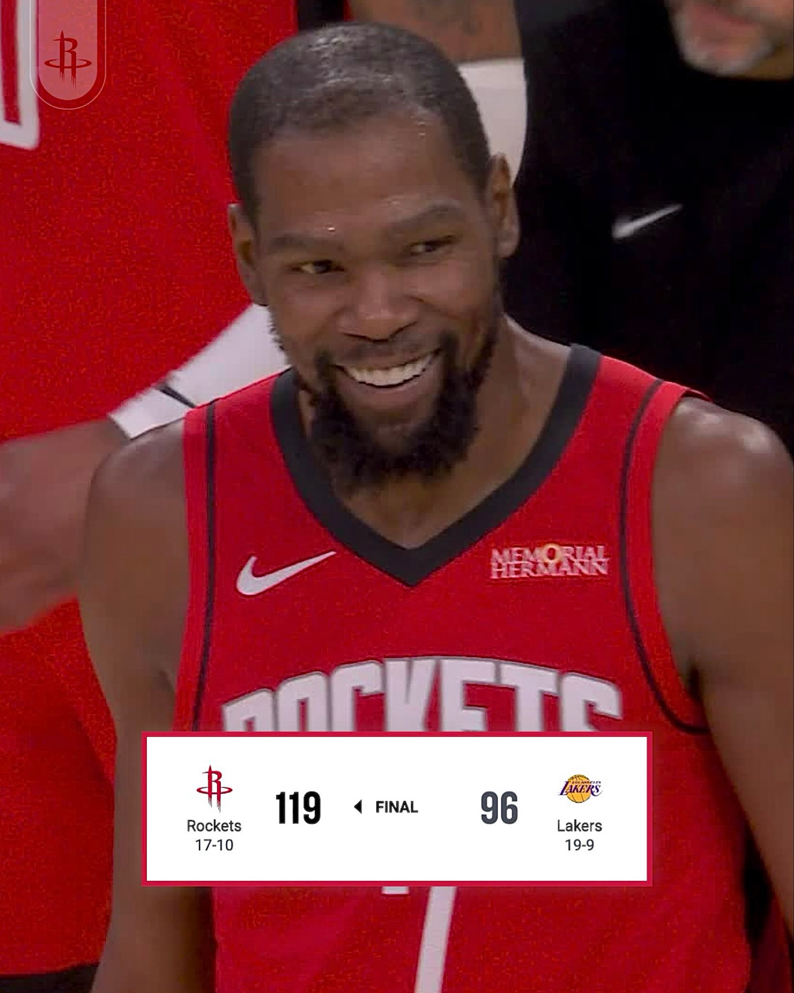 休斯顿火箭 NBA球员评分 杜兰特-我的评分:杜兰特出战33分29秒!投篮14中8,三分6中4、罚球5中5!砍下25分4篮板9助攻1抢断2盖帽,正负值+26!满分没毛病吧💯 休斯顿火箭火箭vs湖人