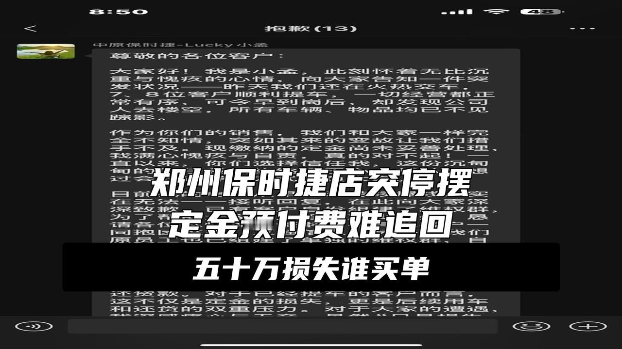 郑州中原保时捷中心突然停业,车主面临提车难 突发!郑州中原保时捷中心一夜人去楼空,车主钱车两空还得还贷款! 这次郑州保时捷中心突然停业,不是简单的经营不善,是豪华车经销商资金链彻底爆雷的典型案例,几百位车主陷入维权死胡同。 12月23日之前,这家店还在正常交车,销售朋友圈还在发促销活动,转头就把展厅车辆拖空,销售和管理层集体失联。 有人刚付10万定金等着提卡宴,前一天还在看车辆物流信息,转头就接到销售发的告别消息。 更离谱的是,有人付了50万定金订帕拉梅拉GTS,现在车影都见不到。 买了几万块终身保养套餐的老车主,现在连基础保养都做不了,之前承诺的车衣、改色膜更是成了泡影。 最惨的是12月22号刚提车的车主,没拿到车辆合格证,上不了牌,还得按月还车贷,钱花了车却不能开。 就连店里的销售都被坑了,有人被欠了几十万工资和报销款,跟车主一样懵。 回看这次爆雷早有预兆,保时捷今年前三季度营业利润暴跌99%,在华销量同比下滑26%,经销商卖车利润被压到几乎为零。 背后的母公司东安控股做了30年汽车经销,这几年业绩原地踏步,转型新能源也没见起色,旗下贵阳的保时捷中心也跟着停业了。 年末车市本来就冷清,大家都在等明年的补贴和新车,经销商卖不动车,资金转不开,只能拖着拖着就爆了雷。 而且停业前一周,公司高管突然换人,新上任的尹少亮只待了两天就卸任,明摆着是在甩锅跑路。 现在保时捷中国已经道歉,当地也成立了专班介入,但车主的钱能不能拿回来还是未知数。 建议各位车主赶紧去保时捷官方渠道登记维权,别信私下的承诺,走法律程序才是最稳妥的办法。 以后大家买豪华车的时候,一定要先查经销商的资质和资金情况,别随便买预付费的保养套餐,不然钱交了店没了,哭都找不到地方。 兄弟们,你们怎么看这次保时捷经销商爆雷?有没有踩过类似的坑?评论区聊聊你的经历,关注我,带你看透汽车圈的那些暗坑,转发给身边准备买车的朋友,别让更多人被坑!