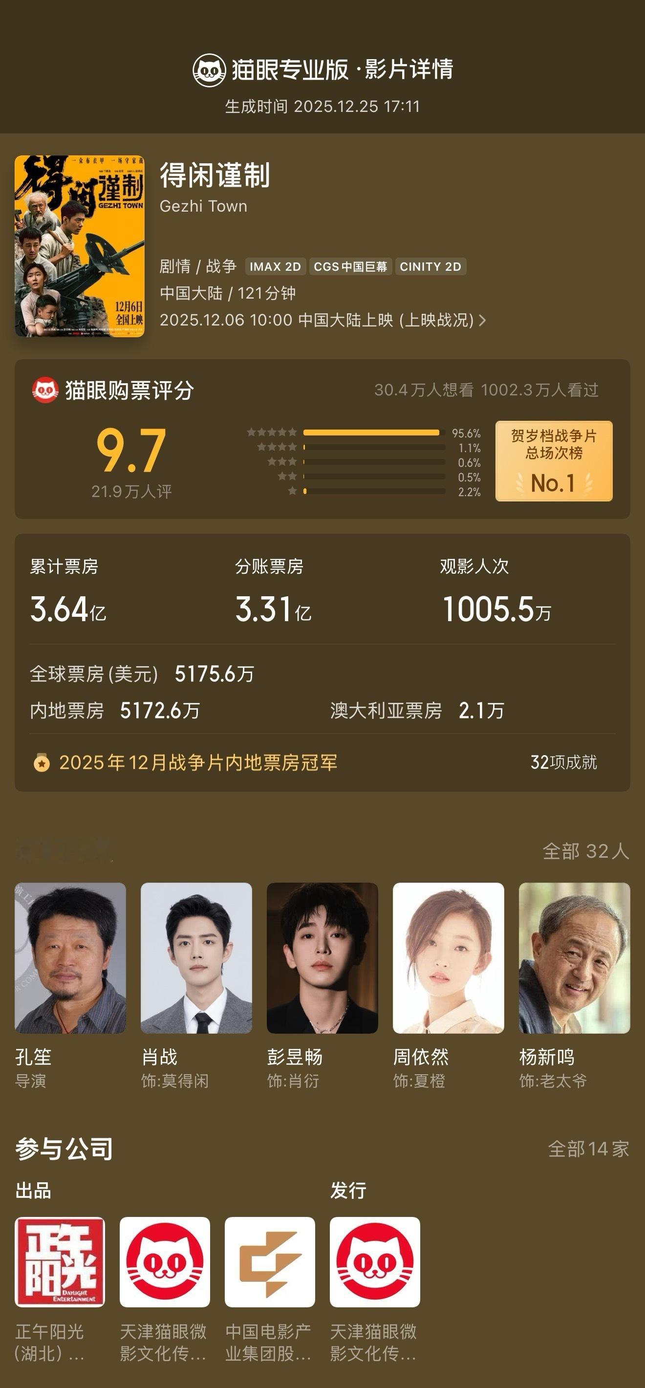 得闲谨制延长上映至2月5日 据猫眼专业版数据,《得闲谨制》官宣密钥延期,延长上映至2026年2月5日,截至当前累计票房已超3.64亿。