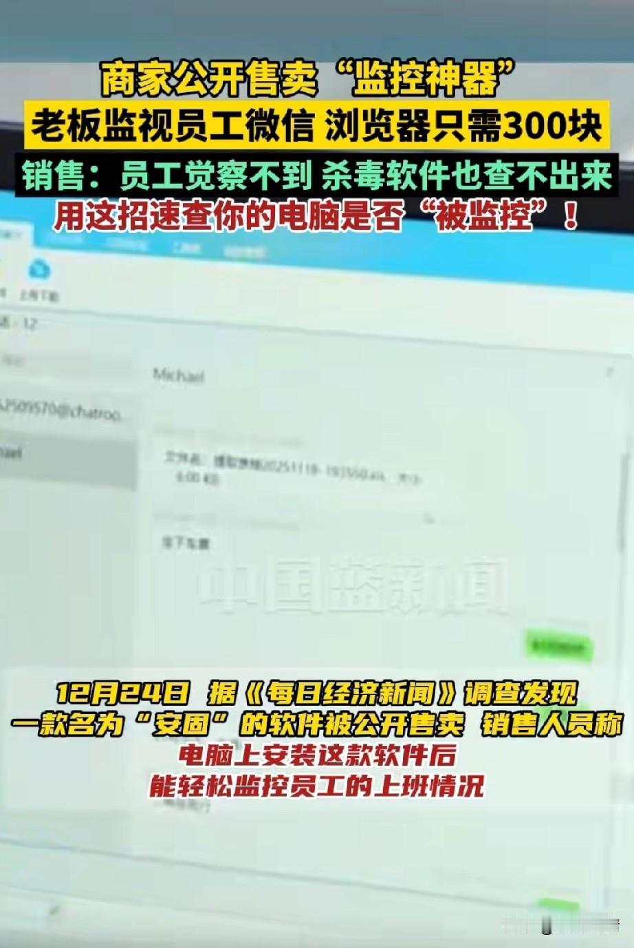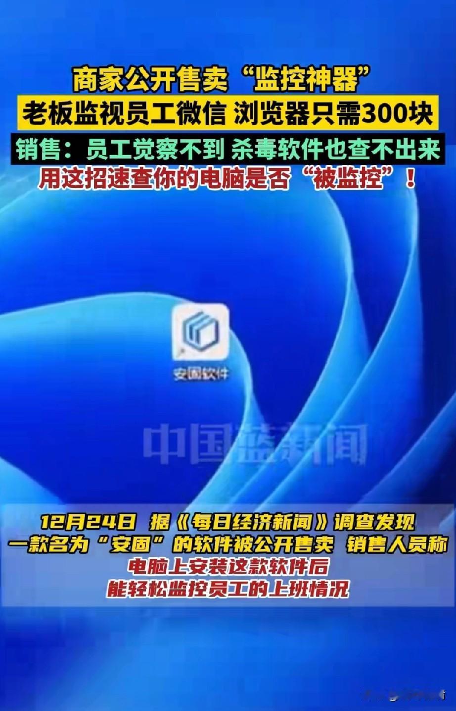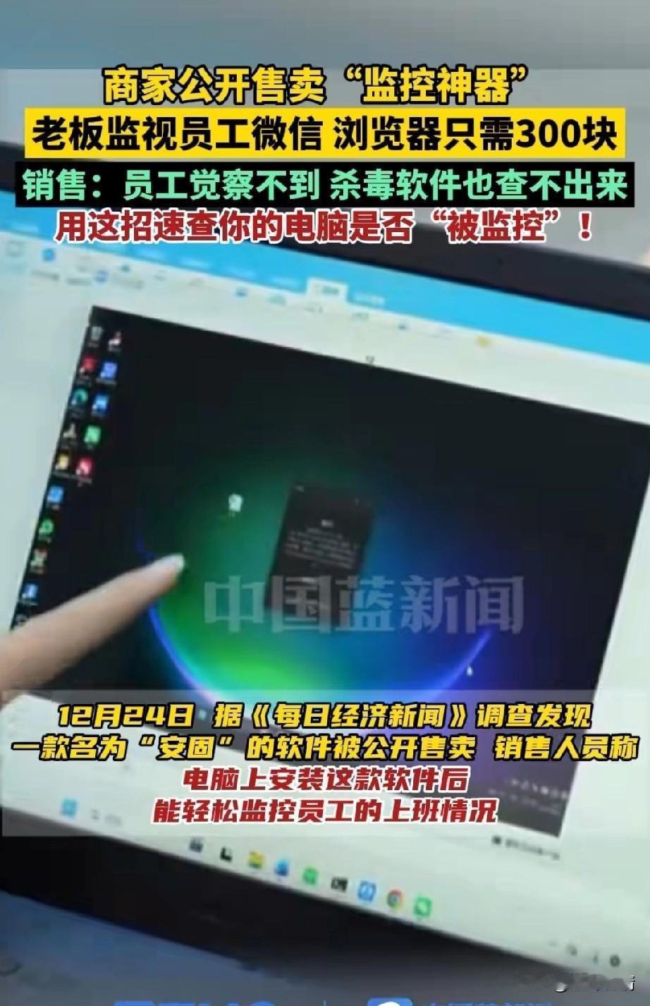 商家公开销售监控神器, 老板监视员工微信只需300元, 电脑装上这款软件之后, 老板就可以随时监控员工上班情况, 现在上个班摸个鱼真的太难了, 老板不想如何把公司业务做好, 天天盯着员工干活, 这样的公司相比也不是什么好公司, 国外公司都是把业务做好就行, 而国内公司却是把人当奴隶, 因为自己掏了那么一点钱, 就不让员工闲一会, 这不就是和地主老财一样吗? 好的公司更注重效率, 而不是天天想着扣员工的钱, 上有政策,下有对策, 就算再厉害的软件, 也有大神可以破解软件, 大家快查查自己的电脑, 是否安装有这款软件? 有的话就尽快抓紧处理一下吧! 大家对于商家公开售卖这种软件怎么看? 公司监控摄像头 手机软件监控 监控电脑软件 办公用监控 监控电脑监控 微信监控 店铺监控神器