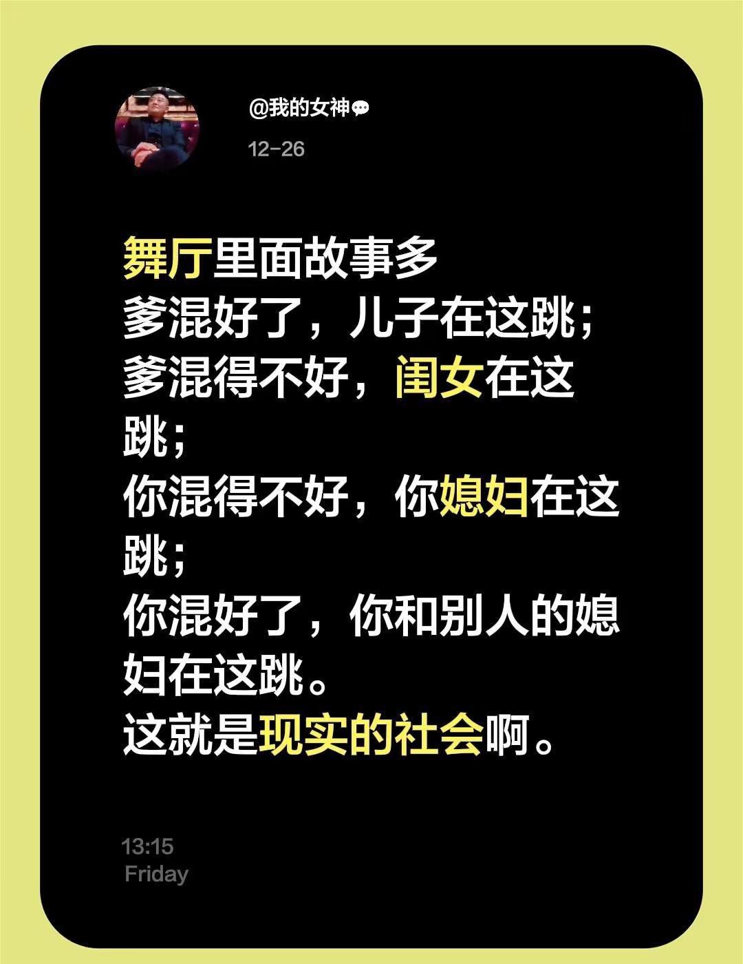 社会与现实生活中的点点滴滴。舞厅里面故事多爹混好了,儿子在这跳;爹混得不好,闺女在这跳;你混得不好,你媳妇在这跳;你混好了,你和别人的媳妇在这跳。这就是现实的社会啊。很现实的一段话