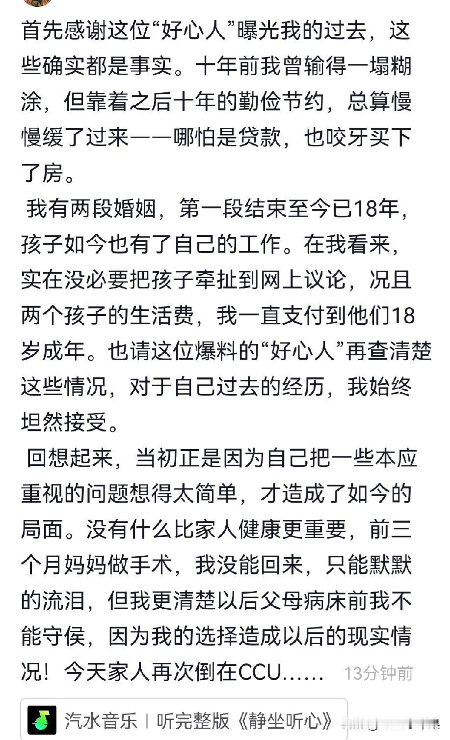 哑叔女友终于坦白了!原来爆料都是真的,哑叔这次应该真的受伤了! 经过几天的发酵和质疑,26日消失了几天的哑叔女友向阳花终于公开回应了,总结下来就是:承认网友爆料都是真的,自己确实结过两次婚、有两个女儿,以前确实输的很惨,但现在已经改了,也贷款买了房,给两个女儿支付了抚养费直到18岁。自己对自己的过去很坦然,因为没注意到这些问题的严重性,才导致了现在的局面。最后一句话意味深长,以前没能在父母身边尽孝,以后因为选择也不能… 什么选择?还要远离亲人去哪里?这是不是在暗示还想回到哑叔身边?虽然坦白了,但坦白不代表事情的结束,这件事将直接导致双方信任的坍塌,再想回到最初的美好已经不可能了!大家觉得呢?你们还希望他们在一起吗?