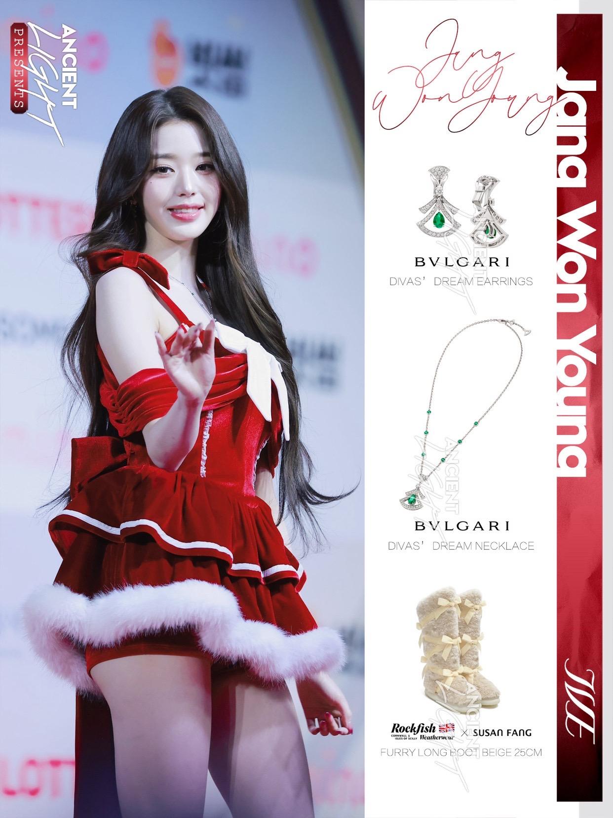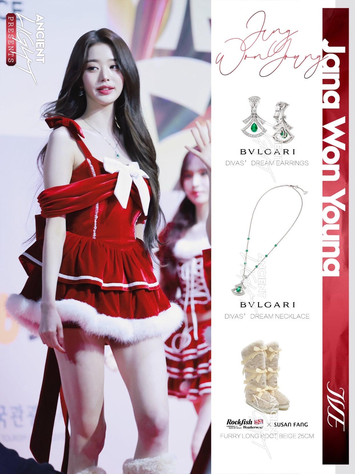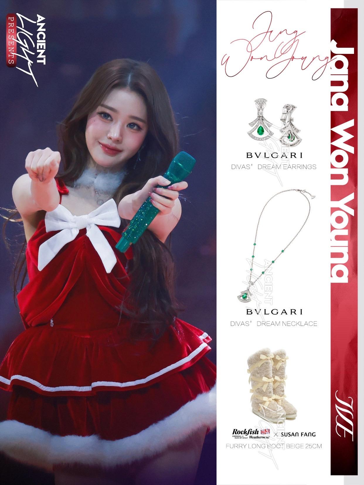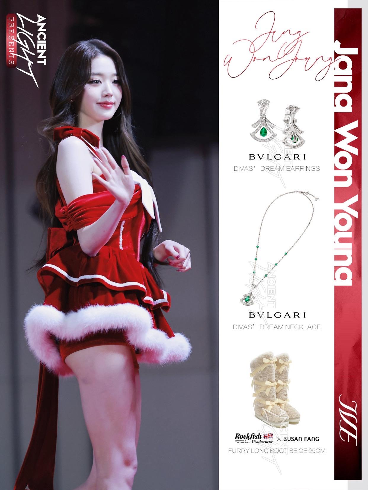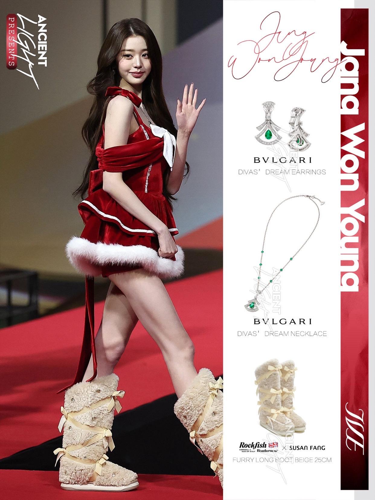 张元英·SBS行走的圣诞限定红丝绒蛋糕 张元英身穿丝绒圣诞裙出席SBS歌谣大战,,红丝绒裙装搭配,宝格丽绿松石珠宝,红绿撞色,像极了圣诞🎄小精灵呼应圣诞氛围。 🌟📿 JEWELRY:BVLGARI 👢BOOTS:Rockfish x SUSAN FANG