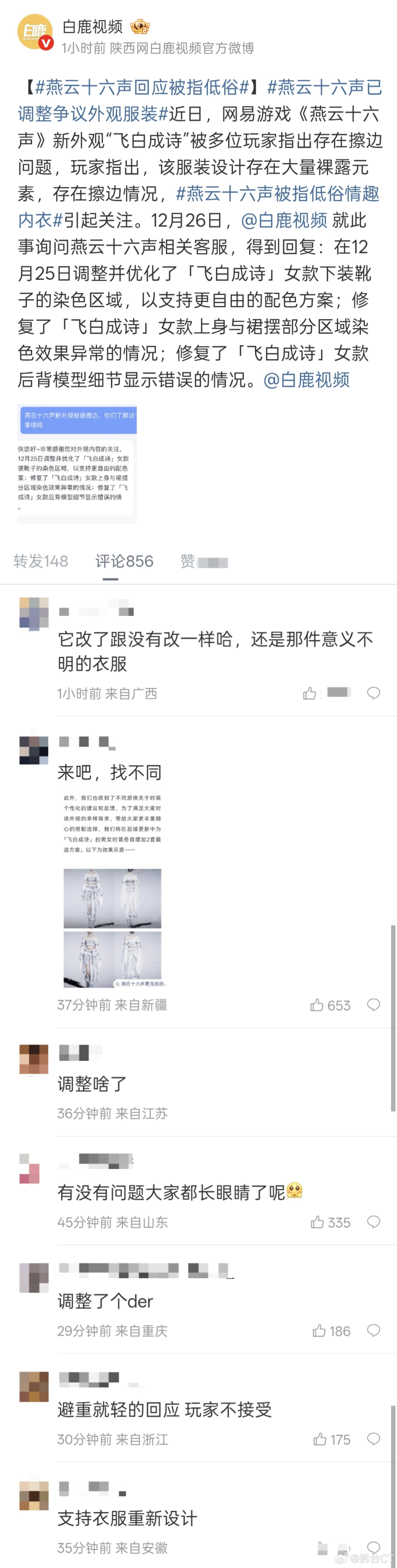 日前, 燕云十六声的新外观“飞白成诗”,被指疑似QQNY。26日,燕云十六声回应称:①已于12月25日调整并优化了「飞白成诗」女款下装靴子的染色区域,以支持更自由的配色方案;②修复了「飞白成诗」女款上身与裙摆部分区域染色效果异常的情况;③修复了「飞白成诗」女款后背模型细节显示错误的情况。但据观察,相关微博下方,质疑声音依旧不停。要我说,燕云十六声此举,纯属自作自受。毕竟,愿意吃亏,就有吃不完的亏;愿意向赛博🇮🇱低头,就有低不完的头。燕云十六声这下子算有福咯!燕云十六声回应被指低俗 燕云十六声被指低俗情趣内衣