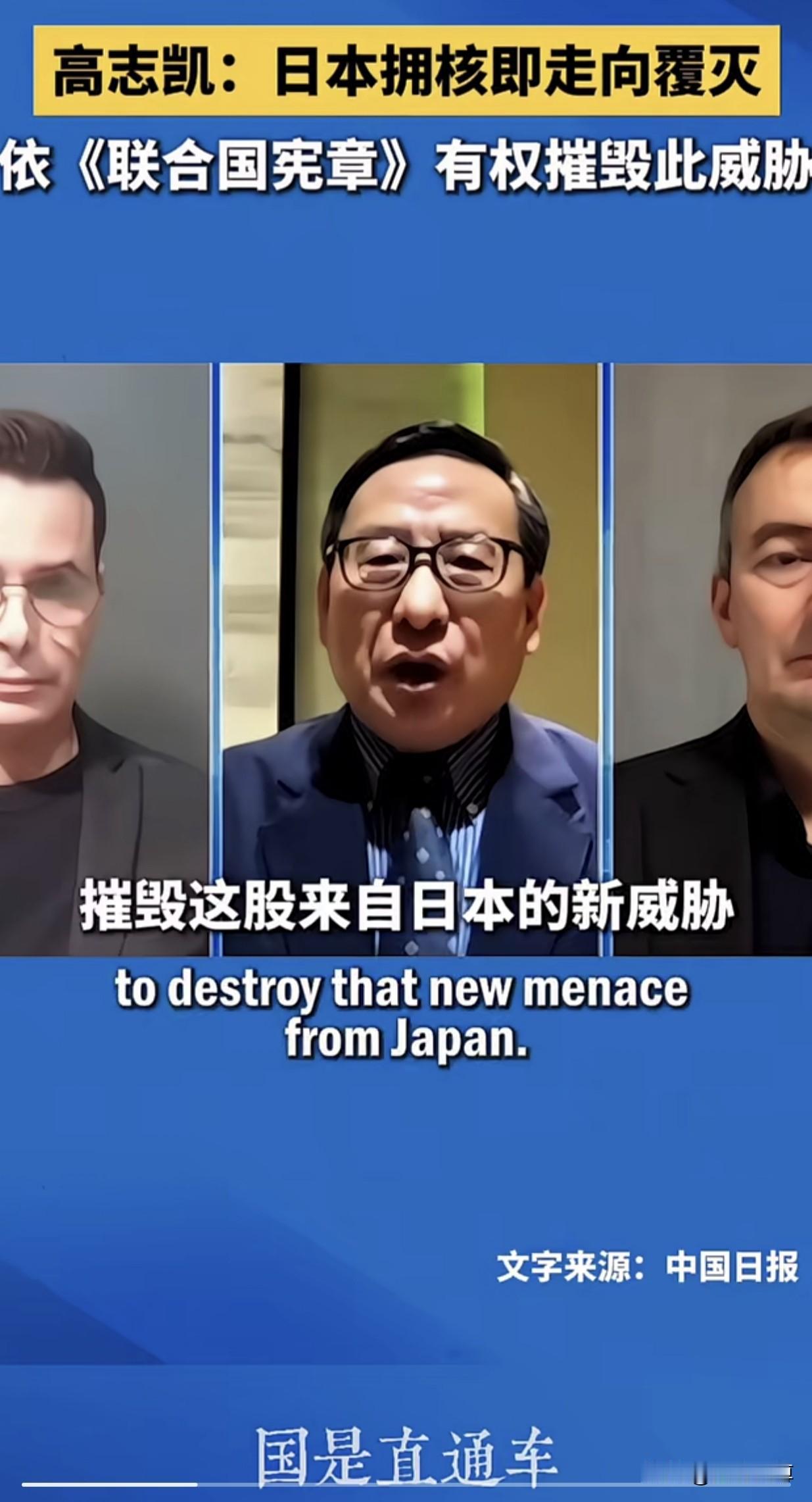 日本若是真的拥核,我们该怎么办?高志凯给出了一个答案!他是这么说的:日本若是拥核,就是走向覆灭。按照《联合国宪章》,中方有权摧毁此威胁。不得不说,高志凯教授的话很硬气。当然,他也只是论述了一个事实。作为二战的战败国,一旦出现对战胜国威胁的苗头,我们的确有权利直接摧毁来自日本的威胁。所以结论是明确的,日本一当拥核,实际上就是自取灭亡!