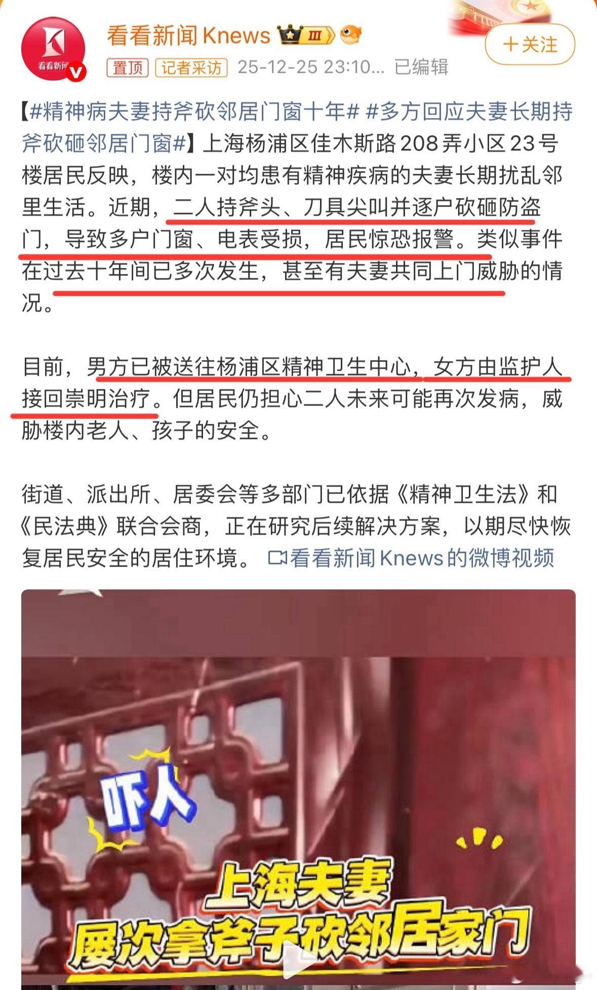 精神病夫妻持斧砍邻居门窗十年二人持斧头、刀具尖叫并逐户砍砸防盗门,十年内多次发生,太可怕了。