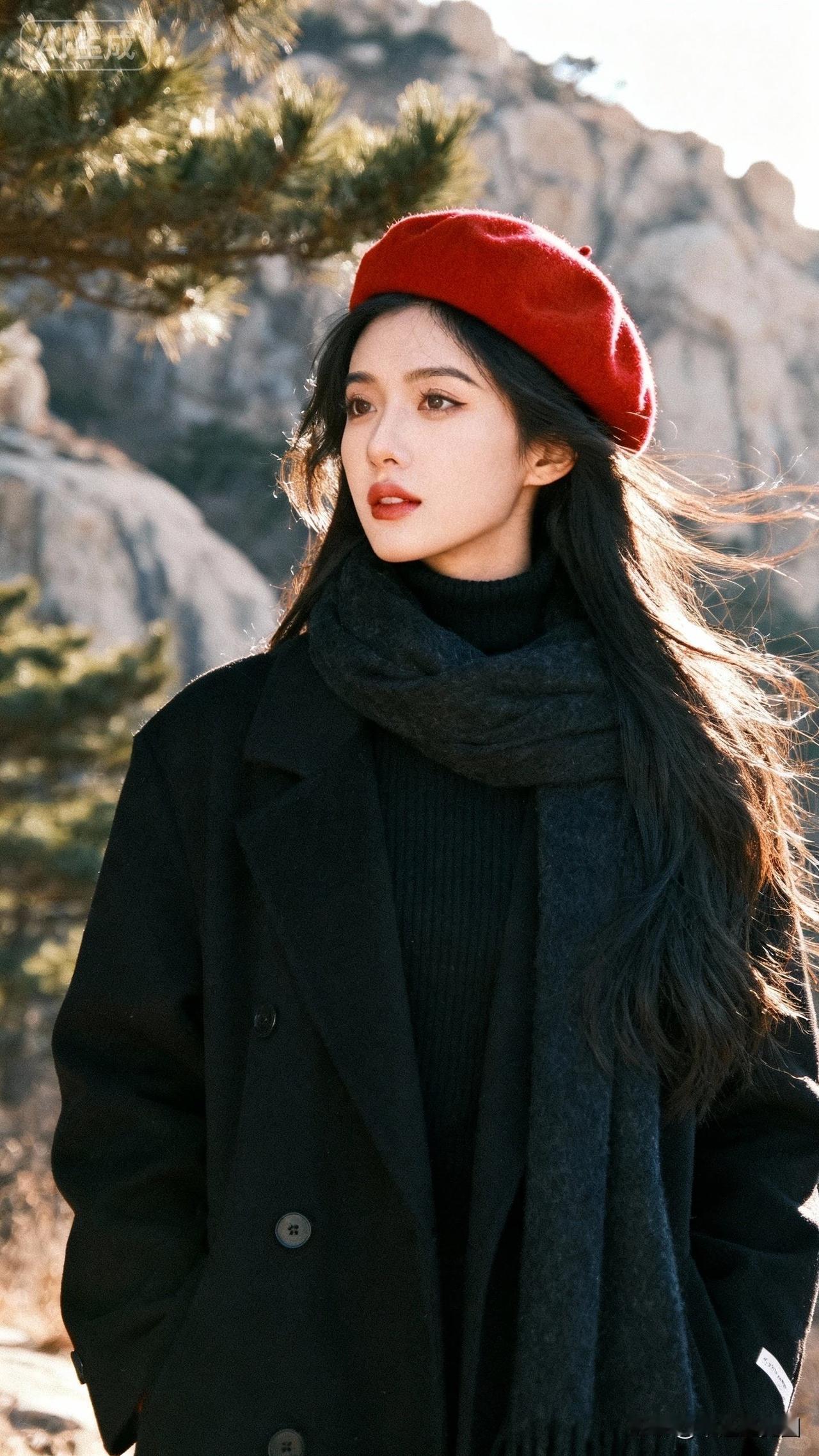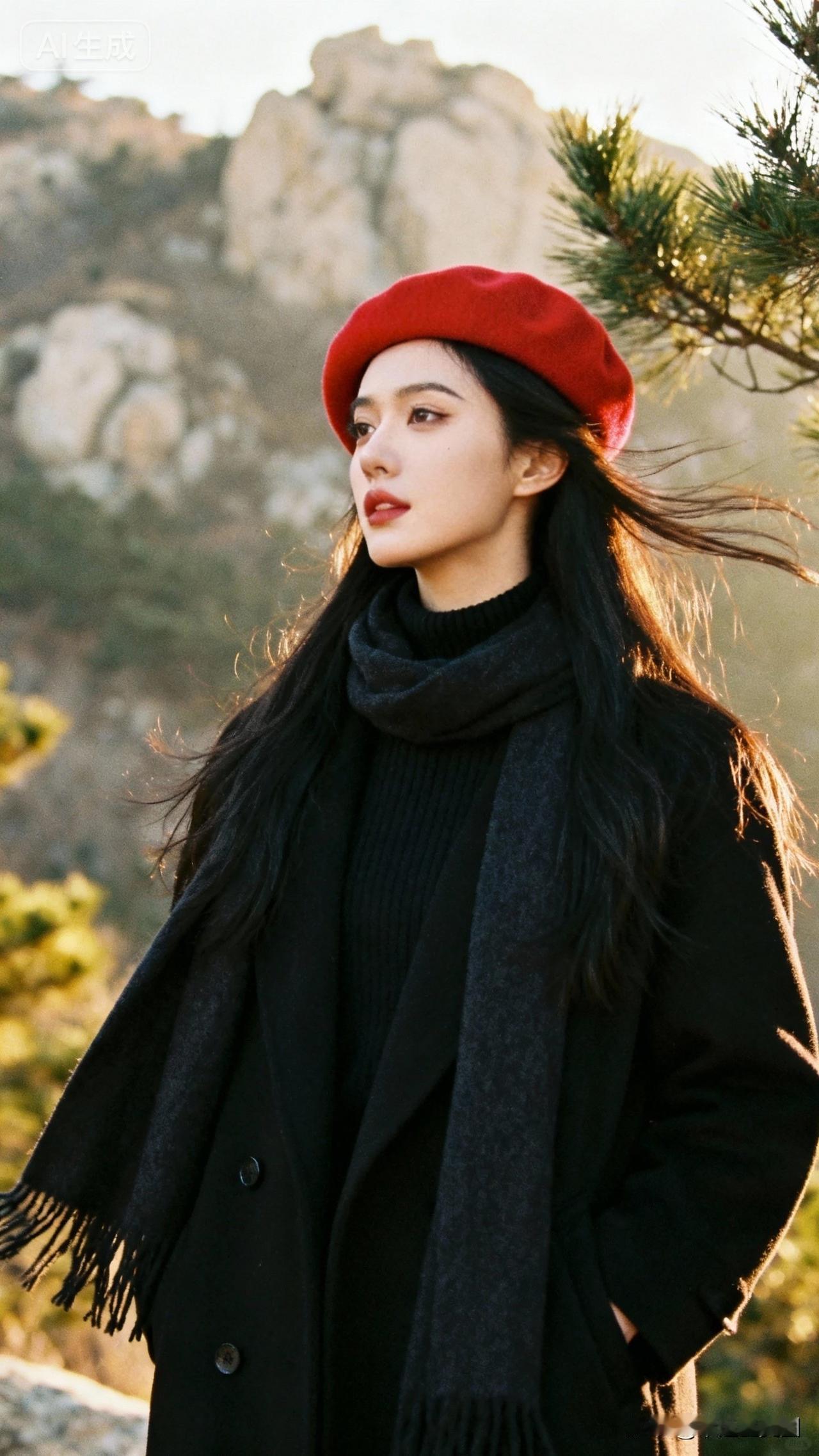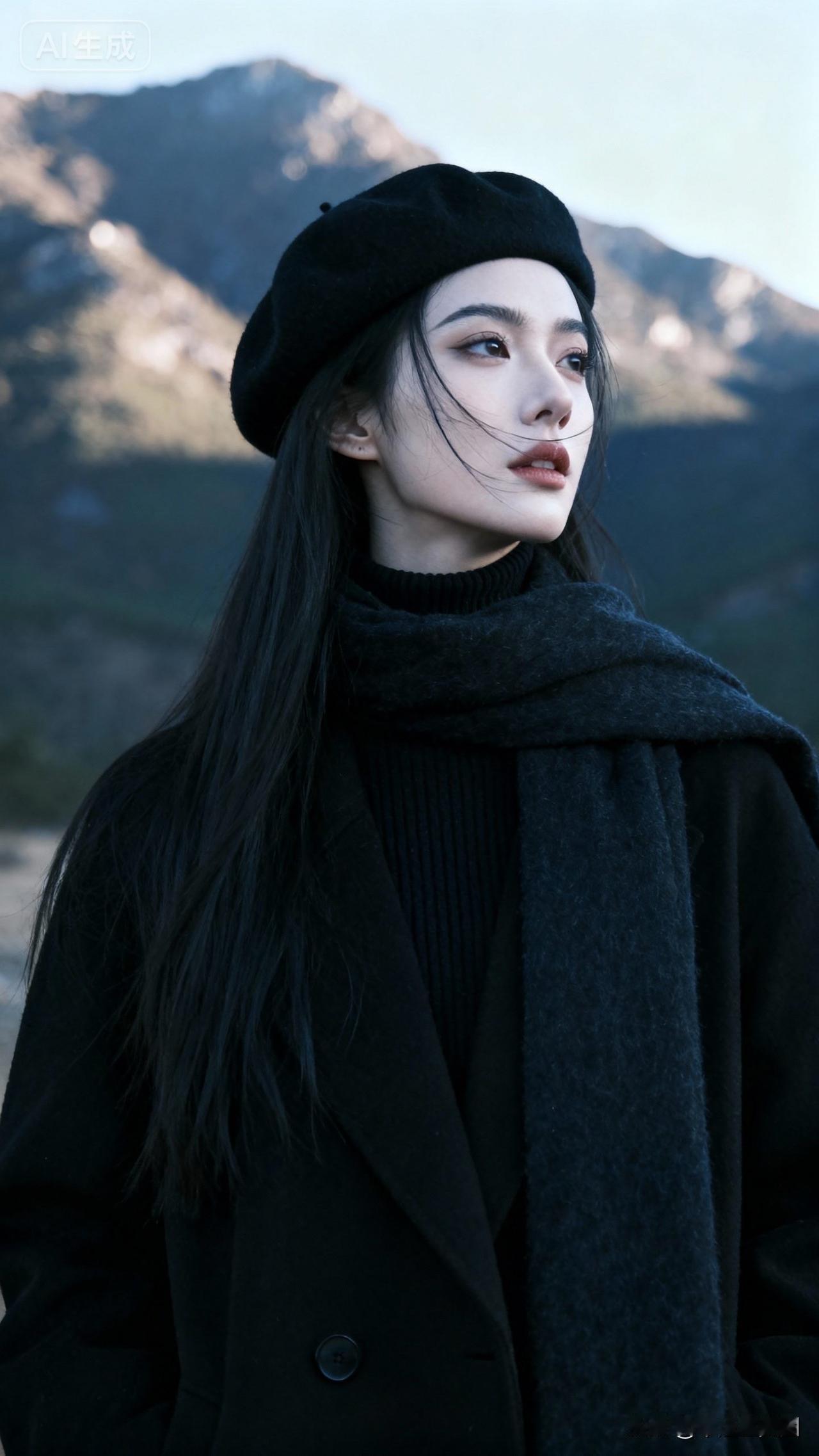 冬日暖阳下的黑衣少女,散发着优雅的魅力。