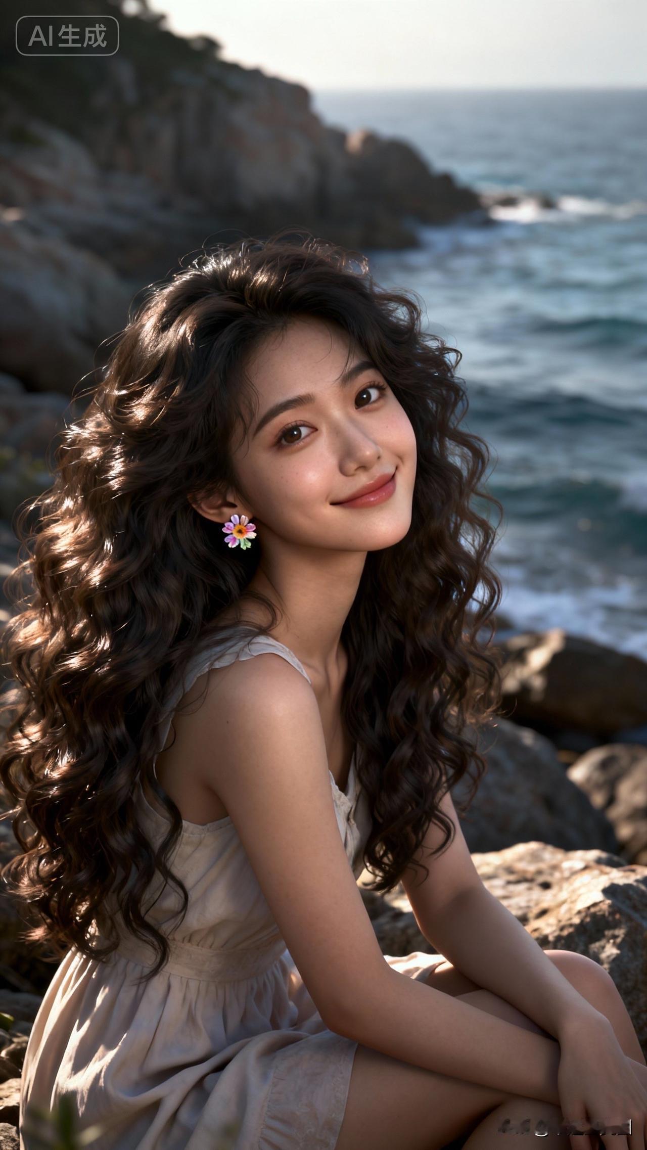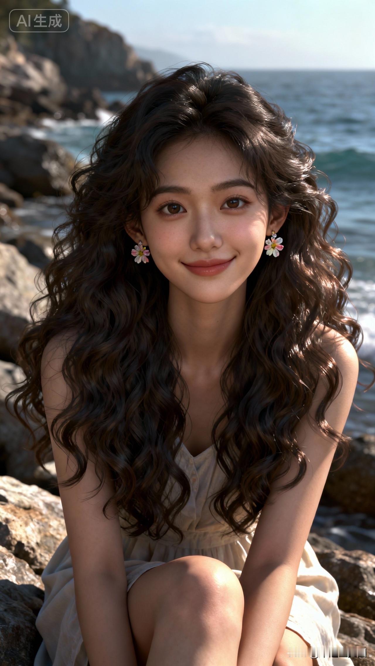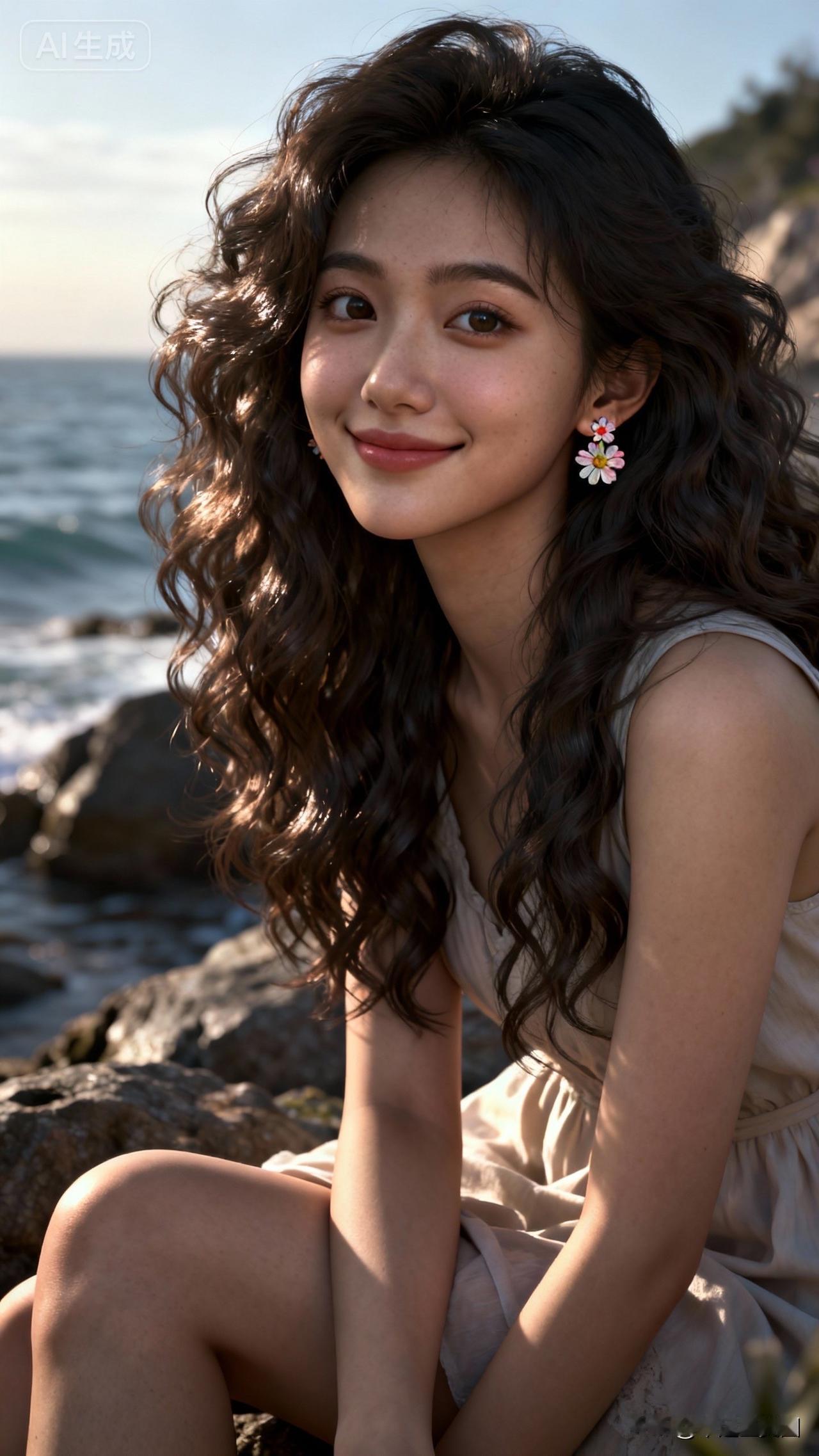 海边少女,温柔微笑,海风吹拂,花饰耳环,浪漫时光。