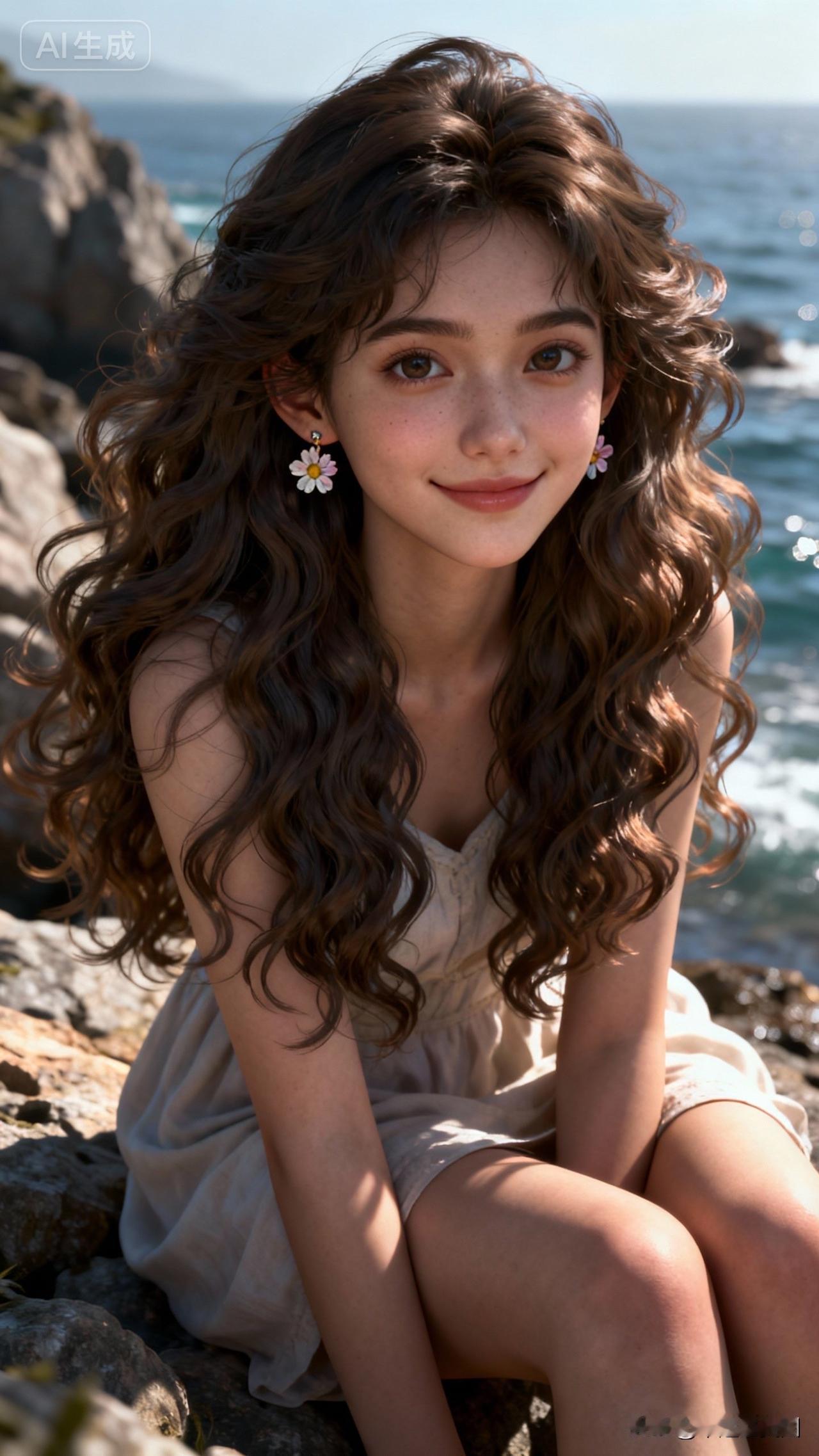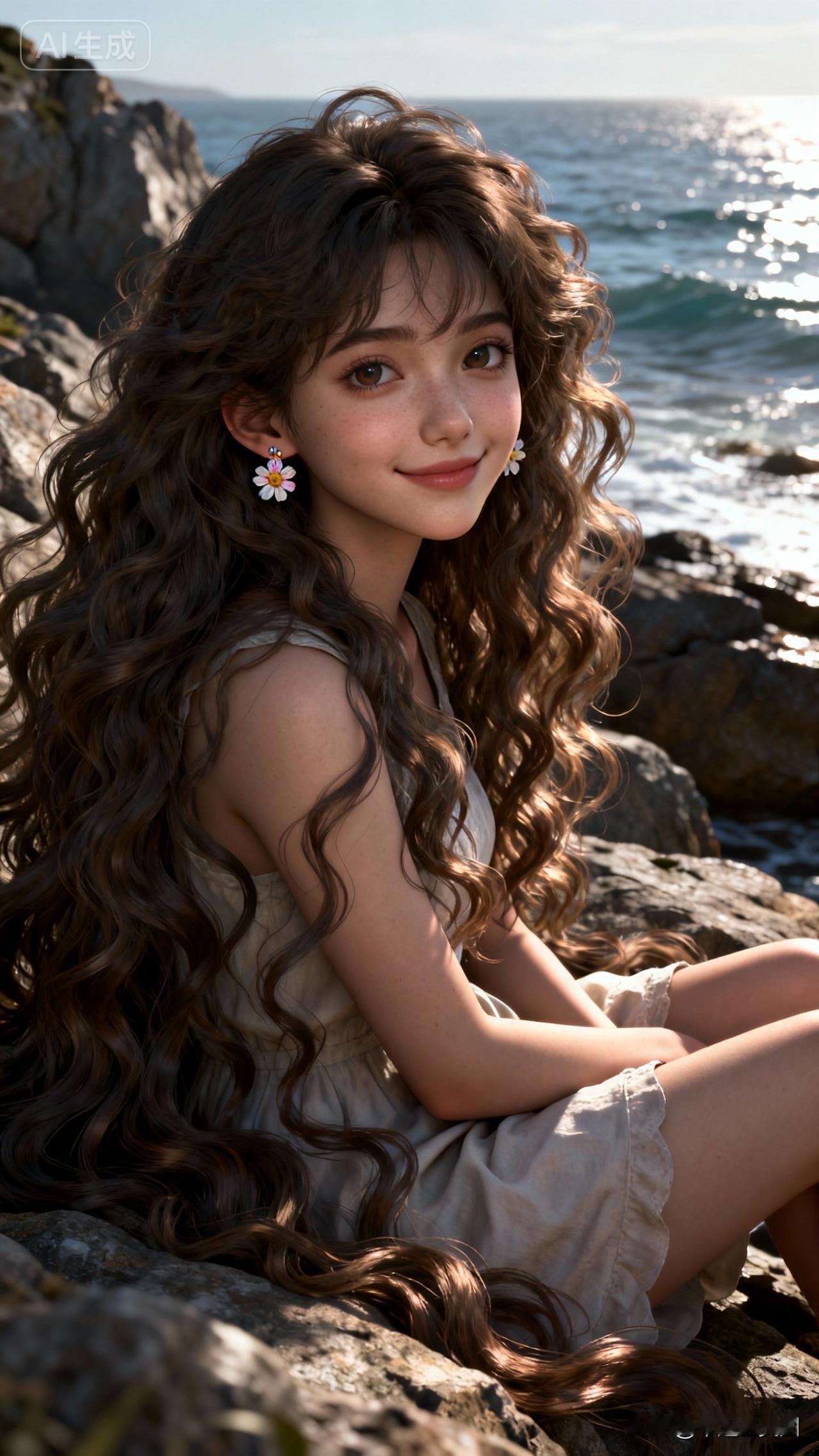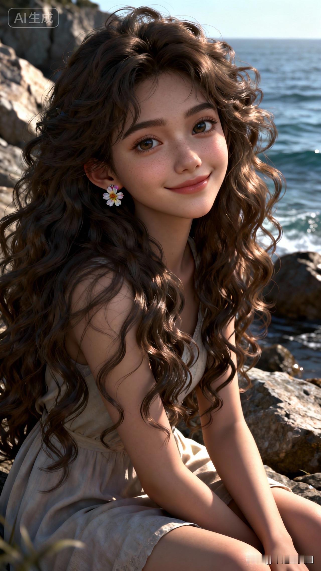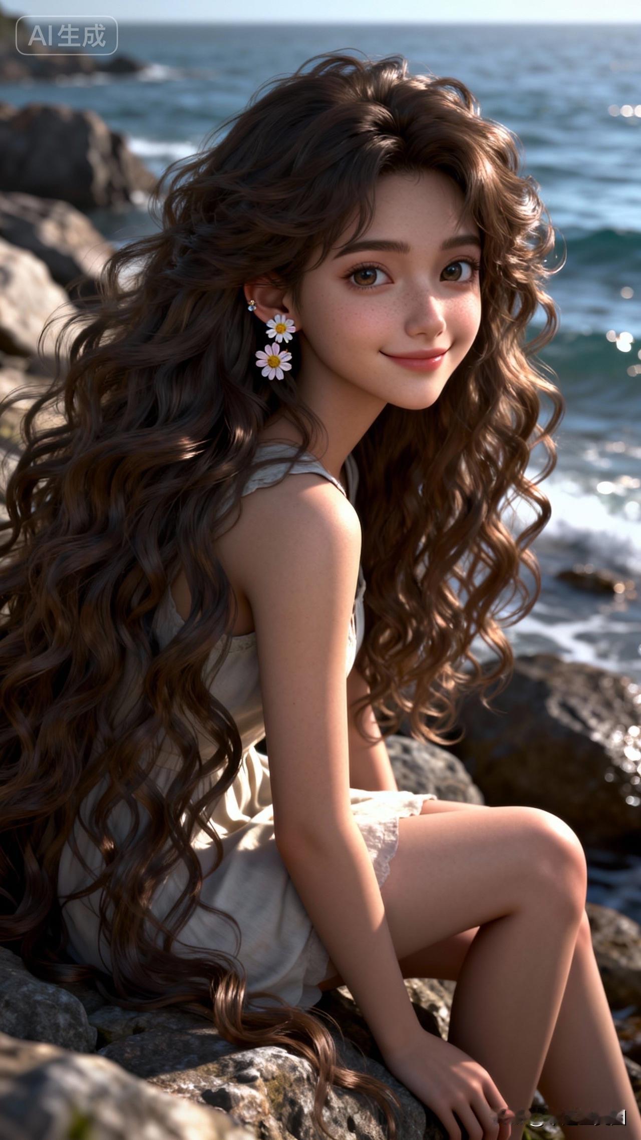 海边少女,温柔微笑,海风吹拂,花饰耳环,浪漫时光。