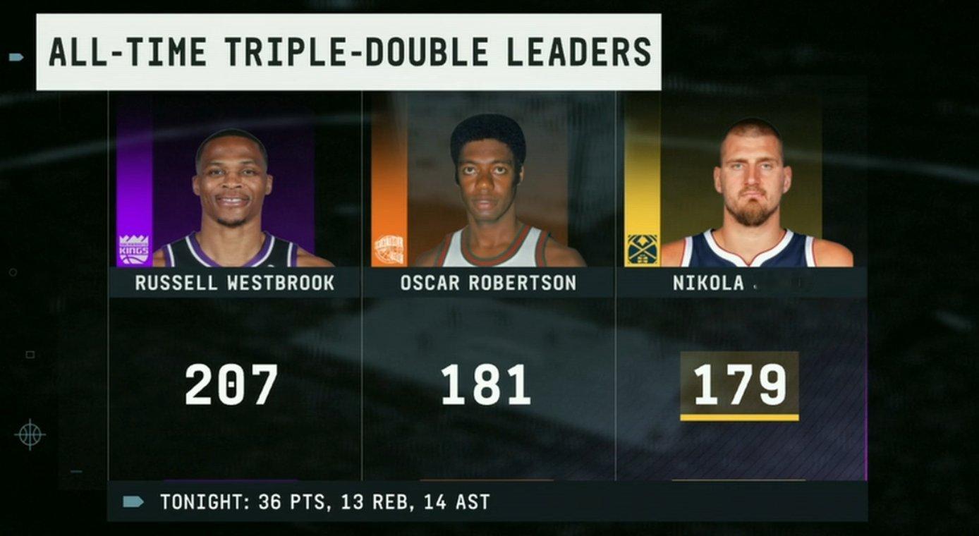 ▲我约本赛季的三双次数快追平历史第二的奥斯卡-罗伯特森▲成为历史第一也为时不远了,快的话下赛季大概率就能实现历史第一多的单场三双场次数