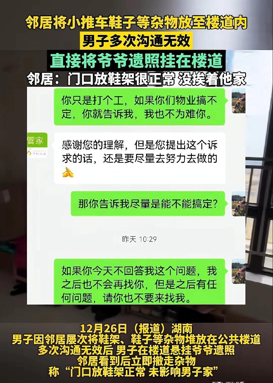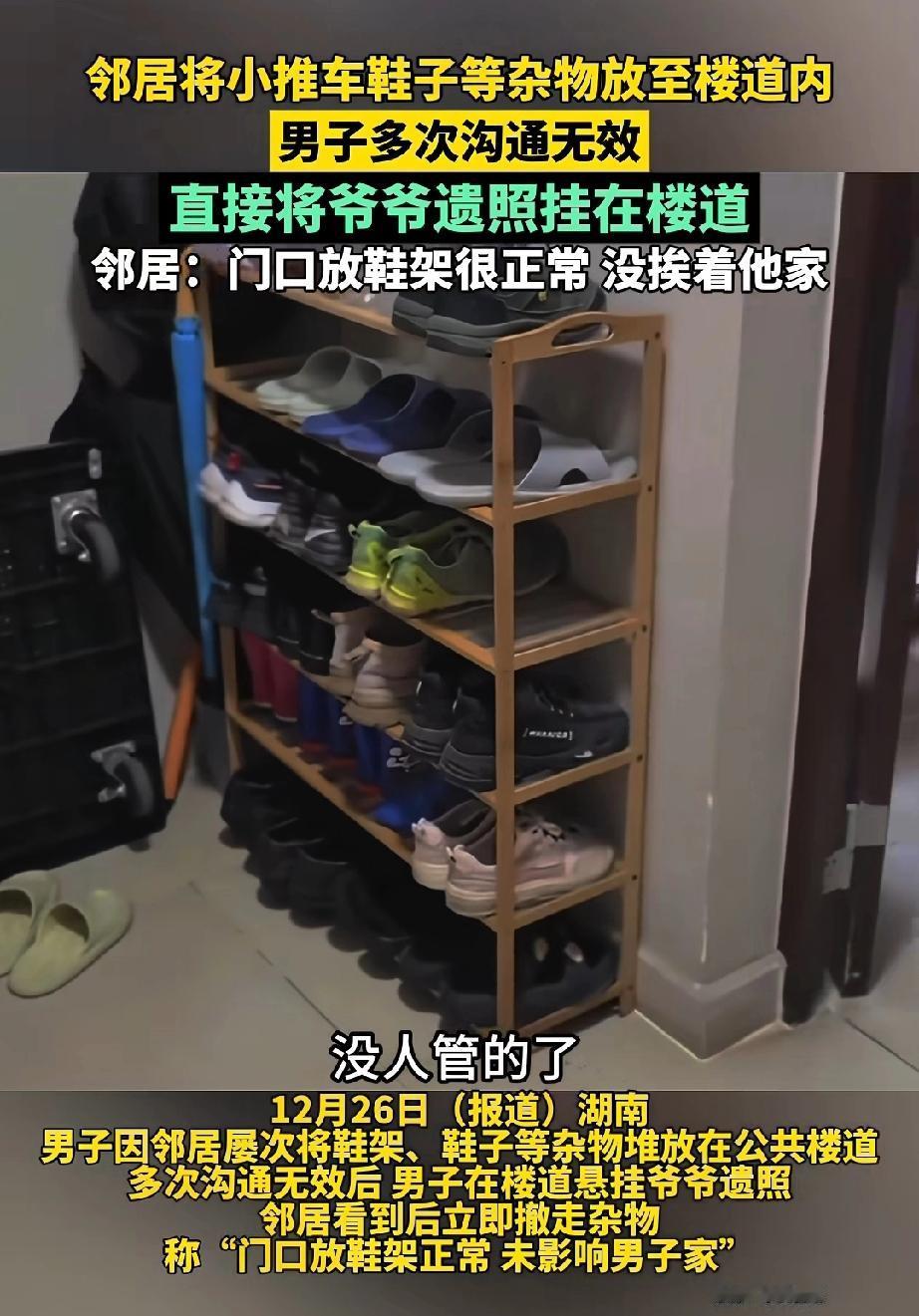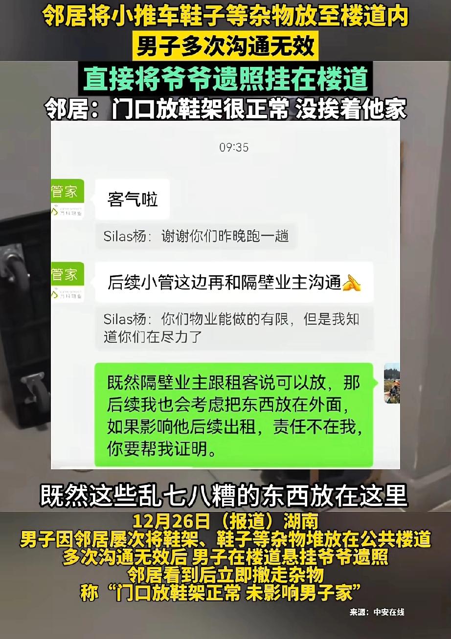 “厉害了”!邻居把鞋柜、小推车等杂物堆在楼道里,男子让物业去沟通,没想到邻居觉得这没影响到男子,死活不肯把杂物收拾到室内。 男子灵机一动,将爷爷的遗像挂到楼道里,还摆上供桌和香炉,每天上班时就点上一炷香。 邻居向物业反映此事,觉得男子这么做不合适,每天走在楼道里都感觉阴森森的。 男子反问物业:“他家能在楼道摆杂物,我家就不能摆爷爷的遗像吗?” 这话让物业无言以对,正左右为难时,邻居把鞋架、小推车等杂物收进了室内。 男子并非爱计较之人,既然邻居认识到错误,他便收起了爷爷的遗像。 网友看到后乐翻了天,评论道:“真是魔法打败魔法,值得借鉴。” 也有网友评论:“你不怕爷爷生气啊。” 更有网友评论:“这样挺好,让你爷爷带着朋友每天去他家鞋架那儿逛逛,看他怕不怕。” 其实,爱在楼道占地盘的人,往往缺乏关爱他人之心,还十分贪心。贪的门口那方寸之地。 其实,在家门口摆鞋柜或杂物并非好事。杂乱的鞋子散发着臭味,其他邻居看着会心烦,还有碍自家的家庭运气。 最重要的是在楼道摆放杂物,容易引起火灾。 来源:中安在线