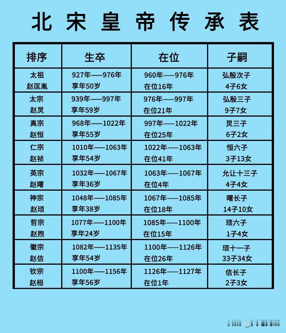 北宋九位皇帝 宋太祖·赵匡胤,在位16年,50岁,建立北宋。 宋太宗·赵光义,在位21年,59岁,灭亡北汉。 宋真宗·赵恒,在位25年,55岁,前期勤政,后期昏庸。 宋仁宗·赵祯,在位41年,一代明君。 宋英宗·赵曙,在位4年,支持司马光编纂《资治通鉴》。 宋神宗·赵顼,在位18年,任用王安石变法。 宋哲宗·赵煦,在位15年,推行变法政策。 宋徽宗·赵佶,在位26年,昏庸无能,导致靖康之耻。 宋钦宗·赵桓,在位1年,背锅侠,接替徽宗皇位。