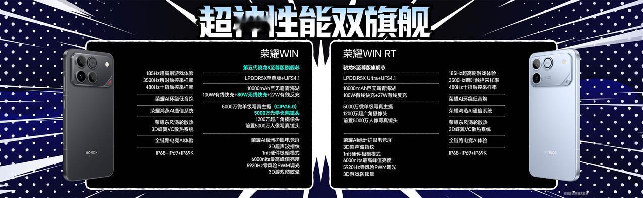 荣耀WIN系列这次的颜色名字有意思🌚 一共有 快开黑、不怕蓝、指定赢3款配色 价格来了! 荣耀WIN RT 12GB+256GB、16GB+256GB、12GB+512GB、16GB+512GB、16GB+1TB版本售价分别为2699元、2999元、3099元、3399元和3999元; 荣耀WIN 12GB+256GB、12GB+512GB和16GB+512GB、16GB+1TB版本售价分别为3999元、4499元、4799元和5299元。 如何?