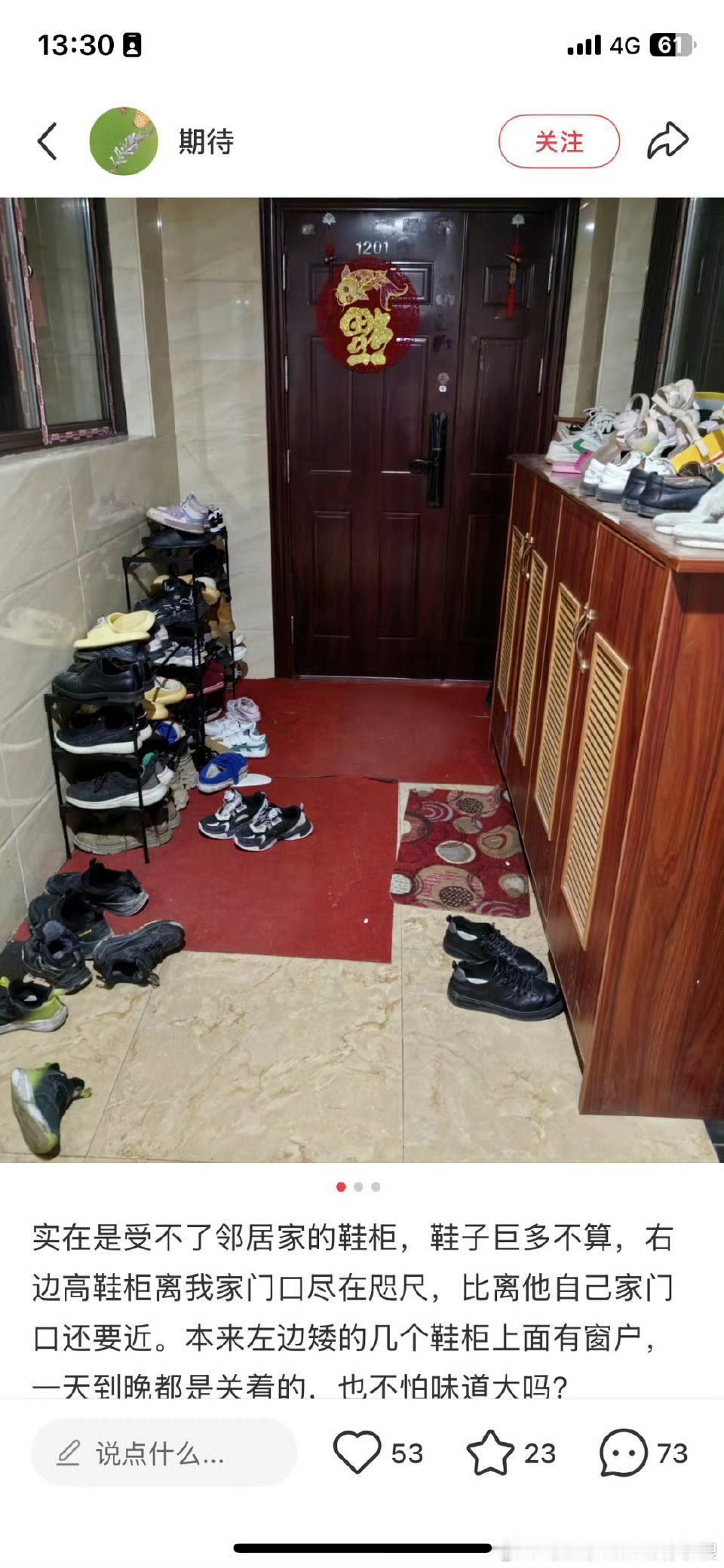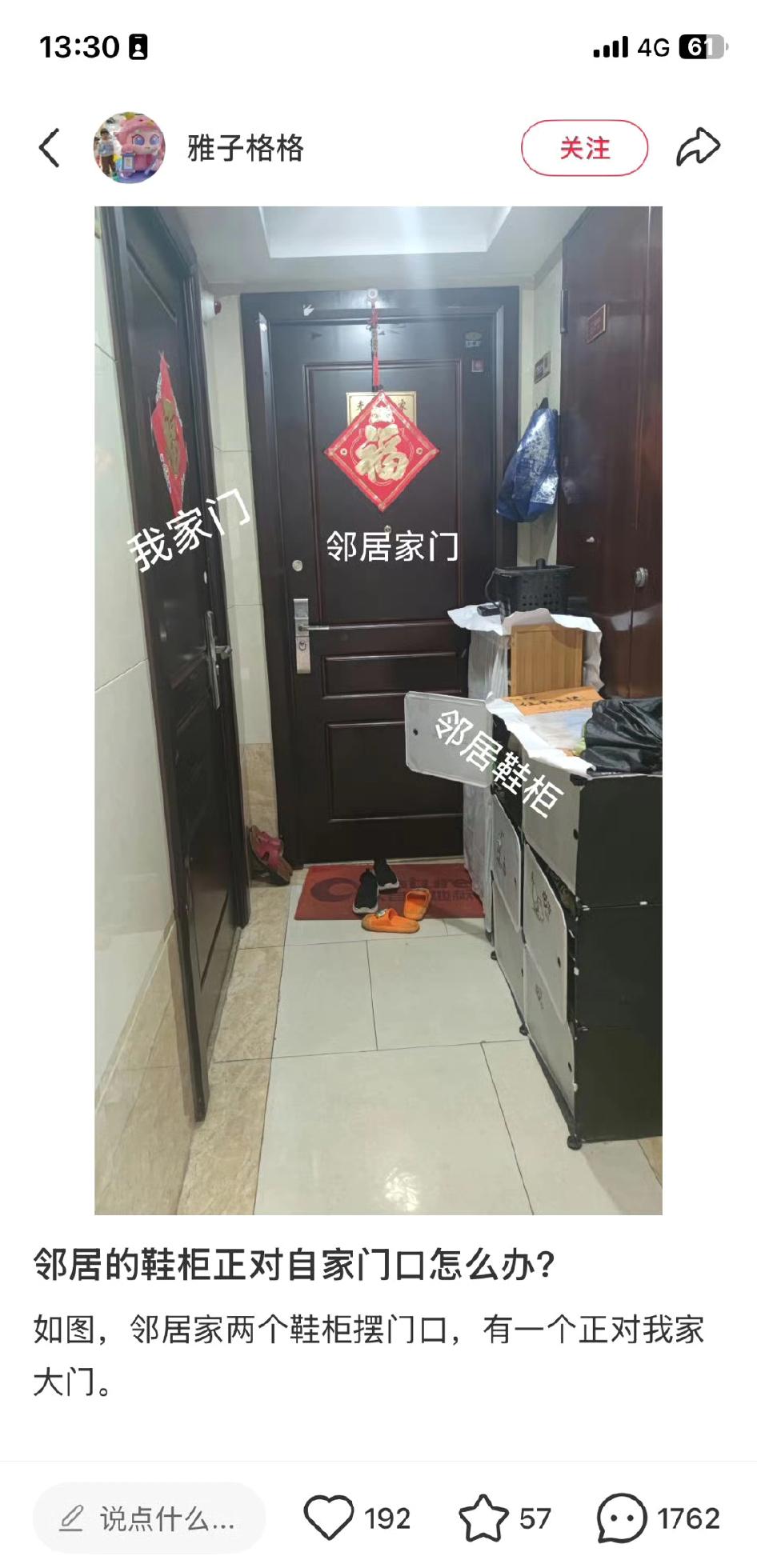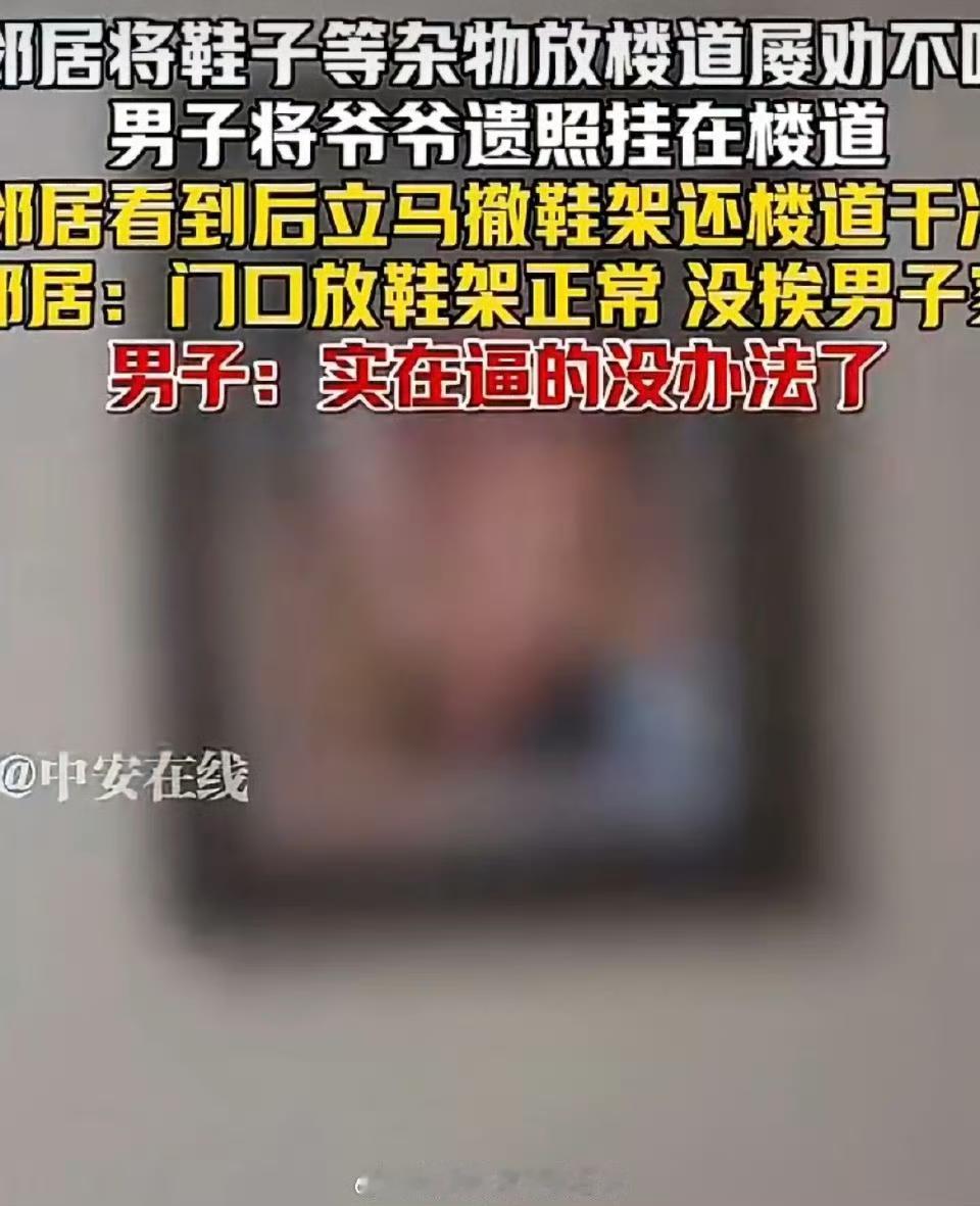 你家邻居讨厌吗?都说远亲不如近邻,但得分友邻还是恶邻!辛辛苦苦买的房子友邻提升幸福感,而恶邻则会让人顿生多重怨气与无名火! 最近有这么个事儿,一名男子就遭遇了恶邻。邻居总爱把鞋架放在公共走廊,不仅占地方,还散发着一股怪味。男子多次沟通,邻居却依旧我行我素。 男子实在忍无可忍,想出了一个奇招——在门口挂上爷爷的遗照。这样一个出门见鞋,一个开门见爷! 这招还真管用,邻居看到后,很快就把鞋架挪走了。 这事儿在网上引发了热议,大多数网友觉得男子做得棒,毕竟遇到这样不自觉的邻居,沟通无用只能出此下策。也有人觉得要是对方不在意用这种方式可能会把关系闹得更僵。 但有的邻居真的很难沟通只有用魔法打败魔法 ,真就比起《民法典》,有些人更怕祖宗瞪眼! 希望大家都能遇到友邻,让家的周边充满温馨与和谐,而不是被恶邻搞得心烦意乱。