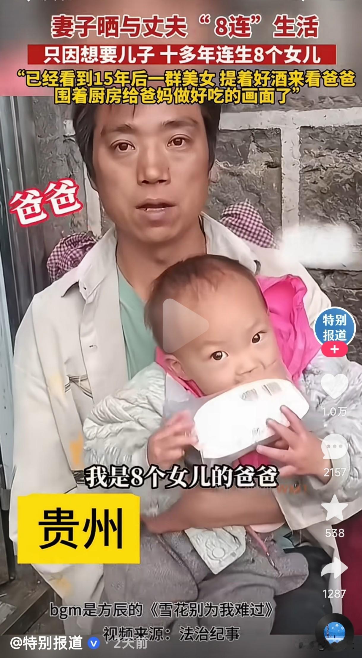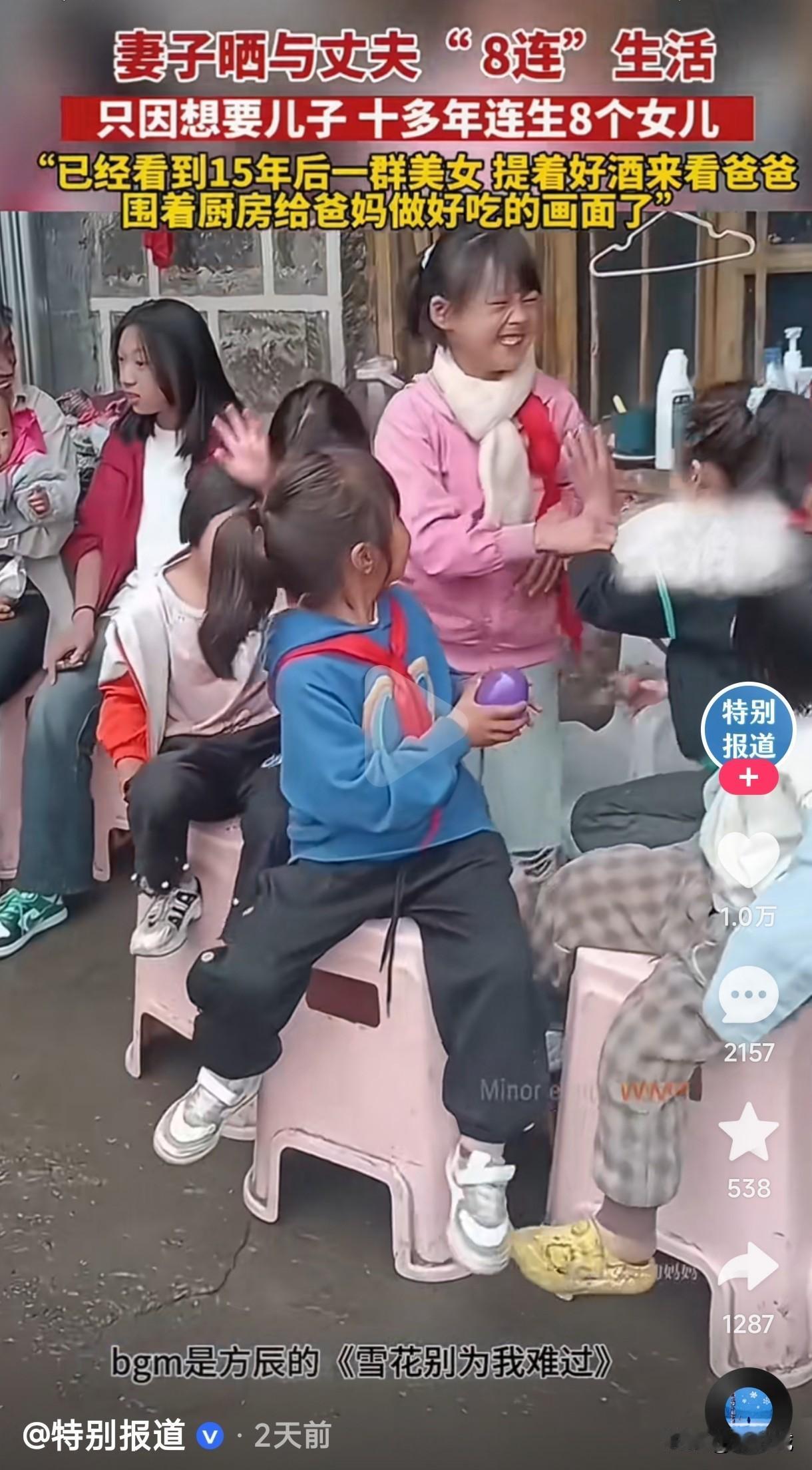 女子晒出和丈夫结婚10年多为了想要个儿子连生8个女儿,这是自从结婚后不是在生孩子就是在怀孩子吗? 话说孩子多了确实是好,但为了要个儿子连生8个却都是女儿,这以后是不是还会继续在生,直到生出儿子为止吗?不得不佩服这两口子的勇气,不是在生孩子,就是在怀孩子的路上,这十多年来一直都在生孩子,连买卫生巾的钱都省下了,这大了以后全部都上学能负担的起吗? 不是说先苦后甜吗,现在带8个孩子肯定要比同龄人辛苦很多,但以后老了个个都回家帮父母干这干那的,那画面想想都令人羡慕,对于有的人来说儿子真的比女儿好吗?
