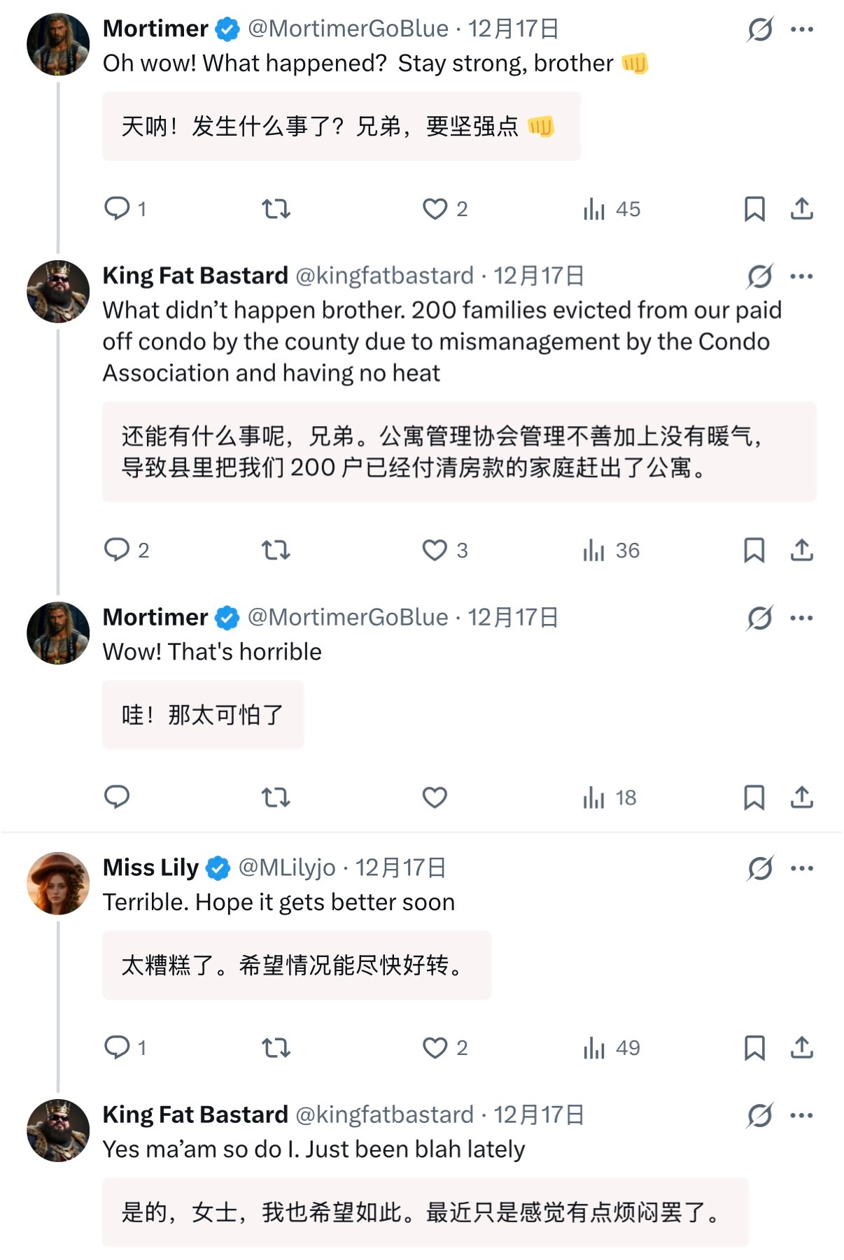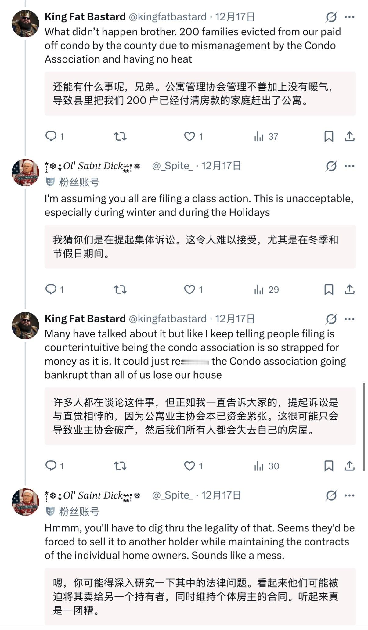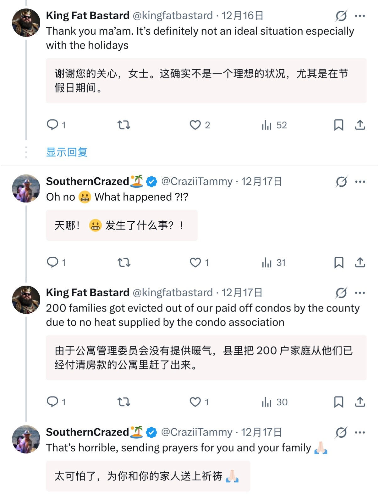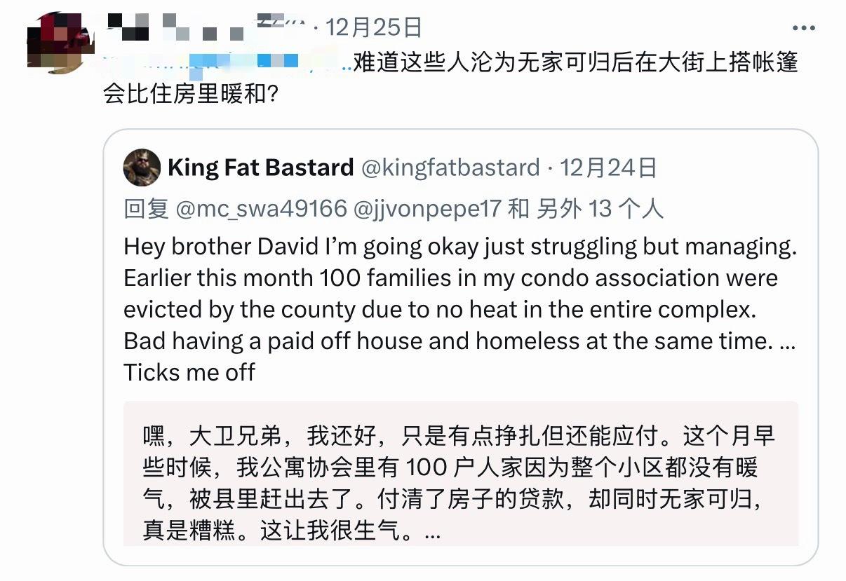 🔻这是那个“美国老爷们心善,见不得穷人住在没有暖气的屋子里”故事的后续:🔻这个哥们儿违抗了当地美国县政府下达的撤离令,给自己安装了一台柴油暖气,然后搬回去了。🔻他说:“整栋房子的温度平均在 65 华氏度左右(18摄氏度),虽然不算暖和,但至少还算舒适。我现在的心态是,让他们逮捕我吧。如果他们能让无家可归者睡在街上,那就应该允许我在没有供暖的情况下睡在自己的房子里。天气有点冷,但总比住在酒店强,住酒店花费可不少。”🔻他甚至不敢提起集体诉讼,因为:“许多人都在谈论这件事,但正如我一直告诉大家的,提起诉讼是与直觉相悖的,因为公寓业主协会本已资金紧张。这很可能只会导致业主协会破产,然后我们所有人都会失去自己的房屋。”🔻尽管他的房子已经付清了全款。🔻这就是真实的美国。美国许多孩子或出生就在斩杀线以下美国斩杀线现象热点现场海外新鲜事