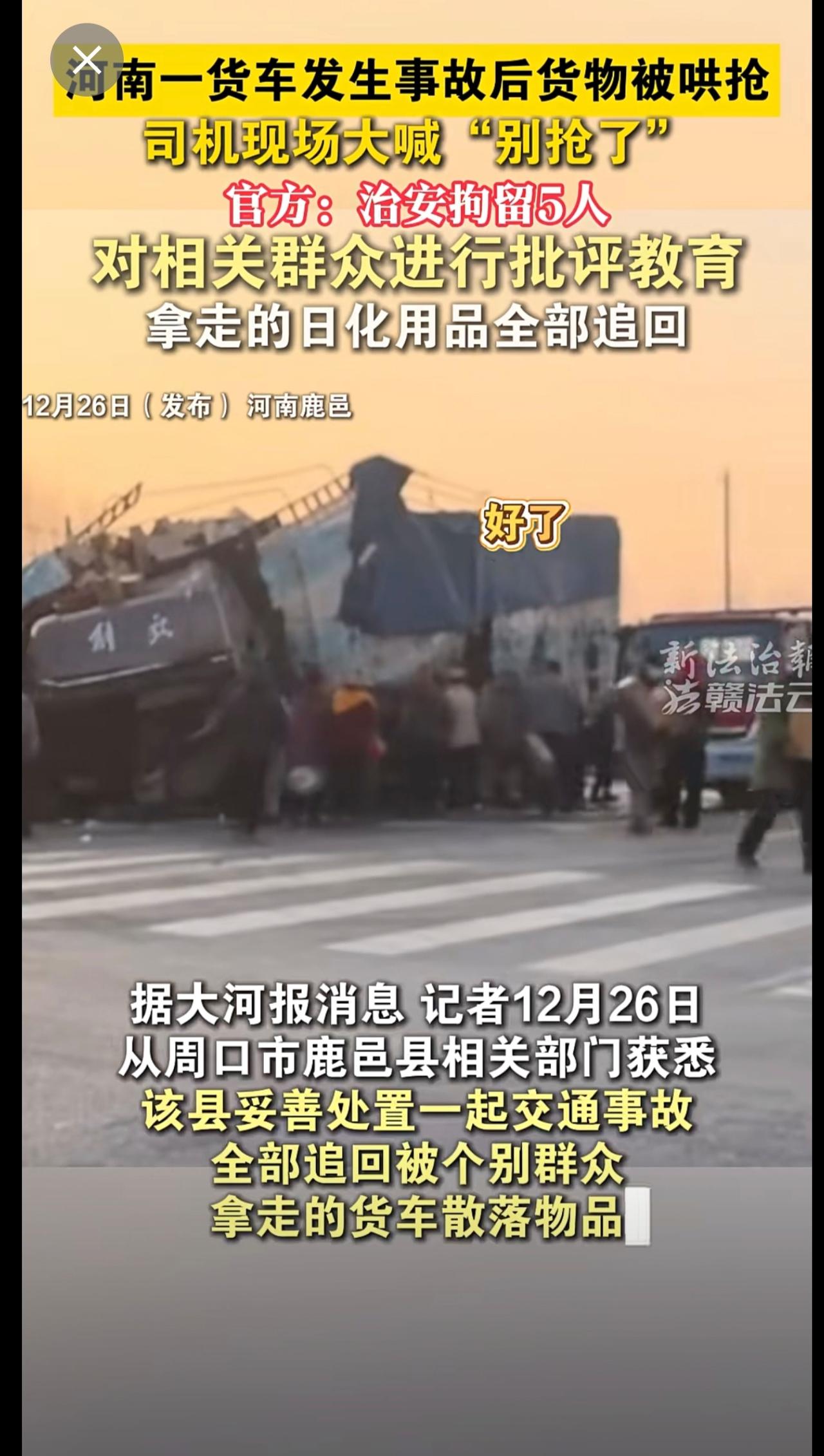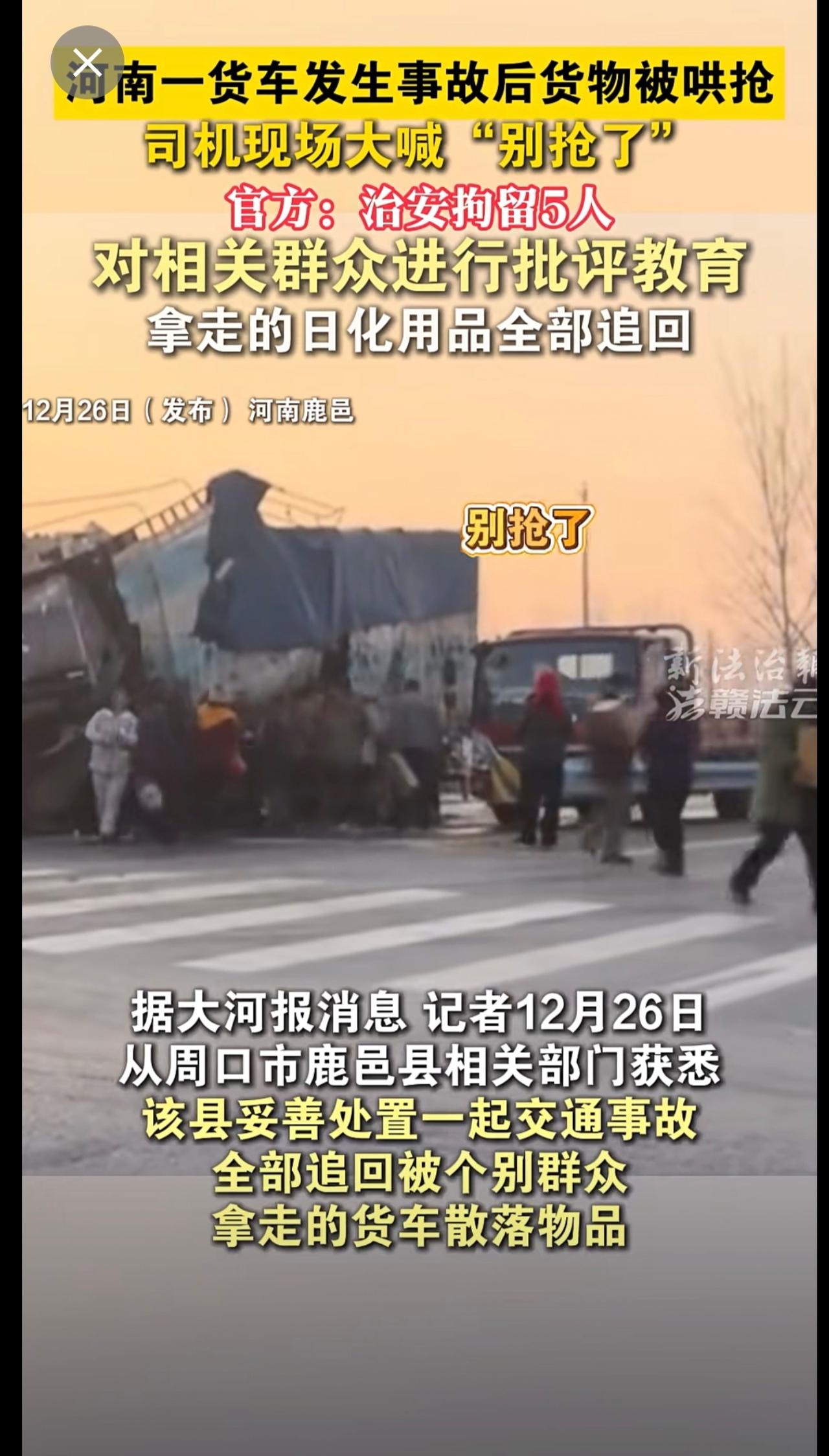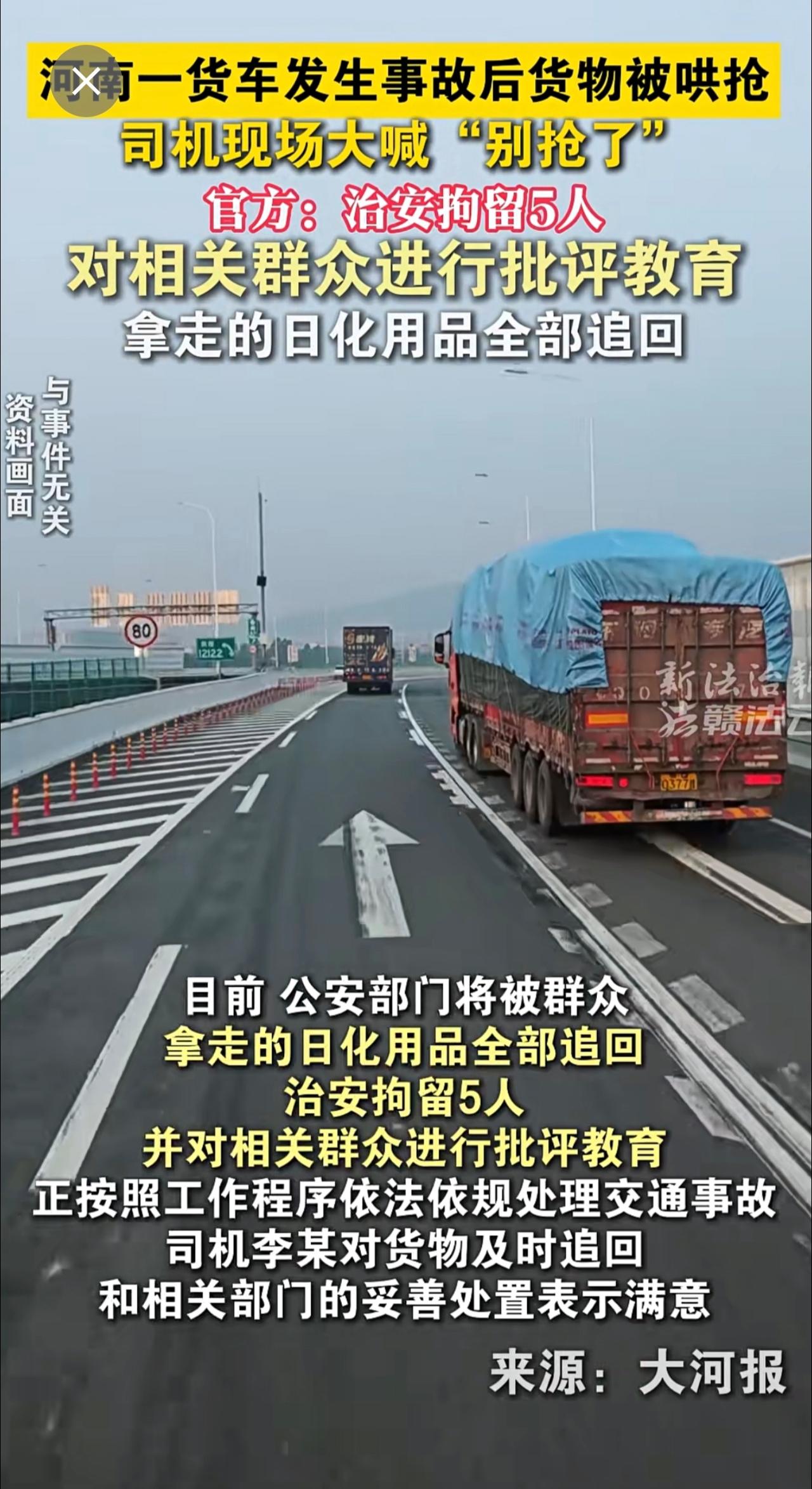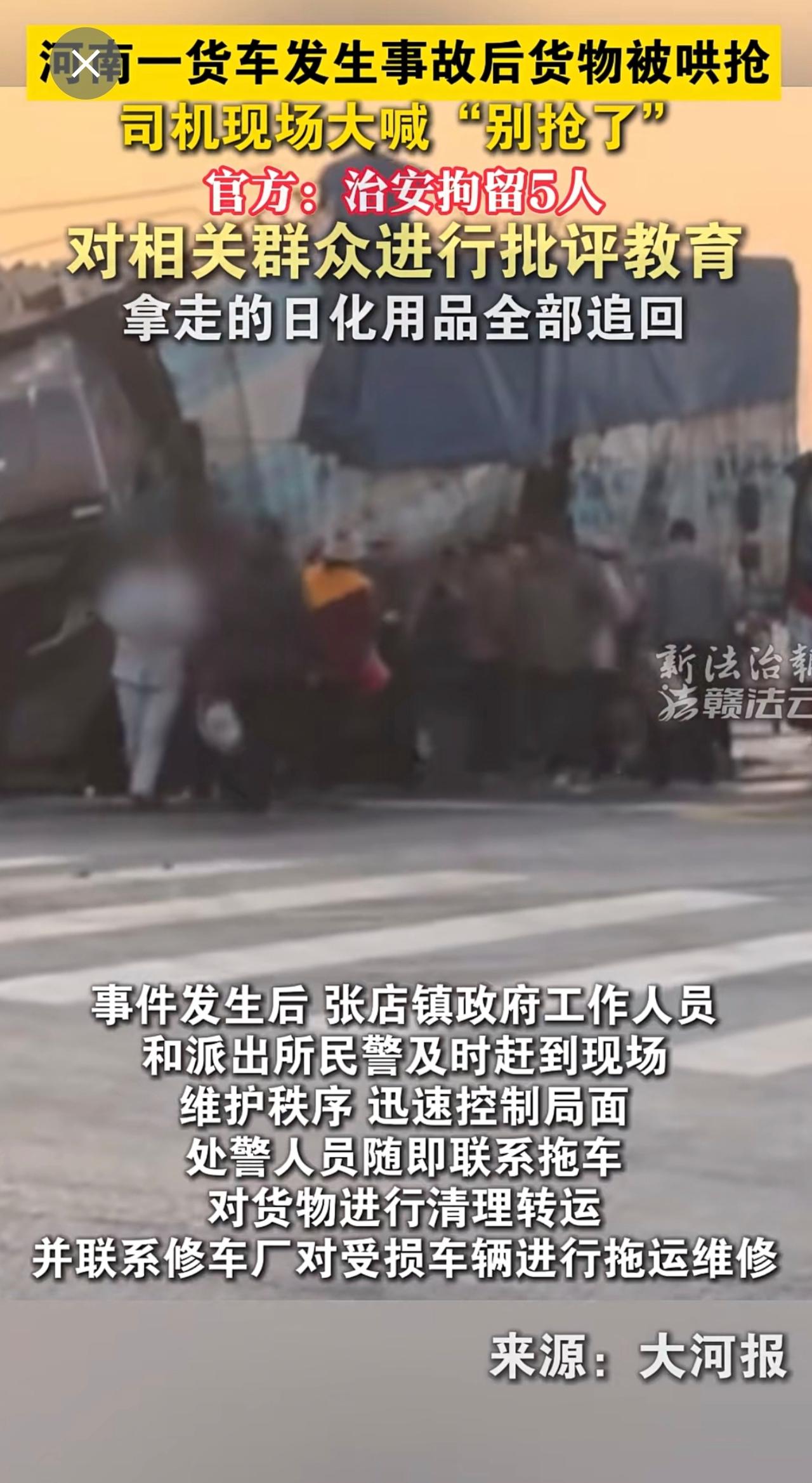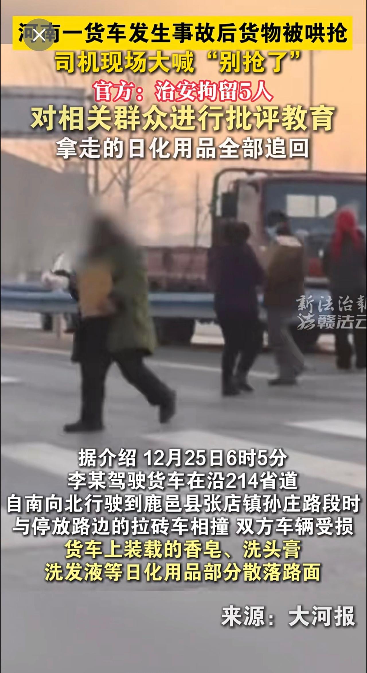 河南鹿邑一货车发生事故后货物被哄抢,官方:拘留5人,拿走的日化用品全部追回。(来源:新法治报·赣法云客户端 熊玮)哄抢 河南 交通事故