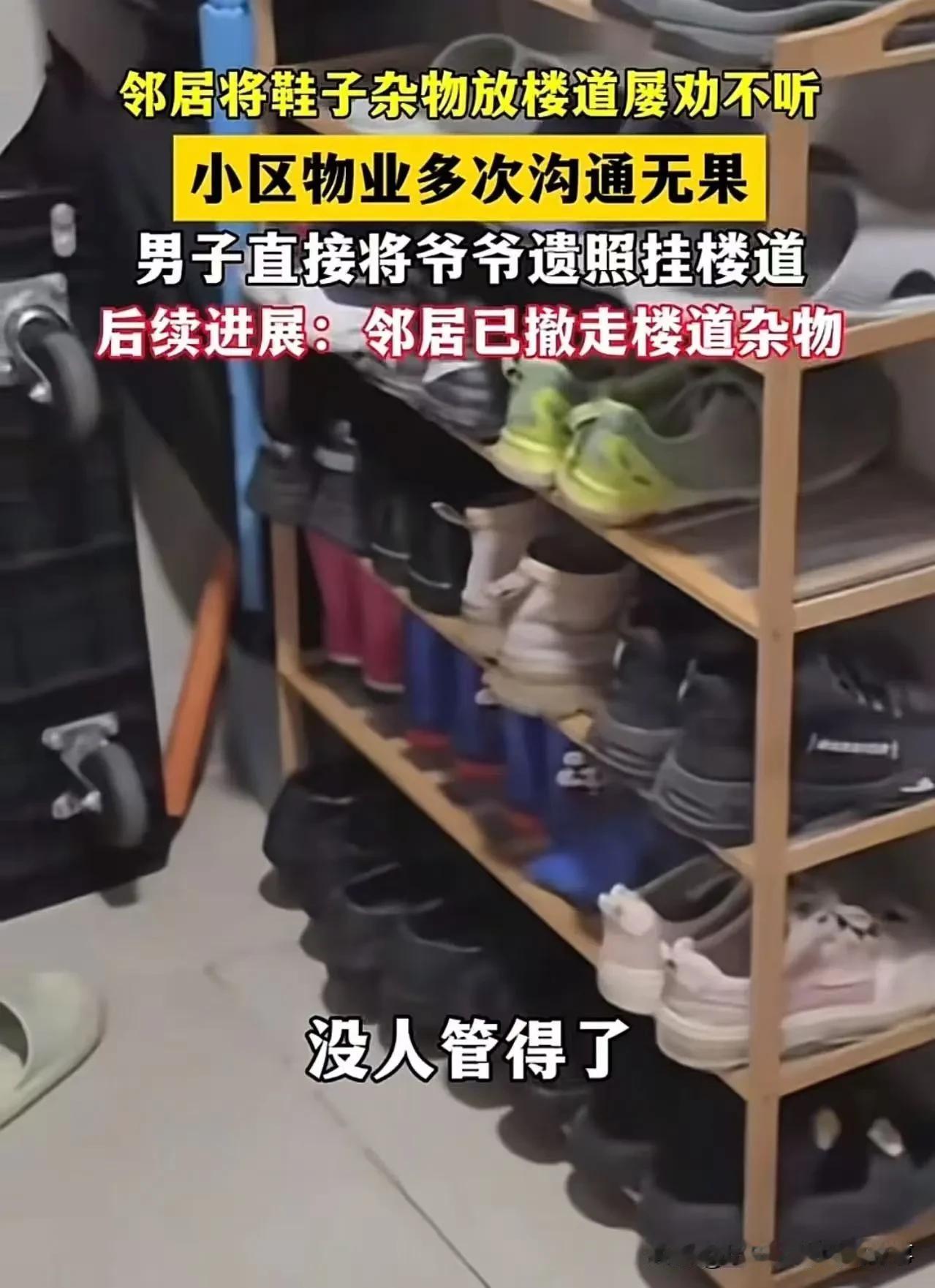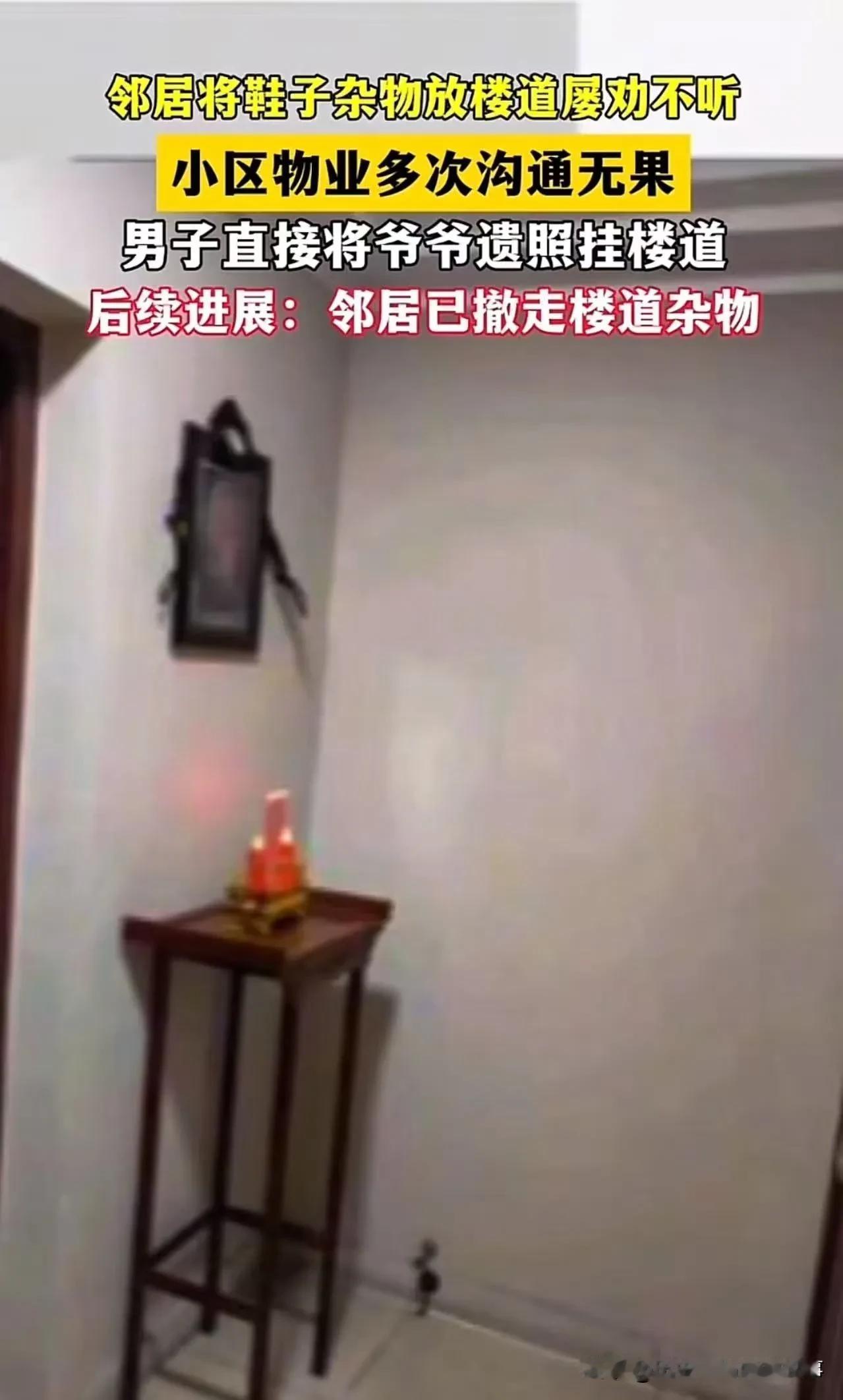 沟通三年!投诉五次!物业没用!邻居占楼道堵消防通道,母亲急救差点被耽误…男子挂爷爷遗照+白菊,邻居连夜清场!网友:恶人还得恶人磨,这招以毒攻毒绝了!住户异味纠纷 装修邻居投诉