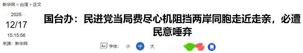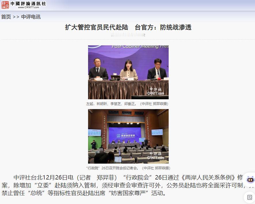就在刚刚 台当局突然宣布, 12月26日,台当局宣布,即日起要通过《两岸人民关系条例》修法,不光所有公务员赴大陆要被管控,连立委这种民选公职人员,去大陆都得先过“审查许可”这一关,要是敢违规去,直接罚200万到1000万新台币! 大家别被台当局的“安全话术”绕进去。根据台“行政院会”当天通过的修正草案,这次修法的管控范围扩得不是一点半点。以前只有11职等以上的高阶公务员或者涉密人员赴大陆才需要审批,现在连10职等以下的基层公务员,哪怕不接触任何机密,去大陆也得先找所属机关报备审批。 以前没被规范的立委,这次也被明确要求必须经过“内政部”牵头的联合审查会许可才能赴陆,相当于给民选公职人员的两岸往来上了一把锁。 除了事前审批,台当局还加了事后管控的条款。草案明确要求,民选公职人员只要在大陆接触了大陆的党政军相关机构或团体,回来之后必须把接触的时间、地点、事由甚至详细过程都上报,而且这些信息还要由权责机关公开披露。 对于那些涉及国家机密的人员,要是未经许可擅自赴陆,直接就罚200万到1000万新台币,这个罚款力度可比之前的规定严厉多了。 另外,像曾任“总统”“副总统”这类退离职的高阶官员,还被禁止参加任何大陆举办的、被台当局认定为“妨害国家尊严”的活动,否则也会被追责。 台当局给出的修法理由听起来冠冕堂皇,说是为了“完善公务员赴陆管制”,确保“国家忠诚义务”,防止所谓的“统战渗透”。但稍微琢磨一下就知道,这根本就是借“安全”之名行“阻扰交流”之实。 要知道全台军公教人员总共也就62万人,这次被纳入管制的只有2万8千人,占比不到4%,而且从今年1到10月的申请数据来看,86.3%的赴陆申请都被批准了,所谓的“安全风险”根本没有那么夸张。 而且这个修法时间点选得很微妙,正好是台立法机构通过对赖清德的弹劾案之后,民进党当局紧接着就推出这个修法,明眼人都能看出来,这更像是一种政治反击,借两岸议题转移岛内的政治压力。 这种修法本质上就是在逆两岸交流的历史潮流而行。咱们回顾一下,从1988年两岸开放探亲开始,两岸同胞花了几十年的时间才慢慢打破隔阂,人员往来从最初的探亲奔丧,发展到后来的学术交流、经贸合作、旅游观光,形成了密不可分的联系。 就像铭传大学的教授回忆的那样,以前带着学生去大陆参访,接待陆生来台交流,两岸年轻人坐在一起谈理想、谈未来,那种真诚的交流是多少政策都换不来的。 可现在台当局却一再收紧管控,先是把公务员探亲的亲属范围从四亲等缩到三亲等,现在又把立委和基层公务员都纳入严格审查,连基层警察去大陆旅游都要审批,否则就可能被记过,这不是在给两岸交流添堵是什么? 岛内的反对声音已经很明显了。国民党民代王鸿薇直接批评这种做法是“半戒严”,说是防渗透,其实就是在箝制公职人员的行动和言论自由。 她甚至直言,要是台当局真觉得两岸交流有那么大风险,不如直接宣布禁止所有民众赴陆,何必搞这种躲躲闪闪的政治操作。 还有嘉义大学的教授也直言,这种层层审批、严厉惩罚的规定,就是在“卡脖子”“穿小鞋”,目的就是让大家觉得赴陆交流太麻烦,干脆放弃这个念头。 基层公务员和教师更是怨声载道,有警察就吐槽,自己休假去大陆旅游还要被单位审查,稍不注意就可能丢工作,现在谁还愿意当公务员? 其实明眼人都清楚,两岸同胞走近走亲是民心所向,也是不可阻挡的历史趋势。民进党当局一再出台各种政策阻挠两岸交流,本质上是害怕两岸同胞增进了解,害怕民间交流稀释他们的“台独”思想。 就像国台办发言人朱凤莲之前指出的,民进党当局费尽心机阻挠限制台湾同胞来大陆,罗织罪名打压参与两岸交流的团体和个人,这种滥权妄为的行径最终只会遭到民意的唾弃。 毕竟,两岸同胞同根同源,彼此的交流合作是为了共同的发展和福祉,不是任何政治操作都能阻挡的。 现在这个修法草案还需要经过台立法机构的审议才能正式生效,但不管最终结果如何,民进党当局这种破坏两岸关系的企图已经暴露无遗。 对于两岸同胞来说,我们更应该看清这种政策的危害性,坚决维护两岸交流的良好局面。毕竟,只有两岸同胞多走动、多了解,才能消除隔阂、增进互信,这才是符合两岸共同利益的正确方向。 那些试图用行政手段阻挡两岸交流的做法,最终只会搬起石头砸自己的脚。