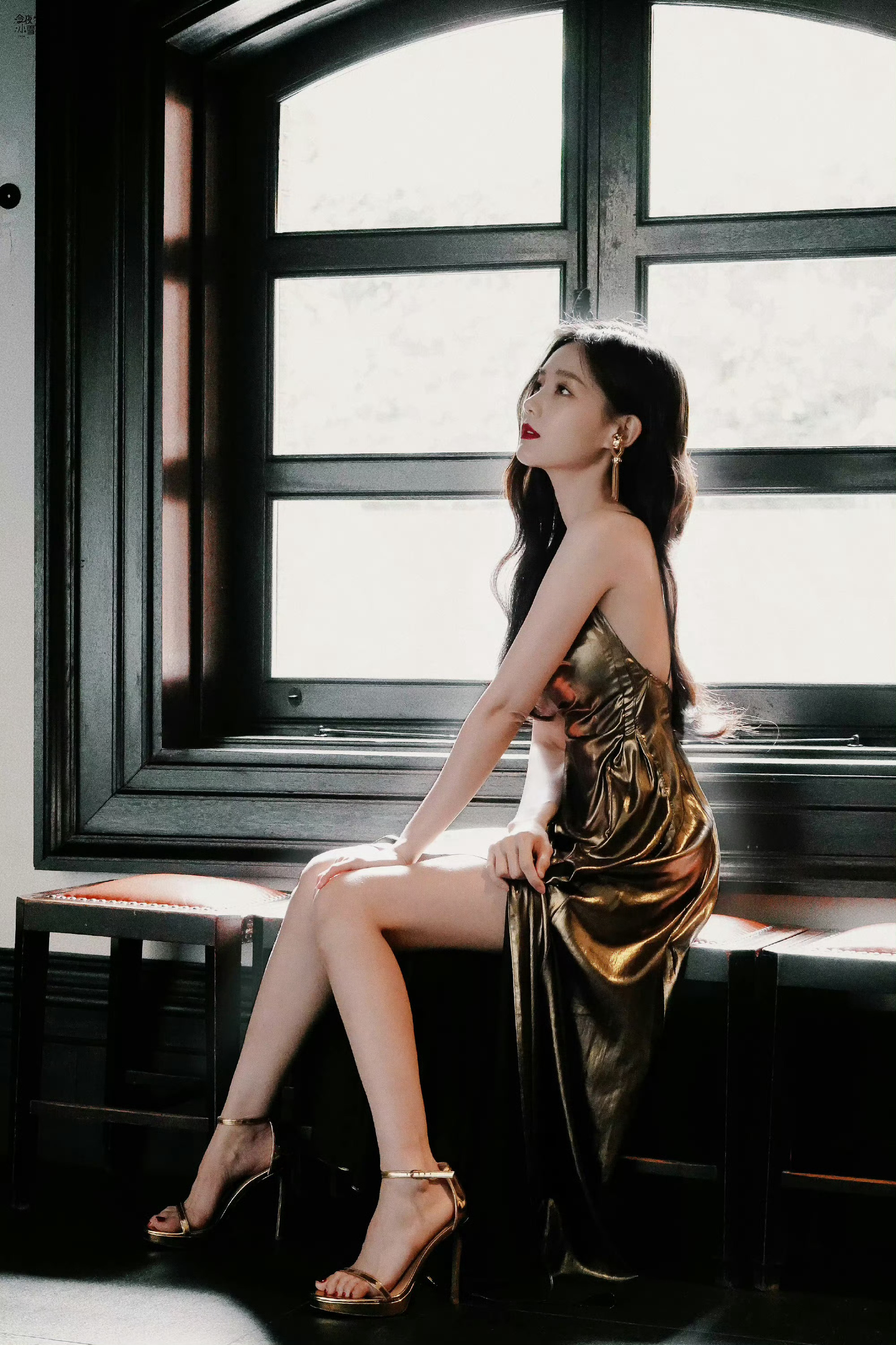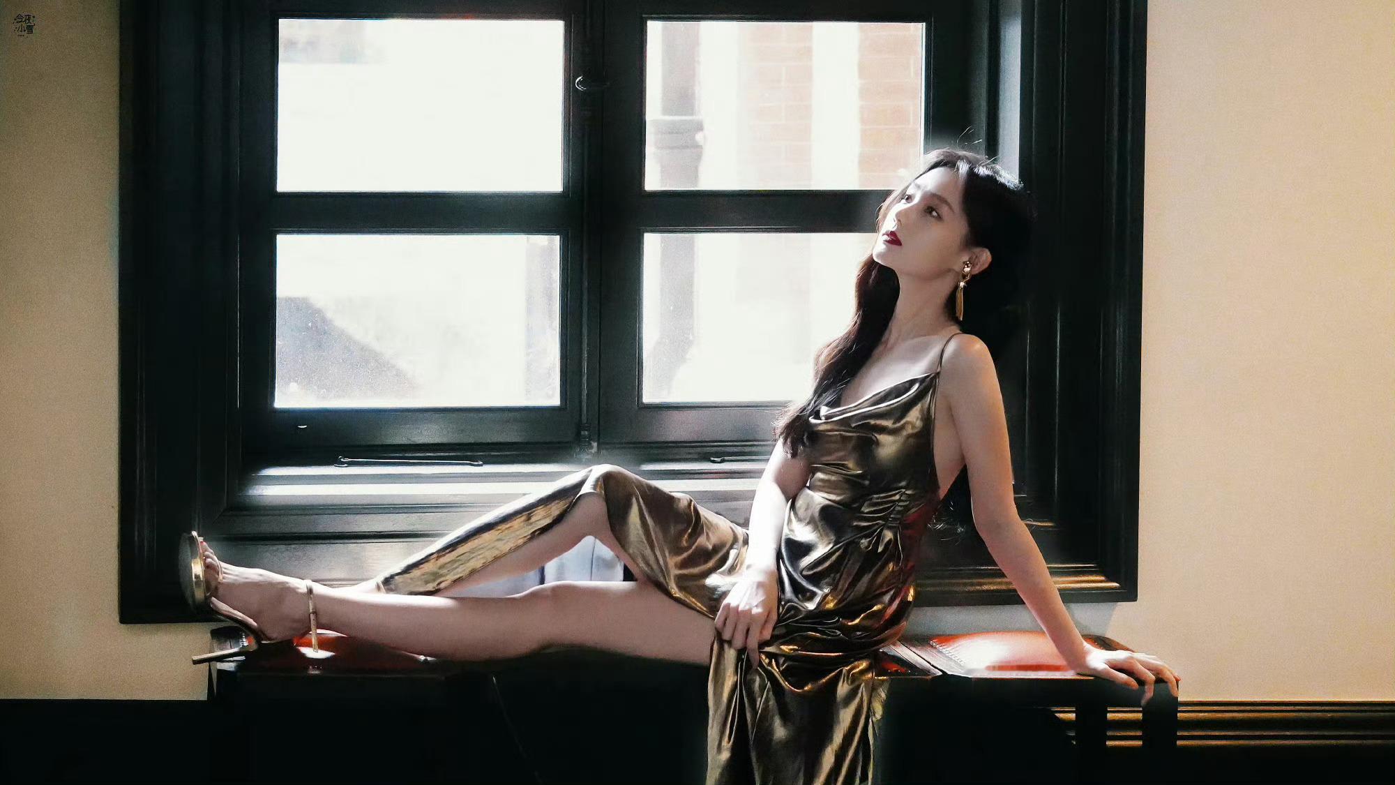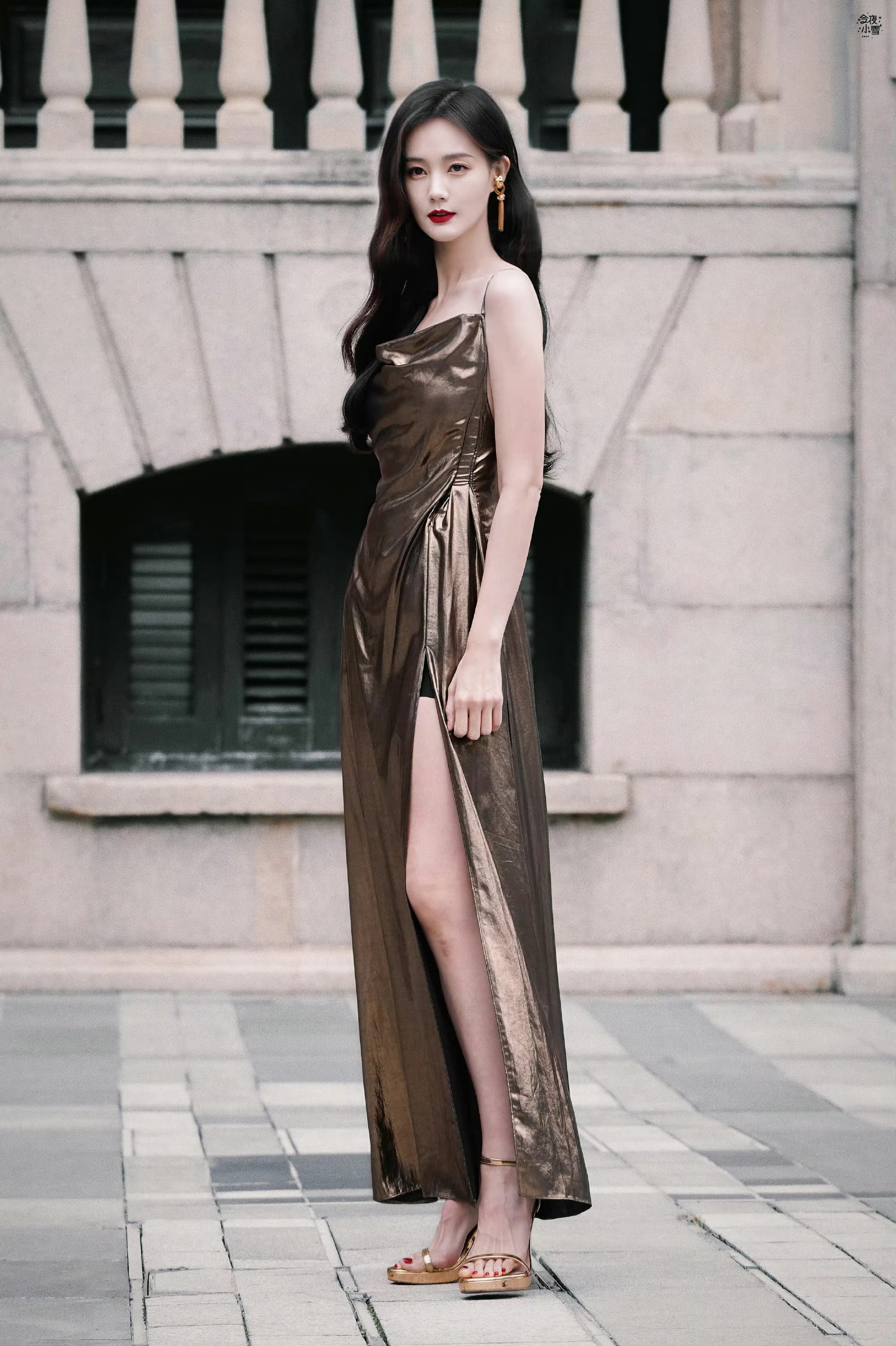 李一桐经典穿搭:金色长裙,美腿高跟,清冷而优雅。李一桐