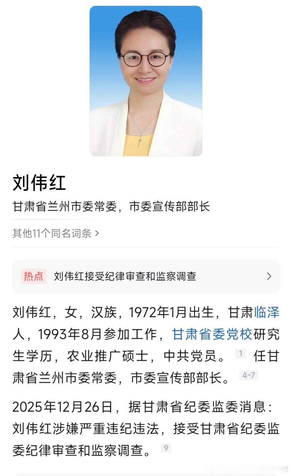 甘肃省兰州市委常委、宣传部部长刘伟红接受审查调查。