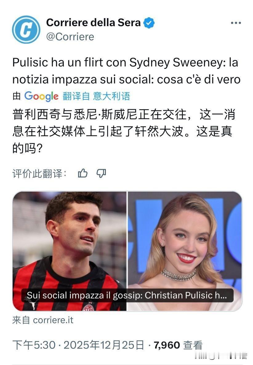 普利西奇女友今天刷屏了,貌似普利西奇有点吃不消啊。普利西奇本人,普利西奇的经纪人到现在为止没有出来辟谣,同样悉尼妹妹也没有辟谣,估计这个事情是真的。这个悉尼妹妹真的是很耐看啊,我就贴了一张我认为能贴出来的图,推特上今天有好多悉尼妹妹的鼻血图,真的是太羡慕普利西奇了。 克里斯蒂安·普利西奇与好莱坞女演员西德妮·斯威尼建立恋爱关系。对方是好莱坞近年崛起的1997年生女演员、制片人,凭借《亢奋》《白莲花度假村》两获黄金时段艾美奖提名。不过,这一传闻目前尚未得到官方媒体证实,当事人也未直接作出回应。 看完悉尼妹妹就理解了,为什么普利西奇最近人球结合能力渐入佳境,这是一个多好理解的事情,貌似也能想明白为啥普利西奇之前一直说本赛季是自己的巅峰赛季,有悉尼妹妹在未来状态如何确实不好说,但腿软可能在所难免。