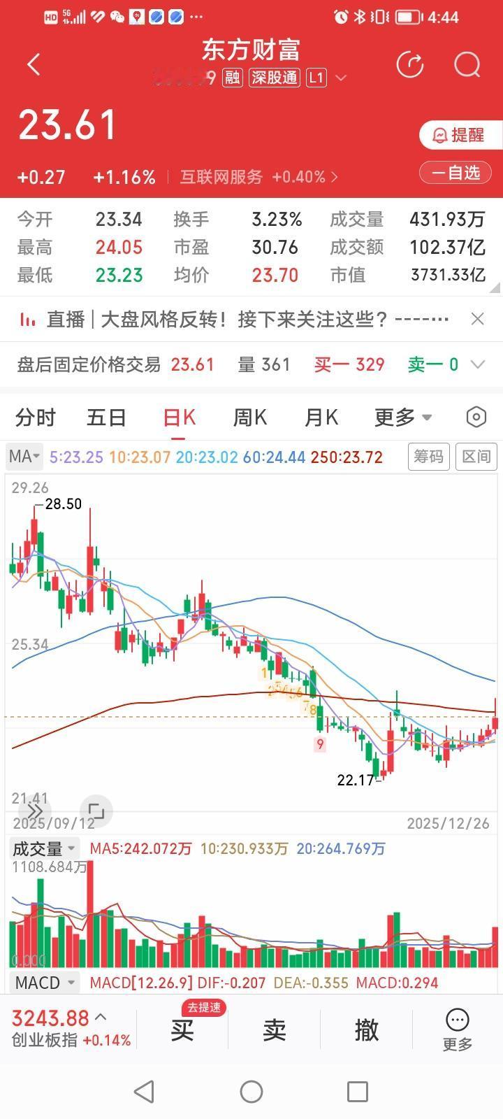 东方财富,今天收盘上涨1.16%,尽管涨幅不算大,似乎也算偏强势。 一是东方财富今天放量了,成交金额直接从昨天的50亿元放大到今天的102亿元,放大了一倍以上。量在价先,有量就有价,预示后市颇有想象空间。 二是东方财富股价今天冲上了年线,虽然没站稳,但有这点冲劲也值得表扬。 东方财富连年线都扭扭捏捏站不上去,实在有点尴尬。下周的收官行情东方财富能站上年线吗?